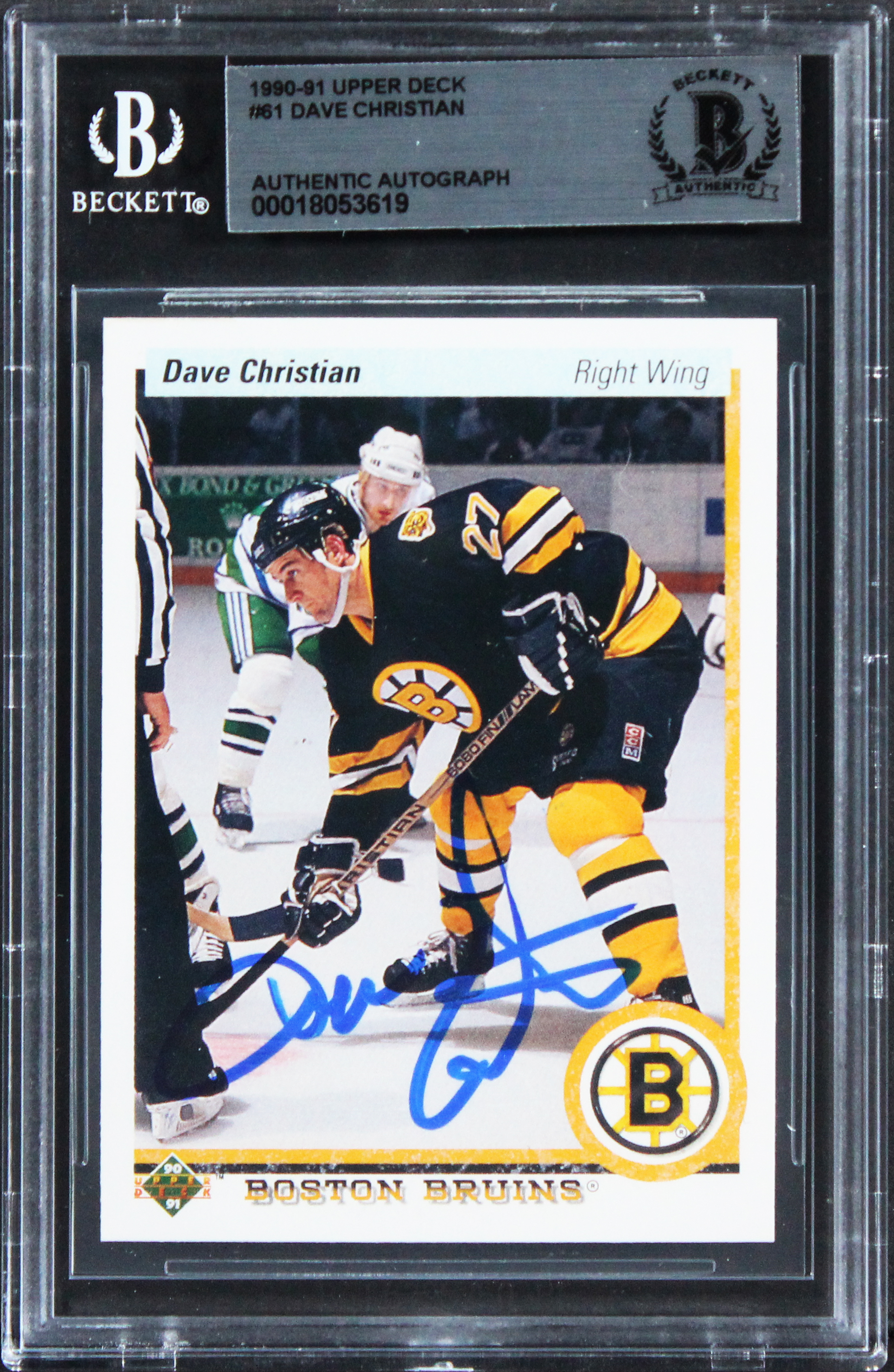 This Autographed 1990 Upper Deck #61 Card has been Personally Signed by Dave Christian of the Boston Bruins. This item is 100% Authentic, it comes slabbed and authenticated by Beckett Authentication Services. The authenticity can be verified on Beckett Authentication Services website.