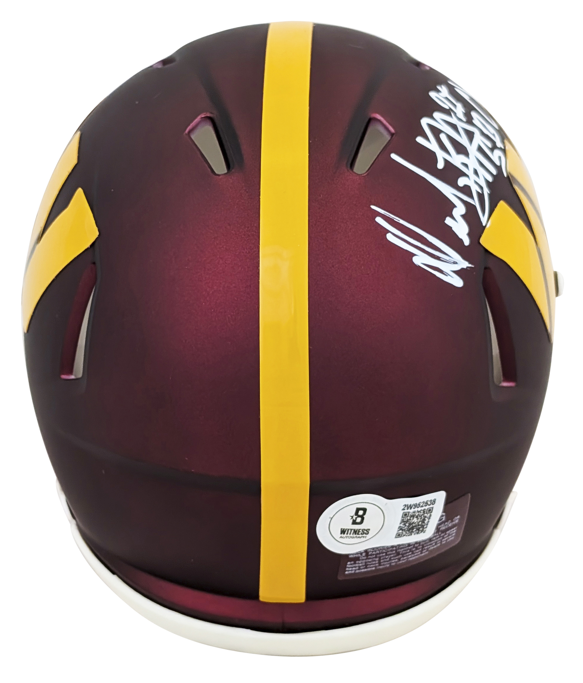 This Autographed Speed Mini Helmet with the inscription of "2x SB Champ" has been Personally Signed by Dexter Manley of the Washington Commanders. This item is 100% Authentic to include a hologram by Beckett Authentication Services. This item will come with an affixed Beckett Authentication Services (BAS) authentication sticker, which includes a scannable QR code to verify authenticity. Please note that Beckett no longer provides serial-numbered COA cards, and the attached BAS sticker will serve as the complete authentication for this item. This is a BAS Witnessed Protection Program item which means a Beckett Authentication Service representative was present when this item was being signed. We conducted an autograph signing with Dexter Manley where multiples of the same item were signed. While the photographs are representative of this item, the size, placement and strength of the signature may vary. Each item is hand signed, therefore, each autograph is unique. This item can be verified through BAS Witnessed.