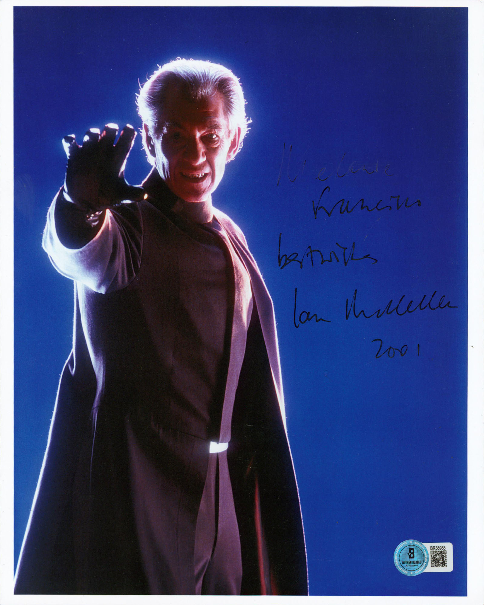 This Autographed 8.5x10.5 Vertical Photo with the inscription of "Best Wishes" has been Personally Signed by Ian McKellen of X-Men. This item is 100% Authentic to include a hologram by Beckett Authentication Services. This item will come with an affixed Beckett Authentication Services (BAS) authentication sticker, which includes a scannable QR code to verify authenticity. Please note that Beckett no longer provides serial-numbered COA cards, and the attached BAS sticker will serve as the complete authentication for this item. The authenticity can be verified on Beckett Authentication Services website. A personalization has been removed. Normal handling wear is present.