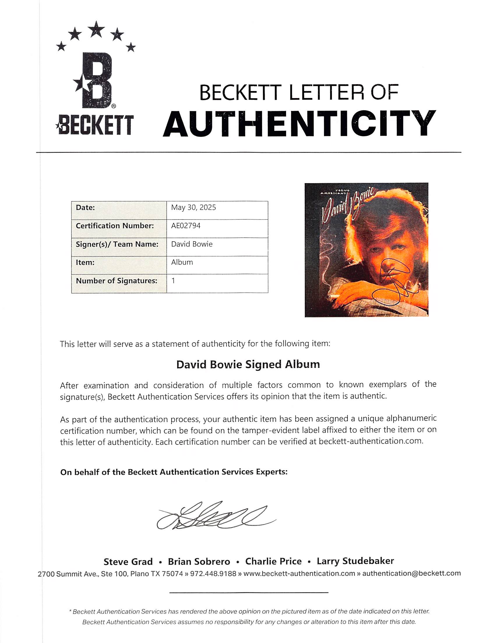 This Autographed Young Americans Album Cover W/ Vinyl has been Personally Signed by David Bowie. This item is 100% Authentic to include a Certificate of Authenticity (COA) / hologram by Beckett Authentication Services. The authenticity can be verified on Beckett Authentication Services website. There is some minor wear due to age and handling. Please refer to photos for item's condition prior to purchase.