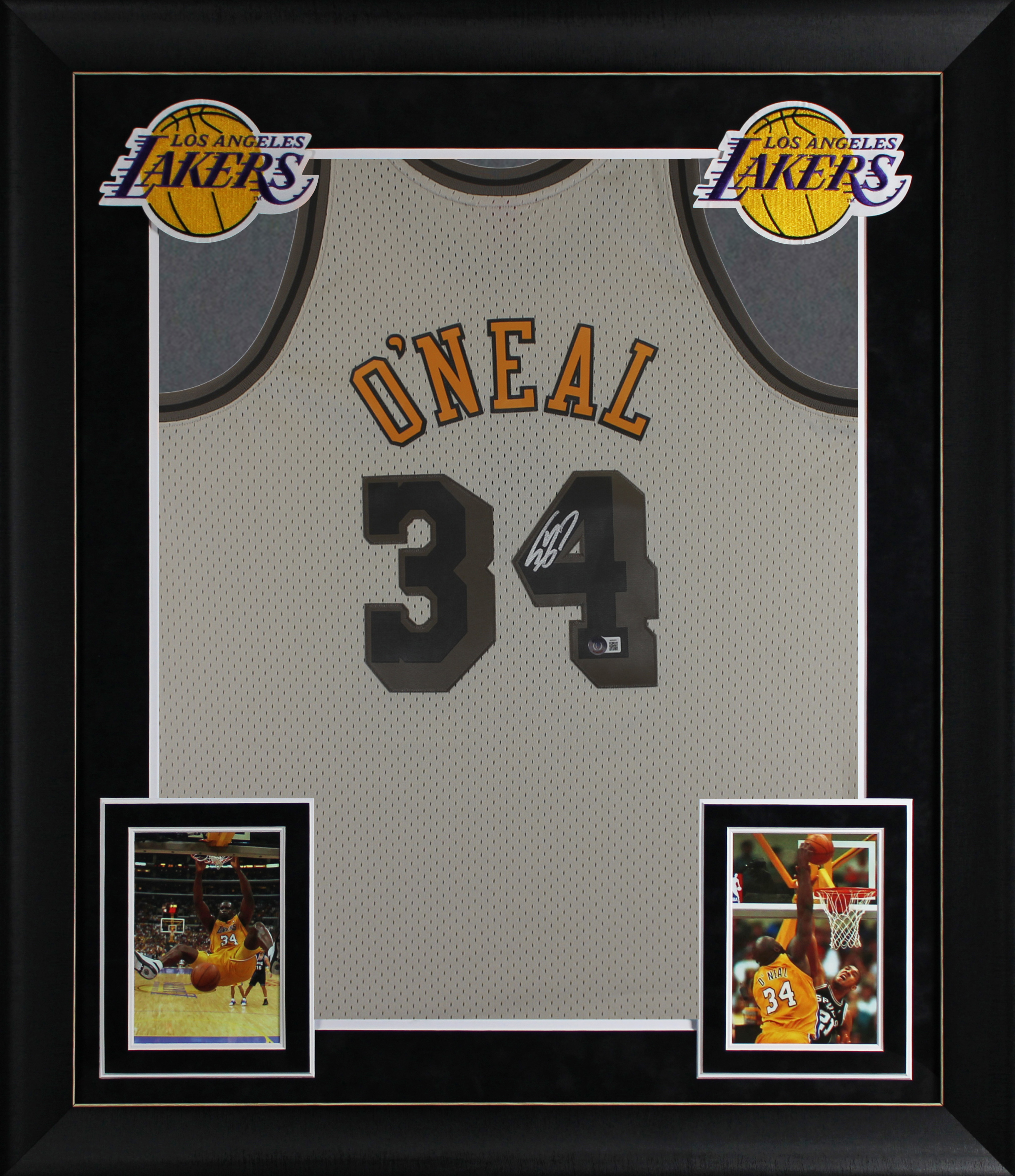 This Autographed Light Grey Mitchell & Ness 1996-97 Hardwood Classics Swingman Framed Jersey has been Personally Signed by Shaquille O'Neal of the Los Angeles Lakers. This item is 100% Authentic to include a hologram by Beckett Authentication Services. This item will come with an affixed Beckett Authentication Services (BAS) authentication sticker, which includes a scannable QR code to verify authenticity. Please note that Beckett no longer provides serial-numbered COA cards, and the attached BAS sticker will serve as the complete authentication for this item. This is a BAS Witnessed Protection Program item which means a Beckett Authentication Service representative was present when this item was being signed. We conducted an autograph signing with Shaquille O'Neal where multiples of the same item were signed. While the photographs are representative of this item, the size, placement and strength of the signature may vary. Each item is hand signed, therefore, each autograph is unique. This item can be verified through BAS Witnessed. This item has been professionally framed to overall dimensions of approximately 32 x 37 inches. This is a X-Large sized Framed Jersey. This jersey will be framed to order, it will take approximately 3-4 business days from purchase date for it to ship.