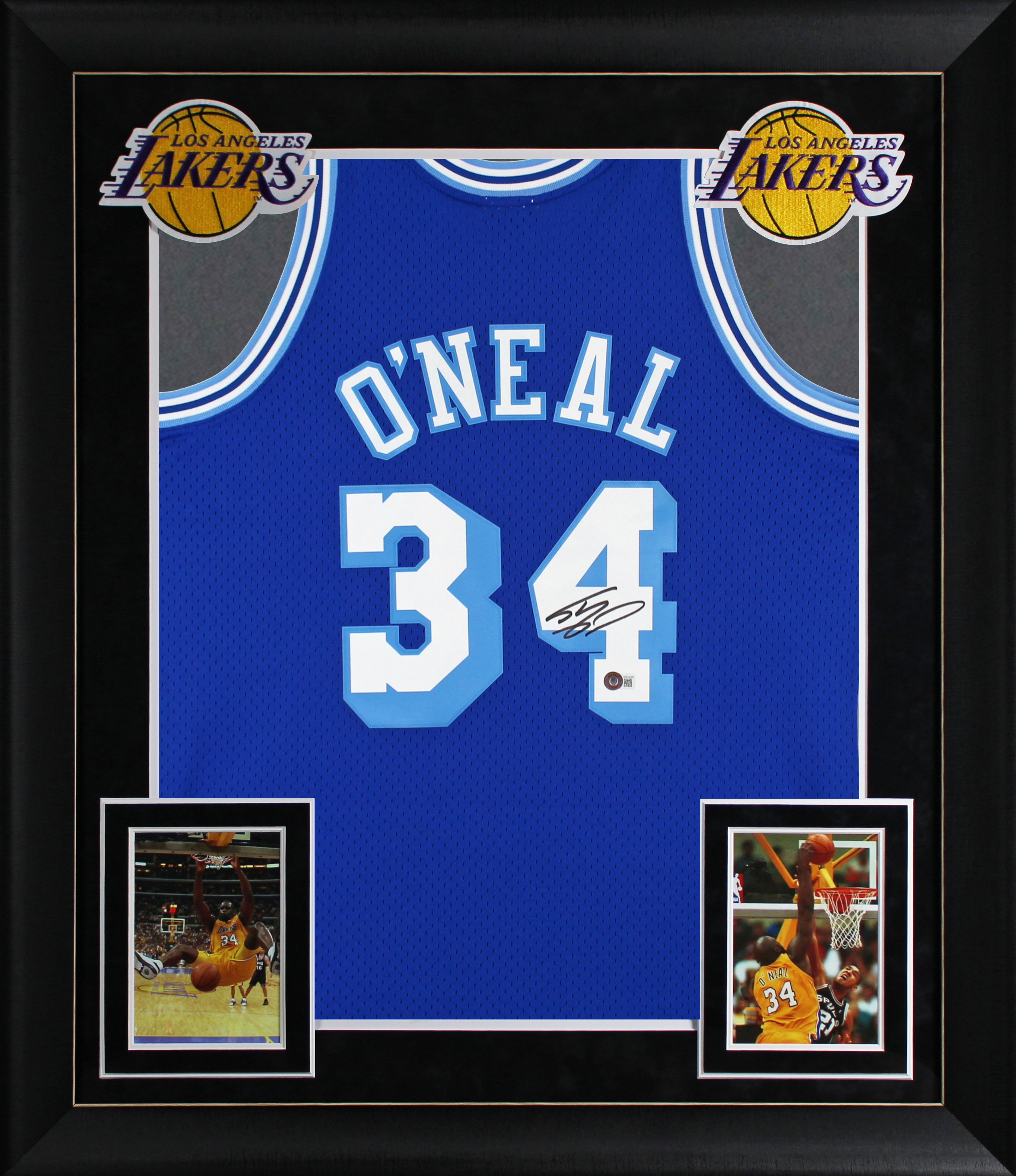 This Autographed Blue 1996-97 Throwback Mitchell & Ness Hardwood Classics Framed Jersey has been Personally Signed by Shaquille O'Neal of the Los Angeles Lakers. This item is 100% Authentic to include a hologram by Beckett Authentication Services. This item will come with an affixed Beckett Authentication Services (BAS) authentication sticker, which includes a scannable QR code to verify authenticity. Please note that Beckett no longer provides serial-numbered COA cards, and the attached BAS sticker will serve as the complete authentication for this item. This is a BAS Witnessed Protection Program item which means a Beckett Authentication Service representative was present when this item was being signed. We conducted an autograph signing with Shaquille O'Neal where multiples of the same item were signed. While the photographs are representative of this item, the size, placement and strength of the signature may vary. Each item is hand signed, therefore, each autograph is unique. This item can be verified through BAS Witnessed. This item has been professionally framed to overall dimensions of approximately 32 x 37 inches. This is a X-Large sized Framed Jersey. This jersey will be framed to order, it will take approximately 3-4 business days from purchase date for it to ship.