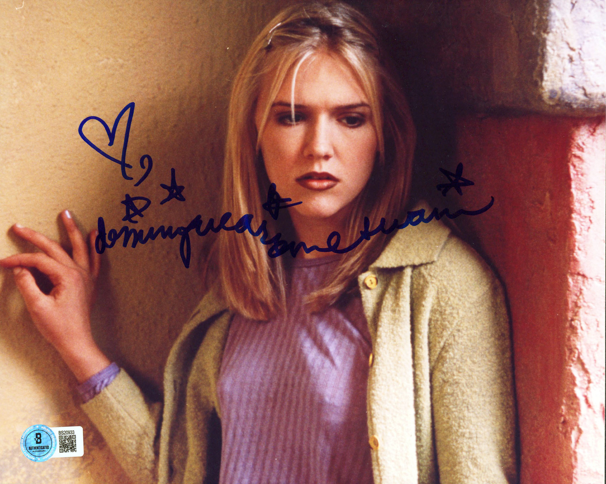 This Autographed Horizontal 8x10 Photo has been Personally Signed by Dominique Swain of Lolita. This item is 100% Authentic to include a hologram by Beckett Authentication Services. This item will come with an affixed Beckett Authentication Services (BAS) authentication sticker, which includes a scannable QR code to verify authenticity. Please note that Beckett no longer provides serial-numbered COA cards, and the attached BAS sticker will serve as the complete authentication for this item. The authenticity can be verified on Beckett Authentication Services website. Normal handling wear is present.