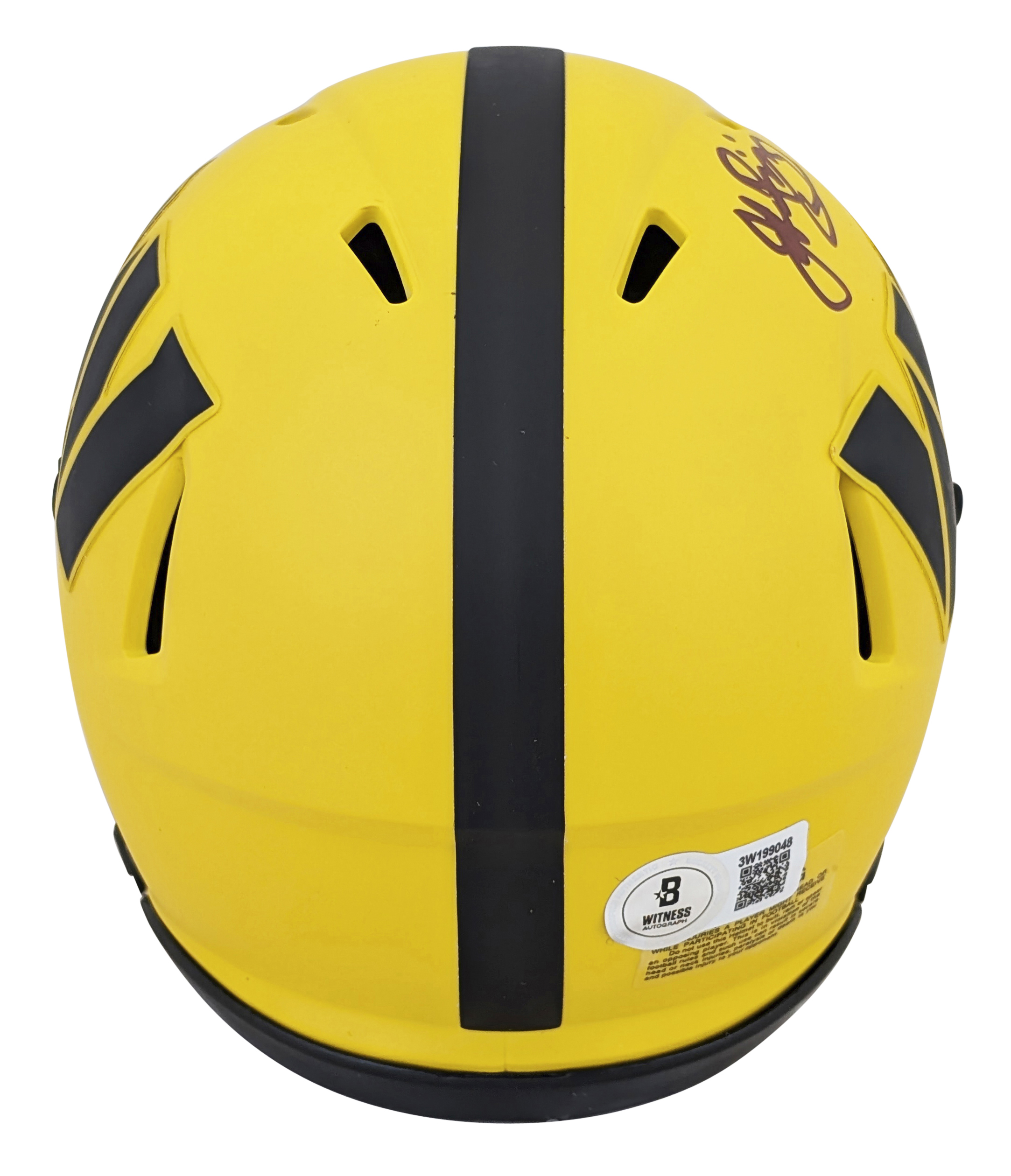 This Autographed Alternate Rave Speed Mini Helmet has been Personally Signed by John Riggins of the Washington Commanders. This item is 100% Authentic to include a hologram by Beckett Authentication Services. This item will come with an affixed Beckett Authentication Services (BAS) authentication sticker, which includes a scannable QR code to verify authenticity. Please note that Beckett no longer provides serial-numbered COA cards, and the attached BAS sticker will serve as the complete authentication for this item. This is a BAS Witnessed Protection Program item which means a Beckett Authentication Service representative was present when this item was being signed. We conducted an autograph signing with John Riggins where multiples of the same item were signed. While the photographs are representative of this item, the size, placement and strength of the signature may vary. Each item is hand signed, therefore, each autograph is unique. This item can be verified through BAS Witnessed.