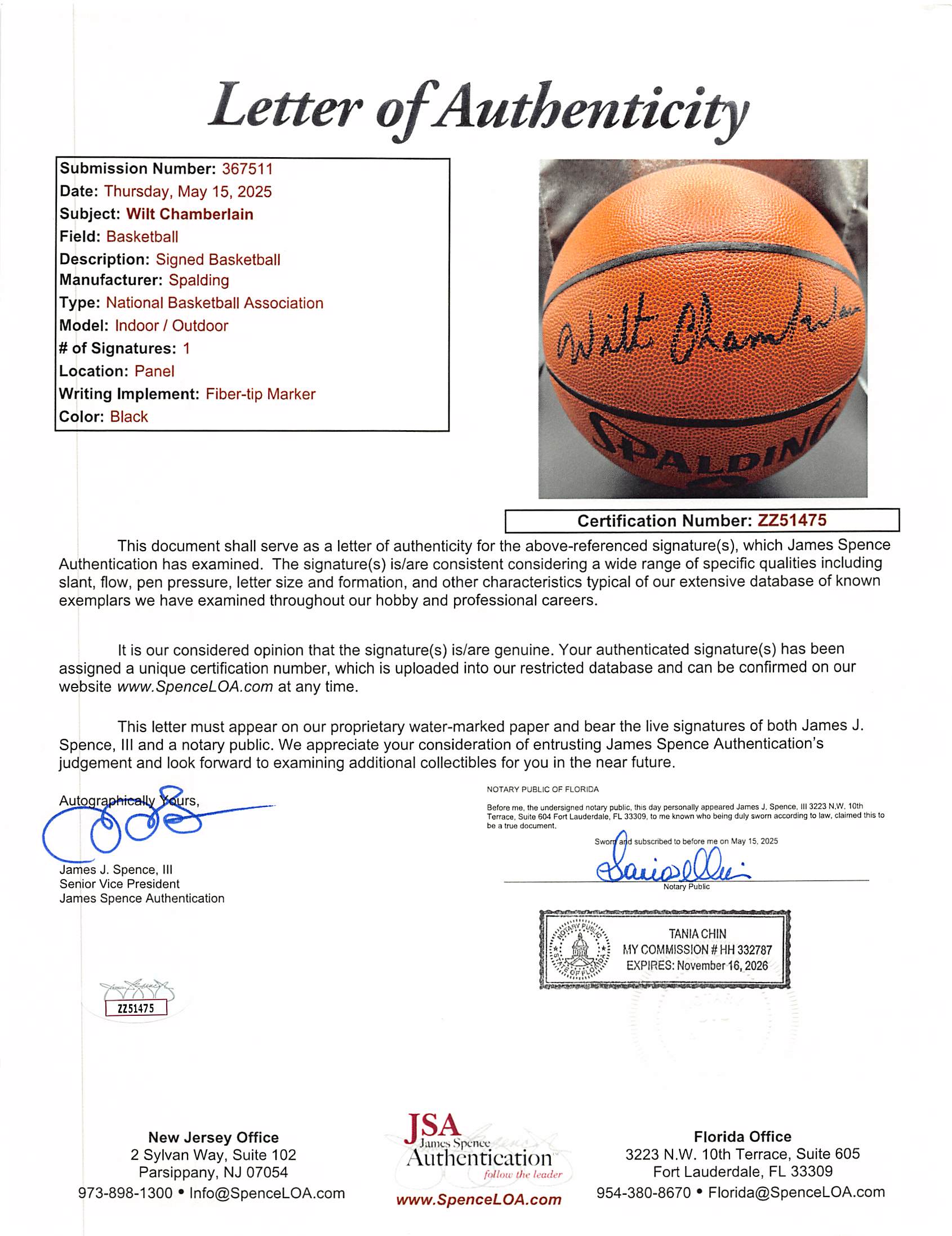 This Autographed Spalding Indoor/Outdoor Basketball has been Personally Signed by Wilt Chamberlain of the Los Angeles Lakers. This item is 100% Authentic to include a Certificate of Authenticity (COA) / hologram by JSA. The authenticity can be verified on JSA website.