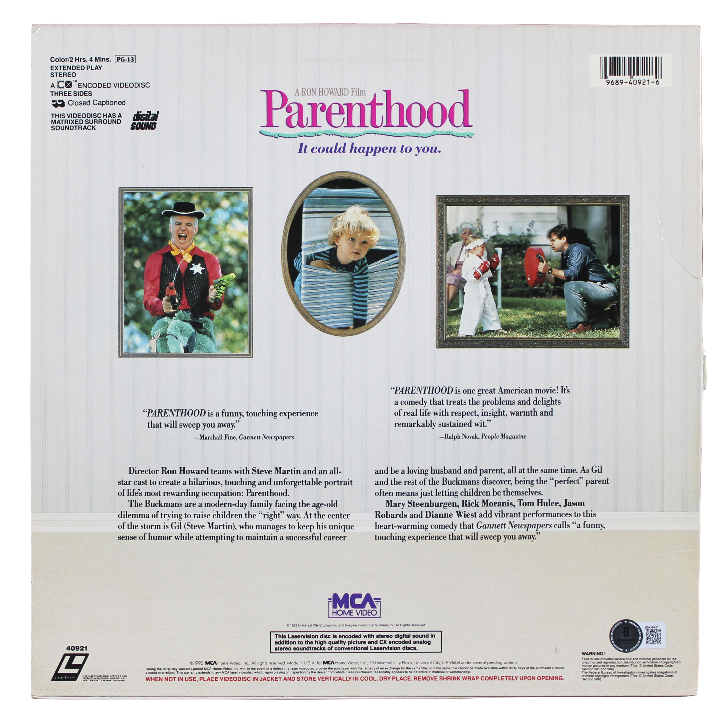 This Autographed Parenthood Laserdisc Cover w/o Disk has been Personally Signed by Steve Martin of Parenthood. This item is 100% Authentic to include a hologram by Beckett Authentication Services. This item will come with an affixed Beckett Authentication Services (BAS) authentication sticker, which includes a scannable QR code to verify authenticity. Please note that Beckett no longer provides serial-numbered COA cards, and the attached BAS sticker will serve as the complete authentication for this item. The authenticity can be verified on Beckett Authentication Services website. This laserdisc cover has some minor edgewear and creasing due to age and handling. Please refer to photos for item's condition prior to purchase.