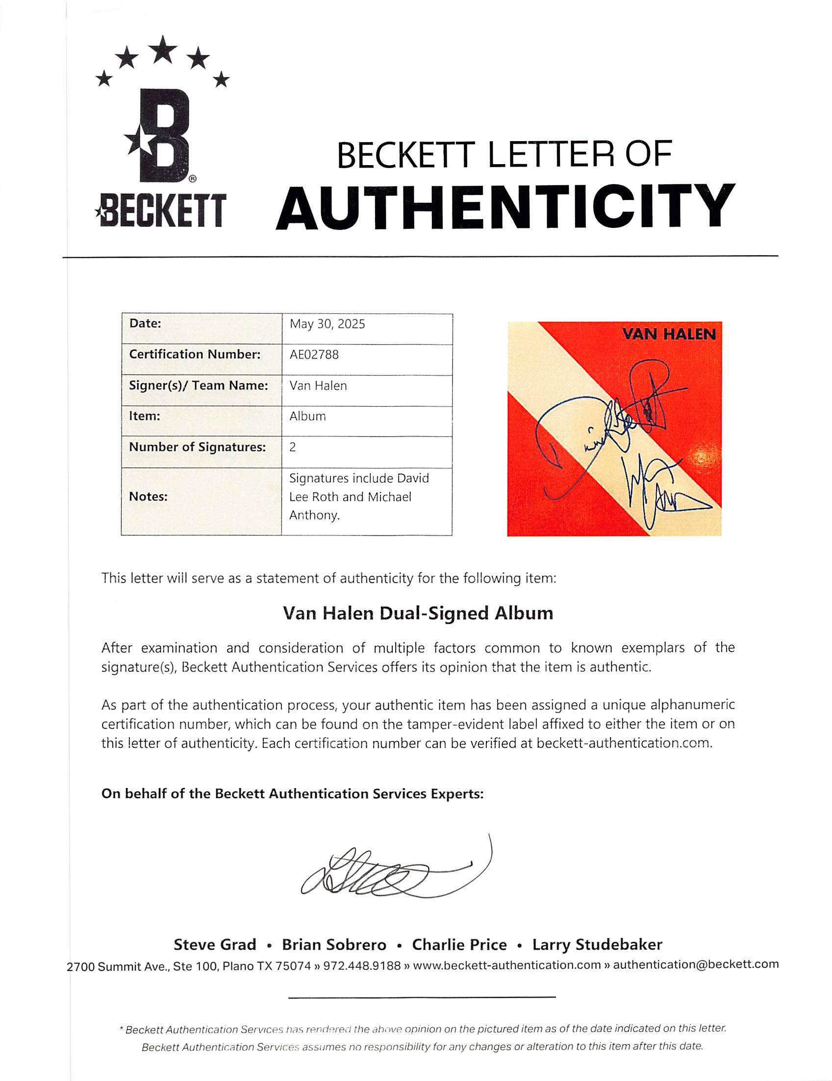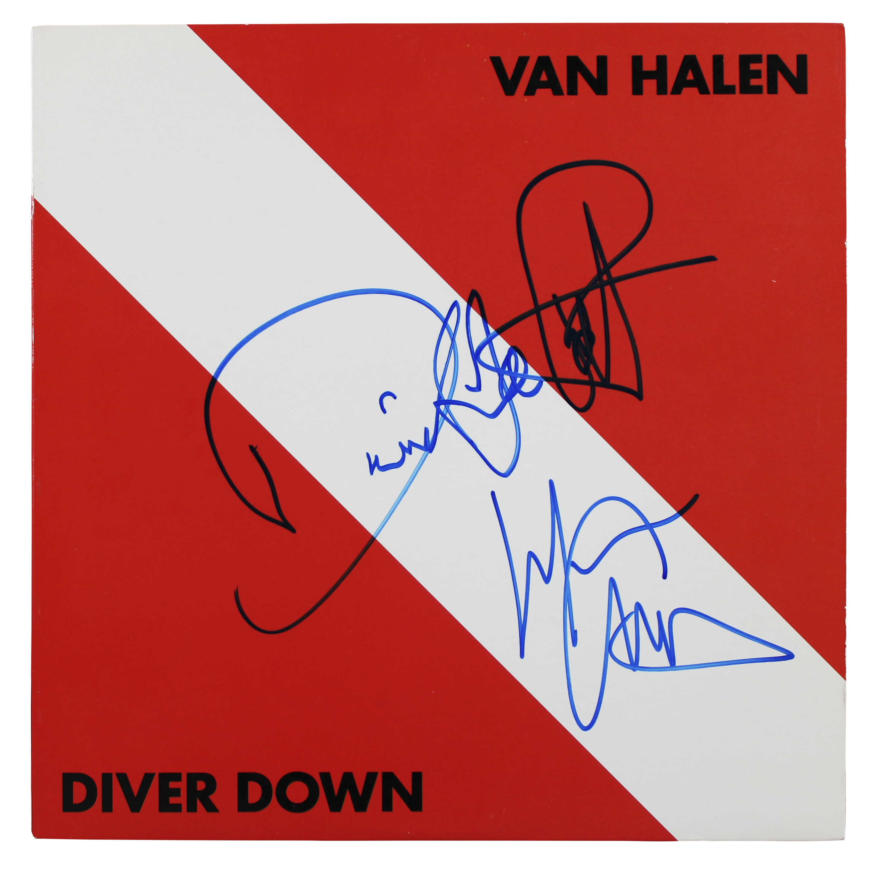This Autographed Diver Down Album Cover W/ Vinyl has been Personally Signed by David Lee Roth & Michael Anthony of Van Halen. This item is 100% Authentic to include a Certificate of Authenticity (COA) / hologram by Beckett Authentication Services. The authenticity can be verified on Beckett Authentication Services website. There is some minor wear due to age and handling. Please refer to photos for item's condition prior to purchase.