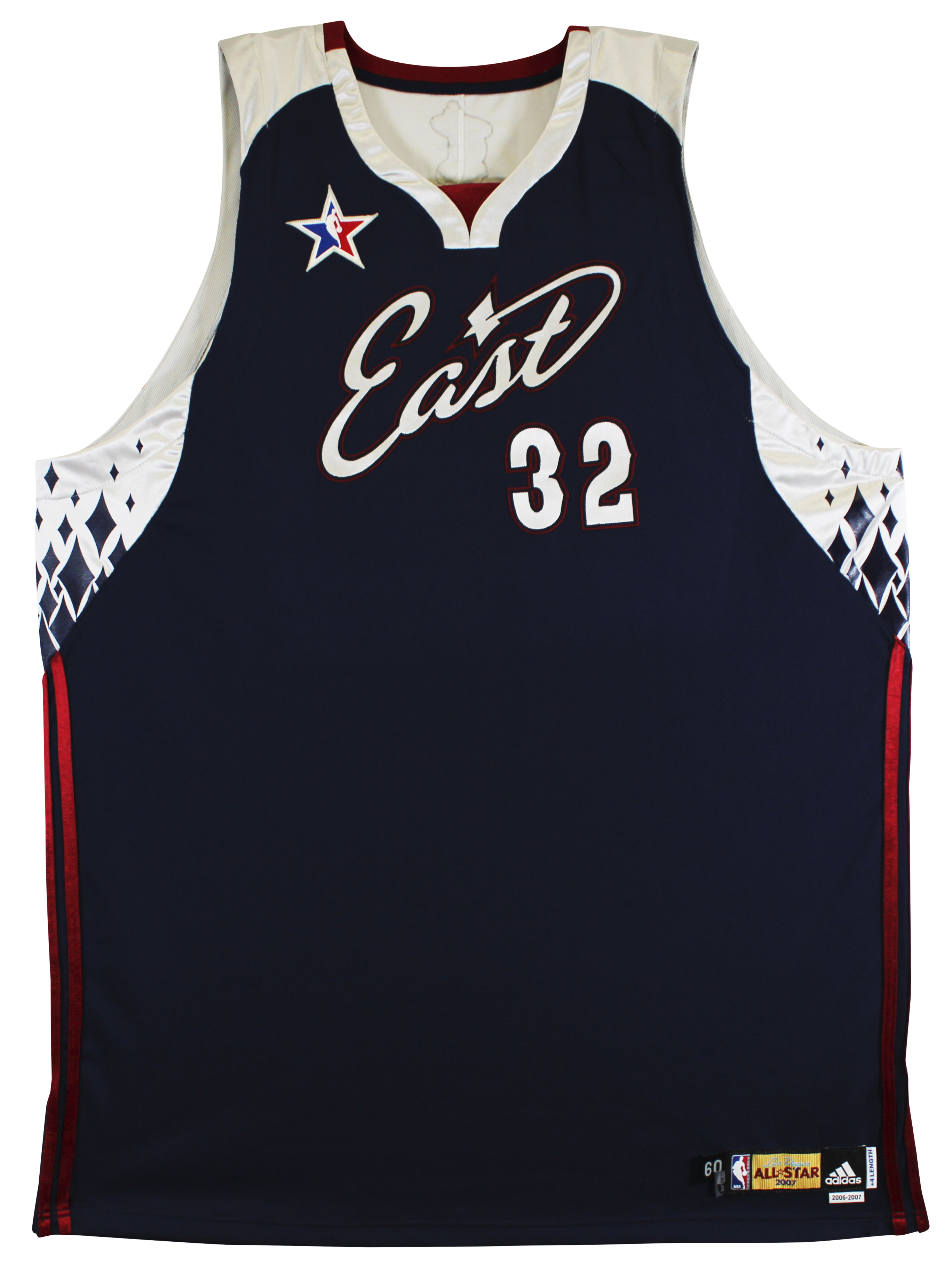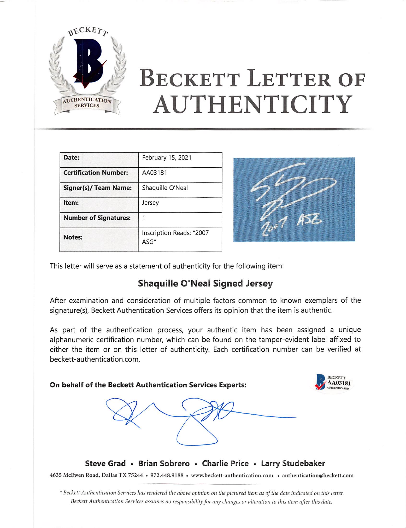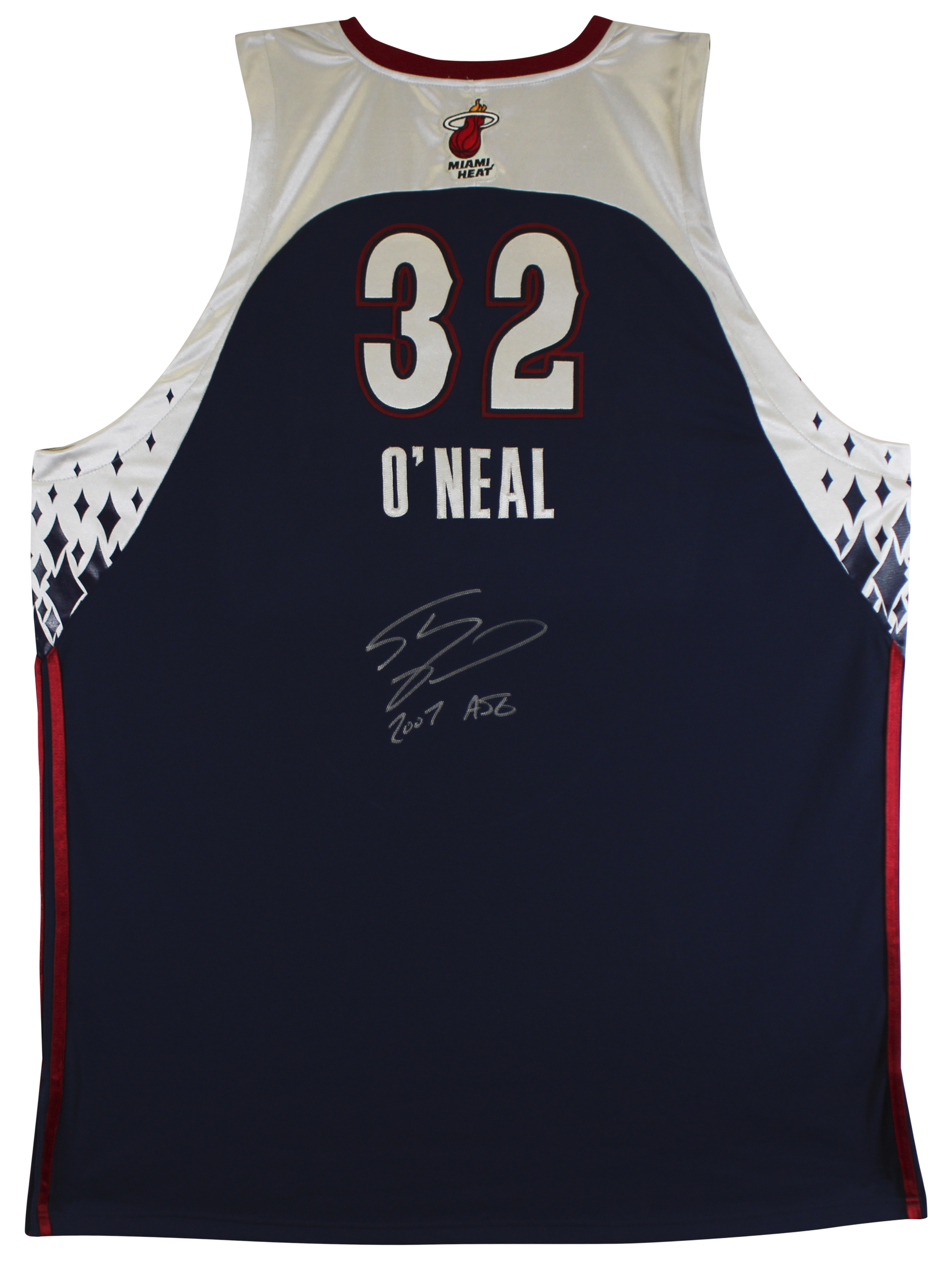 This Autographed Team Issued Navy 2007 NBA All-Star Game Size 60 +4 Length Adidas Jersey with the inscription of "2007 ASG" has been Personally Signed by Shaquille O'Neal of the Miami Heat . This item is 100% Authentic to include a Certificate of Authenticity (COA) / hologram by Beckett Authentication Services. The authenticity can be verified on Beckett Authentication Services website. This jersey will come with a Beckett Letter of Authenticity for the signature, a Letter of Provenance from Shaquille O'Neal, & and Letter of Authenticity from Sports Investors to verify its authenticity & provenance.