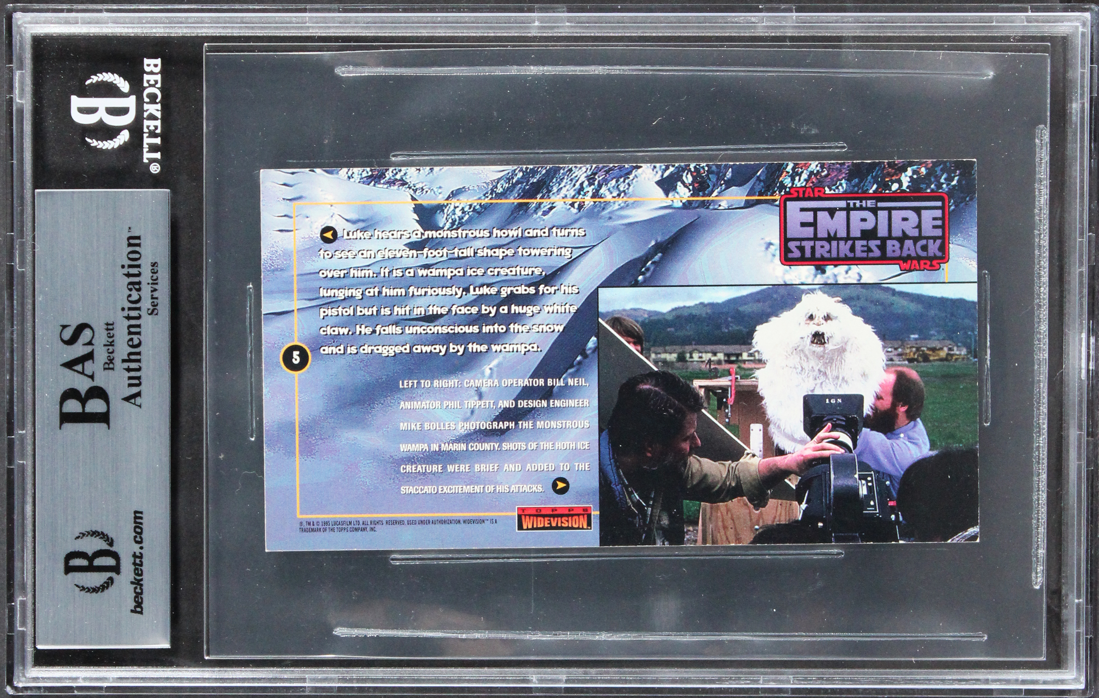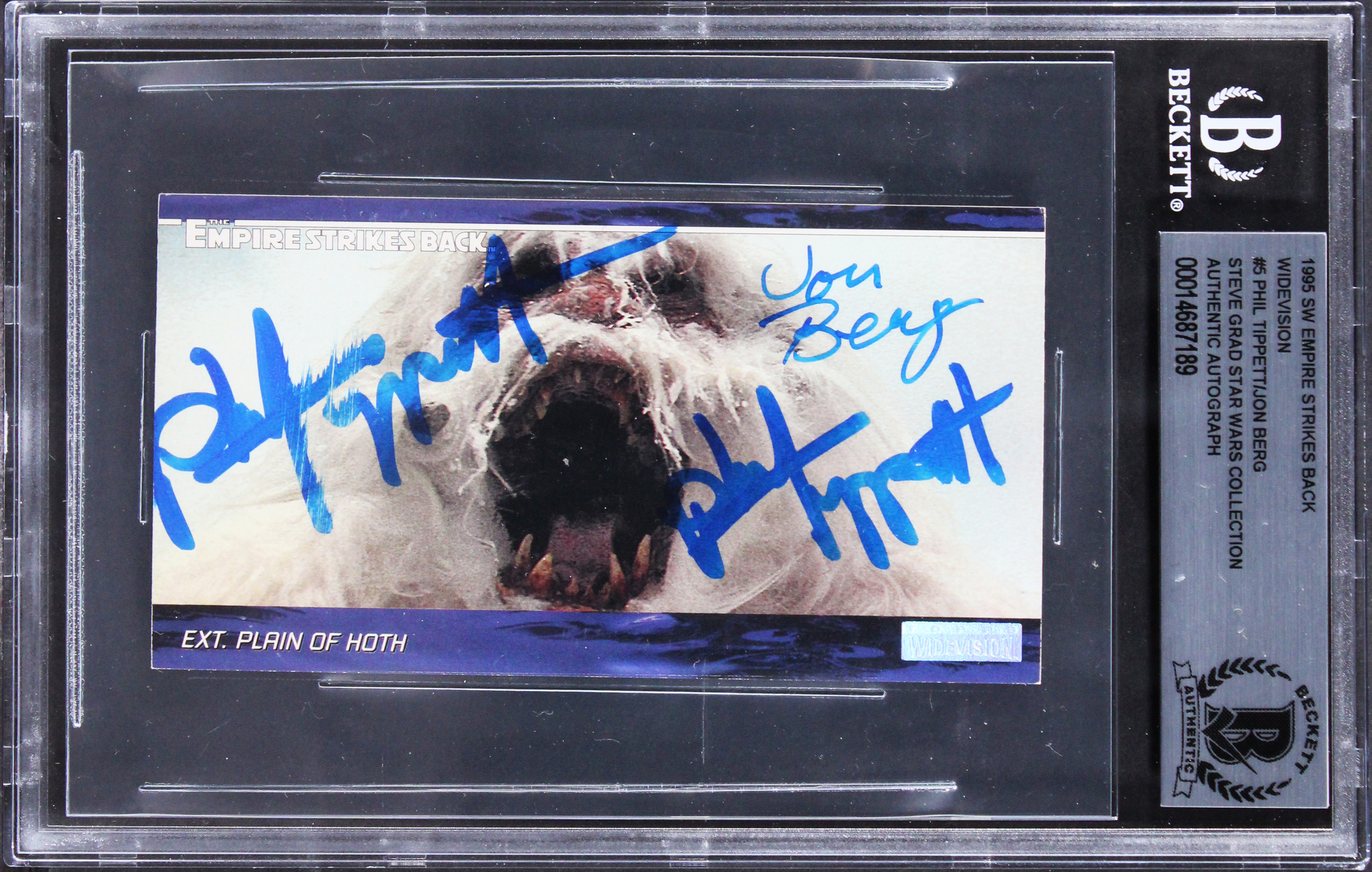 This Autographed 1995 SW Empire Strikes Back Widevision #5 Card has been Personally Signed by Phil Tippett & Jon Berg of Star Wars. This item is 100% Authentic, it comes slabbed and authenticated by Beckett Authentication Services. The authenticity can be verified on Beckett Authentication Services website.