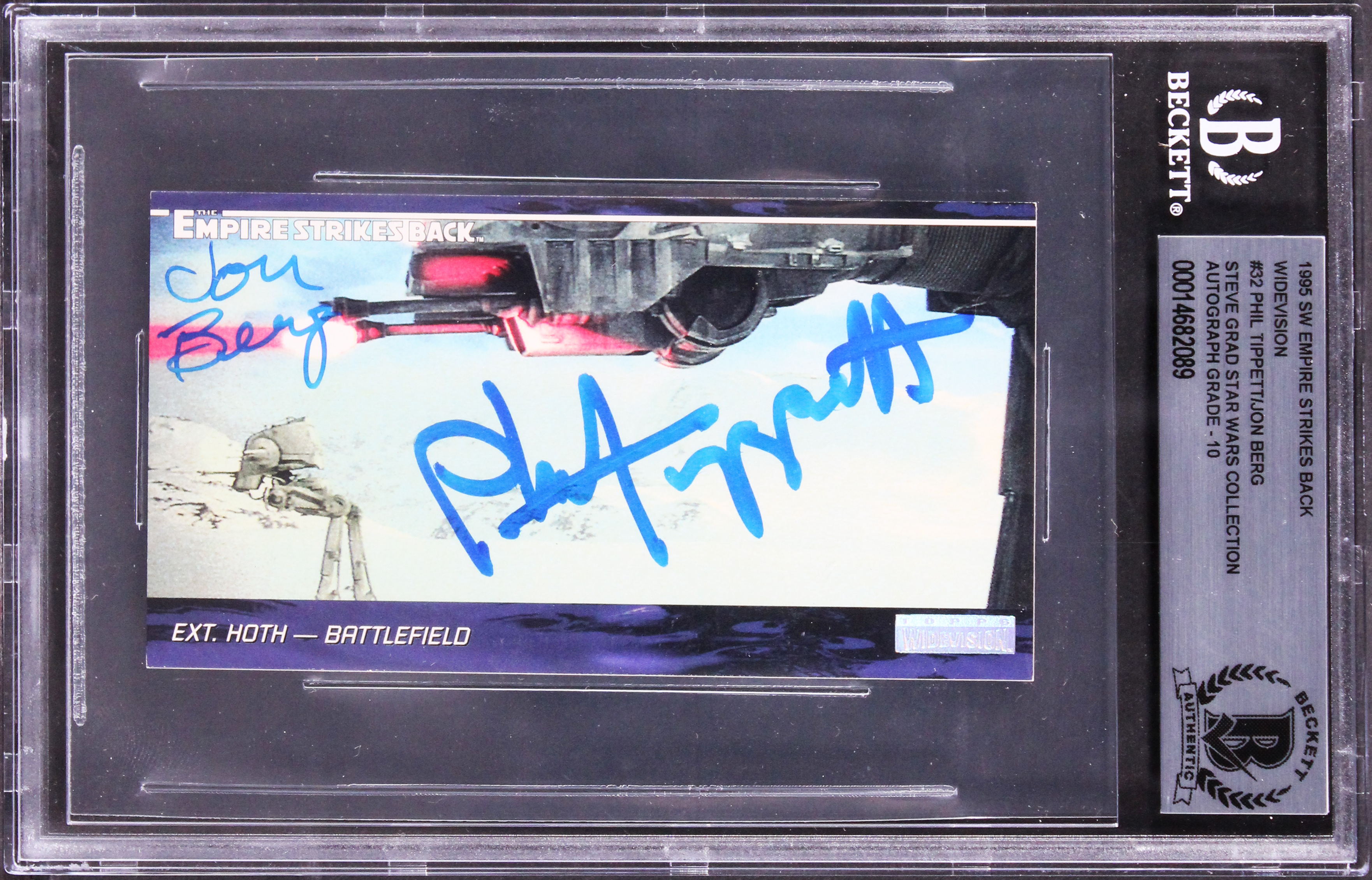 This Autographed 1995 SW Empire Strikes Back Widevision #32 Auto Graded Gem Mint 10! Card has been Personally Signed by Phil Tippett & Jon Berg of Star Wars. This item is 100% Authentic, it comes slabbed and authenticated by Beckett Authentication Services. The authenticity can be verified on Beckett Authentication Services website.