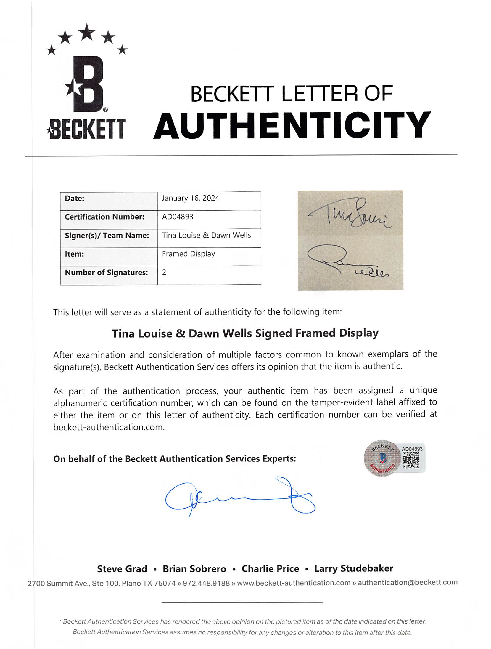 This Autographed 3x5 Index Card Framed Display has been Personally Signed by Dawn Wells & Tina Louise of Gilligan's Island. This item is 100% Authentic to include a Certificate of Authenticity (COA) / hologram by Beckett Authentication Services. The authenticity can be verified on Beckett Authentication Services website. This item has been professionally framed to overall dimensions of approximately 16.5 x 30.5 inches.