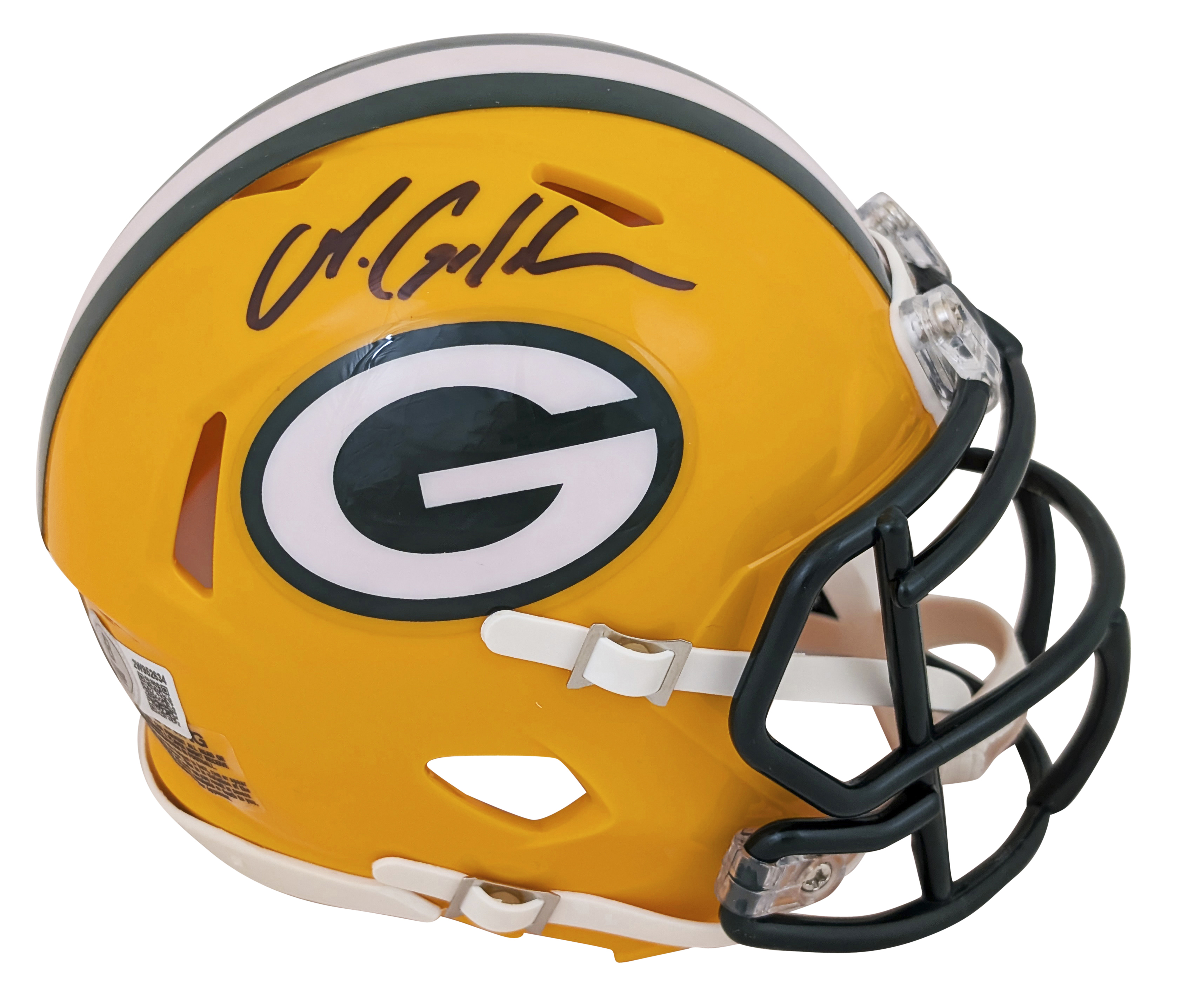 This Autographed Speed Mini Helmet has been Personally Signed by Matthew Golden of the Green Bay Packers. This item is 100% Authentic to include a hologram by Beckett Authentication Services. This item will come with an affixed Beckett Authentication Services (BAS) authentication sticker, which includes a scannable QR code to verify authenticity. Please note that Beckett no longer provides serial-numbered COA cards, and the attached BAS sticker will serve as the complete authentication for this item. This is a BAS Witnessed Protection Program item which means a Beckett Authentication Service representative was present when this item was being signed. We conducted an autograph signing with Matthew Golden where multiples of the same item were signed. While the photographs are representative of this item, the size, placement and strength of the signature may vary. Each item is hand signed, therefore, each autograph is unique. This item can be verified through BAS Witnessed.