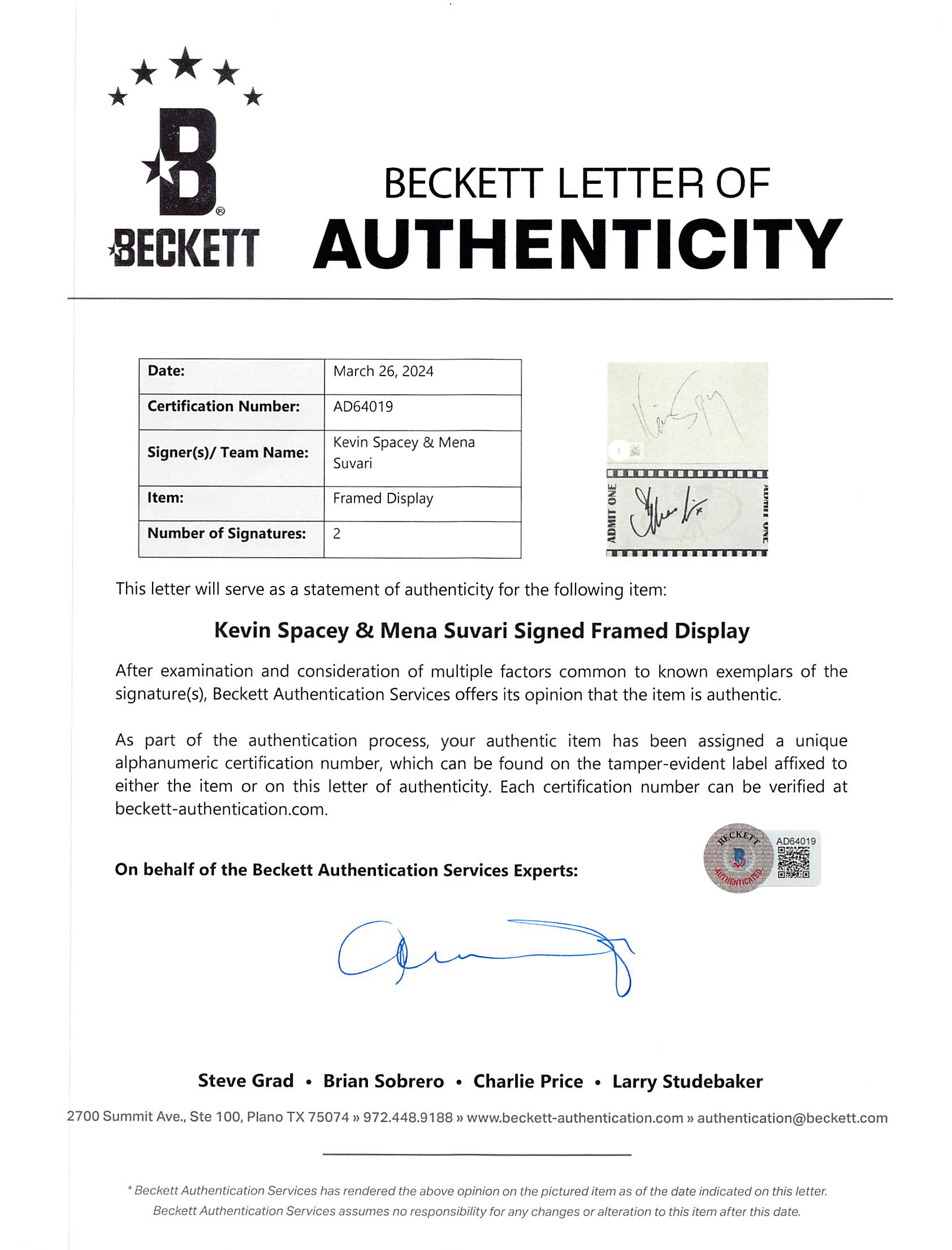 This Autographed Framed Display has been Personally Signed by Kevin Spacey & Mena Suvari of American Beauty. This item is 100% Authentic to include a Certificate of Authenticity (COA) / hologram by Beckett Authentication Services. The authenticity can be verified on Beckett Authentication Services website. This item has been professionally framed to overall dimensions of approximately 25.5 x 18.5 inches.