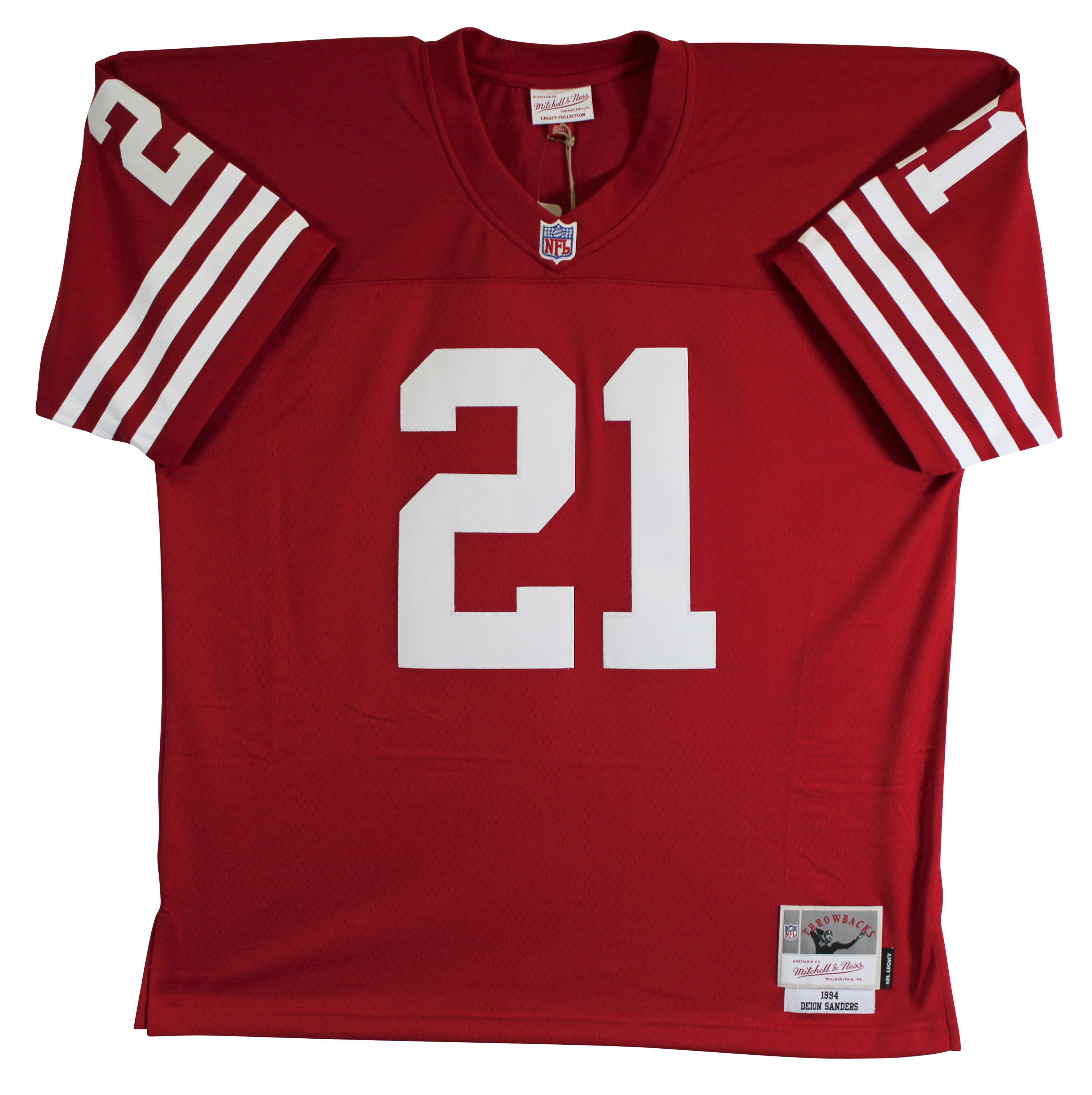 This Autographed Red Mitchell & Ness Throwback Jersey with the inscription of "Primetime" has been Personally Signed by Deion Sanders of the San Francisco 49ers. This item is 100% Authentic to include a hologram by Beckett Authentication Services. This item will come with an affixed Beckett Authentication Services (BAS) authentication sticker, which includes a scannable QR code to verify authenticity. Please note that Beckett no longer provides serial-numbered COA cards, and the attached BAS sticker will serve as the complete authentication for this item. This is a BAS Witnessed Protection Program item which means a Beckett Authentication Service representative was present when this item was being signed. We conducted an autograph signing with Deion Sanders where multiples of the same item were signed. While the photographs are representative of this item, the size, placement and strength of the signature may vary. Each item is hand signed, therefore, each autograph is unique. This item can be verified through BAS Witnessed. This is a X-Large sized Jersey.