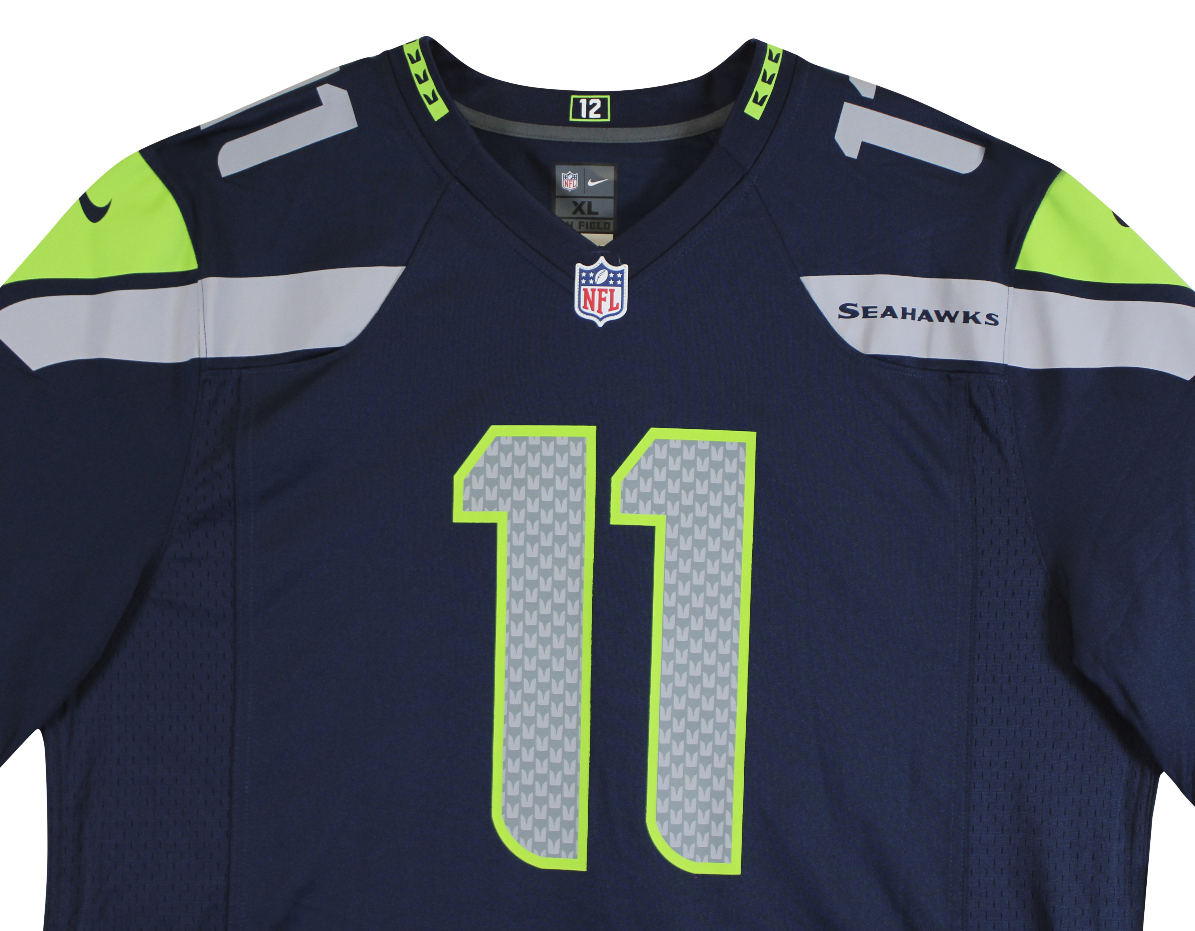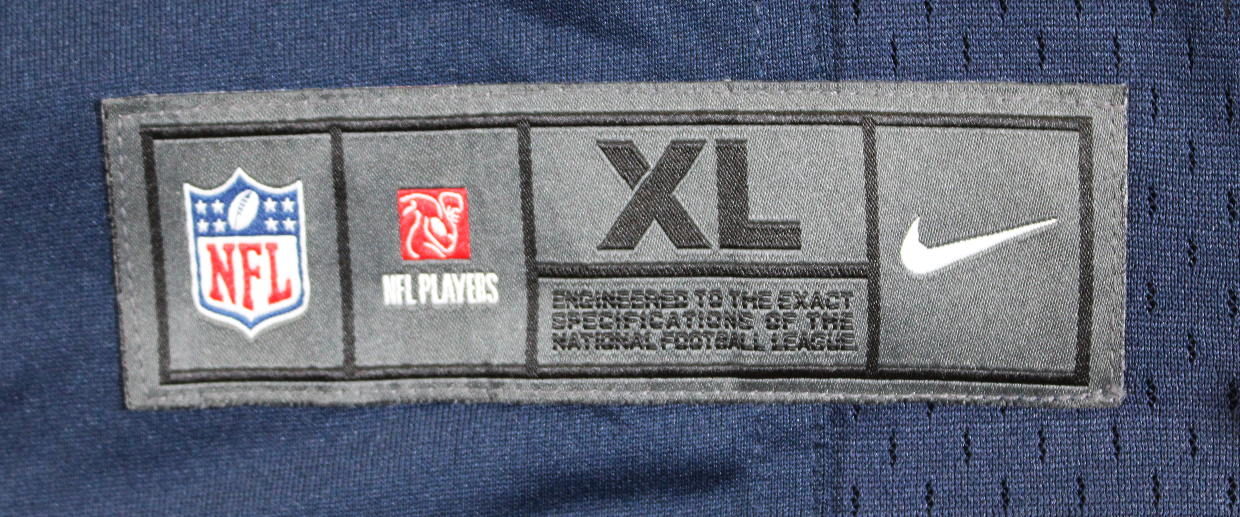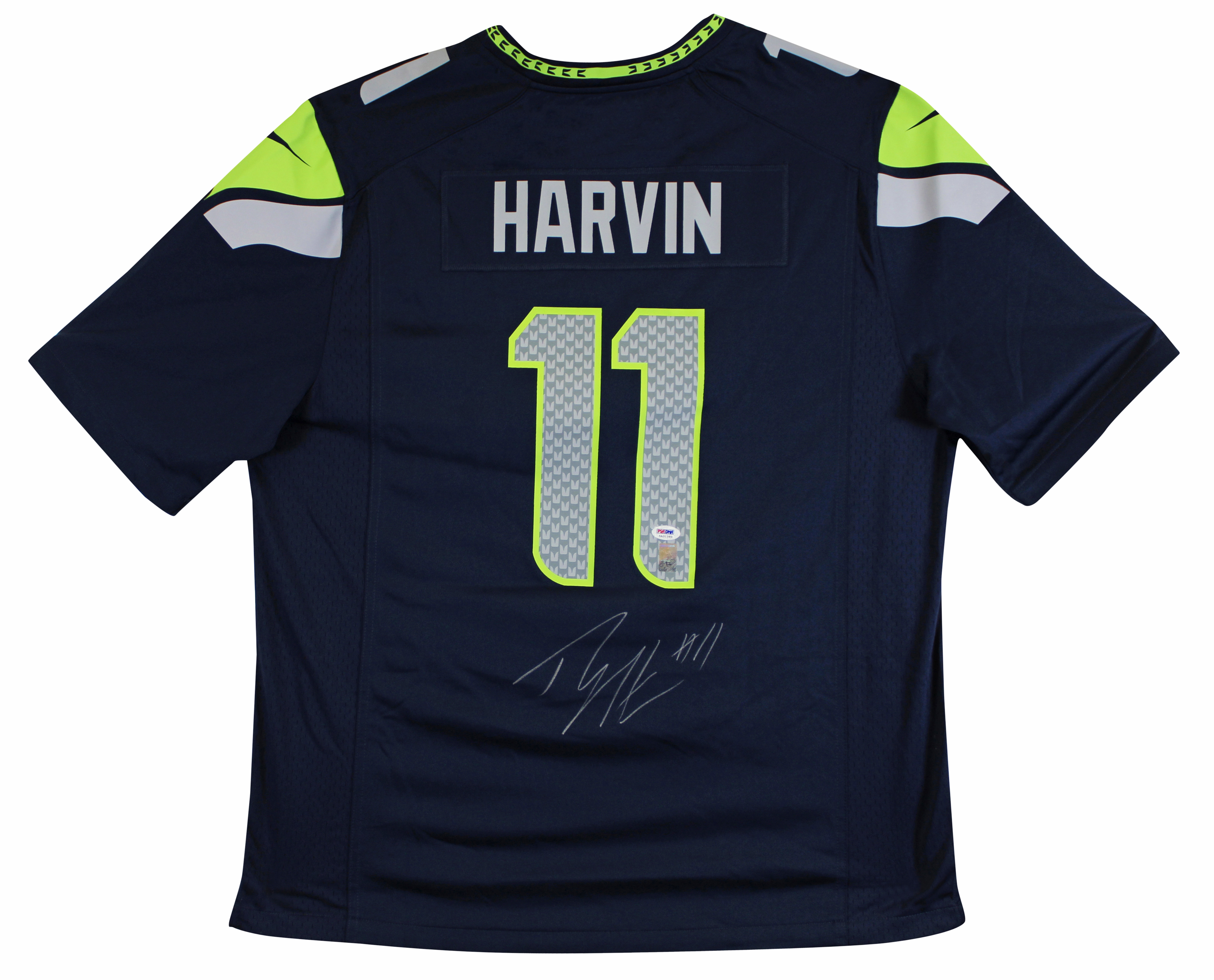 This Autographed Navy Blue Nike Game Jersey has been Personally Signed by Percy Harvin of the Seattle Seahawks. This item is 100% Authentic and comes with a PSA/DNA Certification numbered Hologram. Please note that PSA/DNA no longer provides serial-numbered COA cards, and the attached PSA/DNA sticker will serve as the complete authentication for this item. This is a PSA in the Presence Authenticated item which means a PSA representative was present when this item was being signed. The authenticity can be verified on Professional Sports Authenticator website. This is a X-Large sized Jersey.