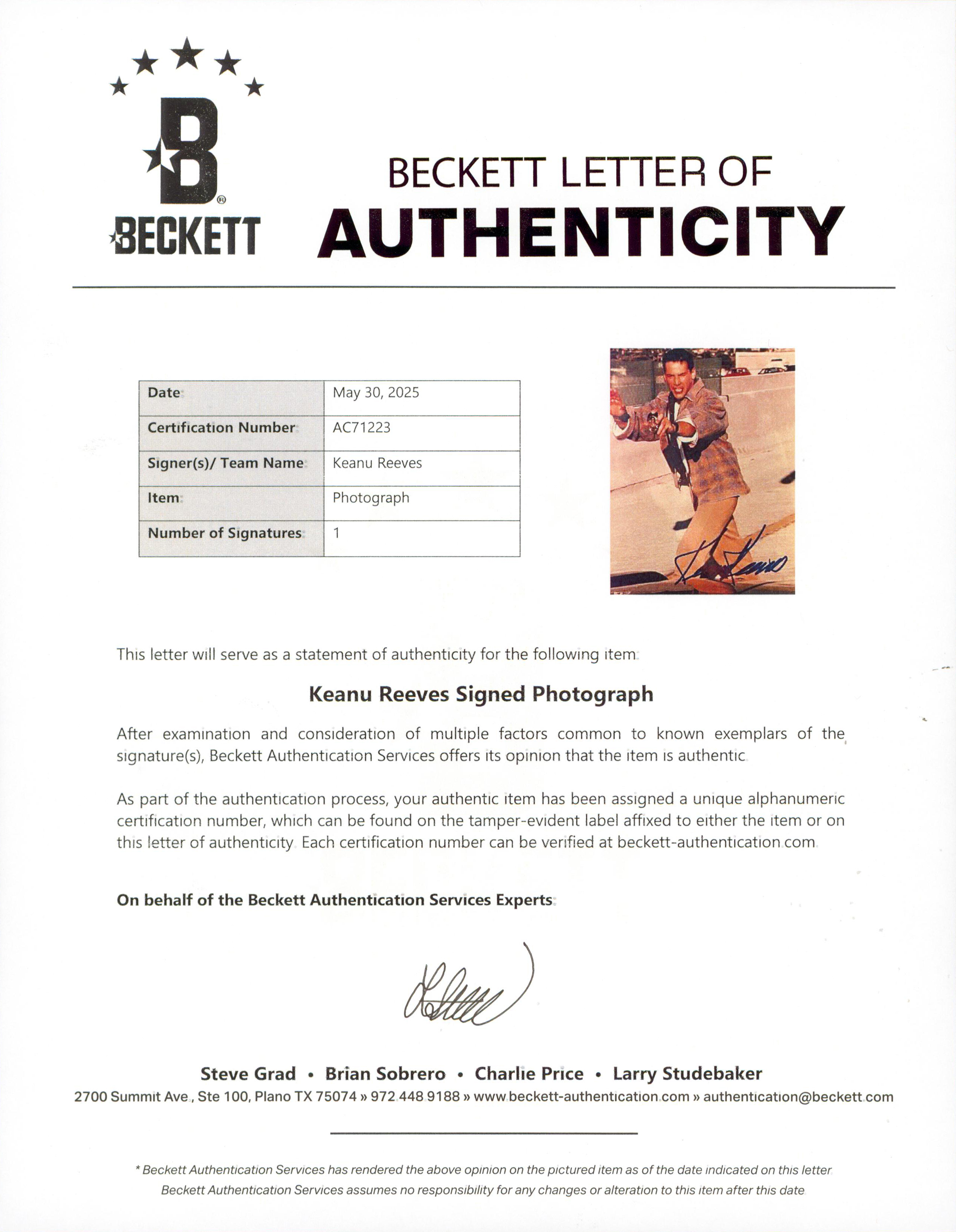 This Autographed 8x10 Photo has been Personally Signed by Keanu Reeves of Speed. This item is 100% Authentic to include a Certificate of Authenticity (COA) / hologram by Beckett Authentication Services.The authenticity can be verified on Beckett Authentication Services website.