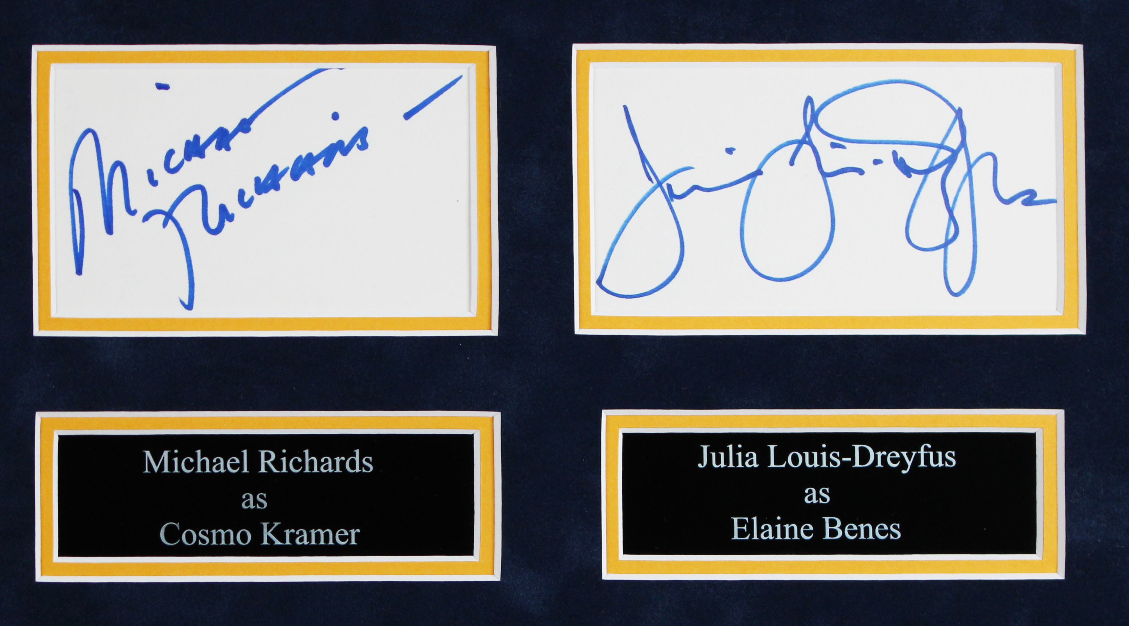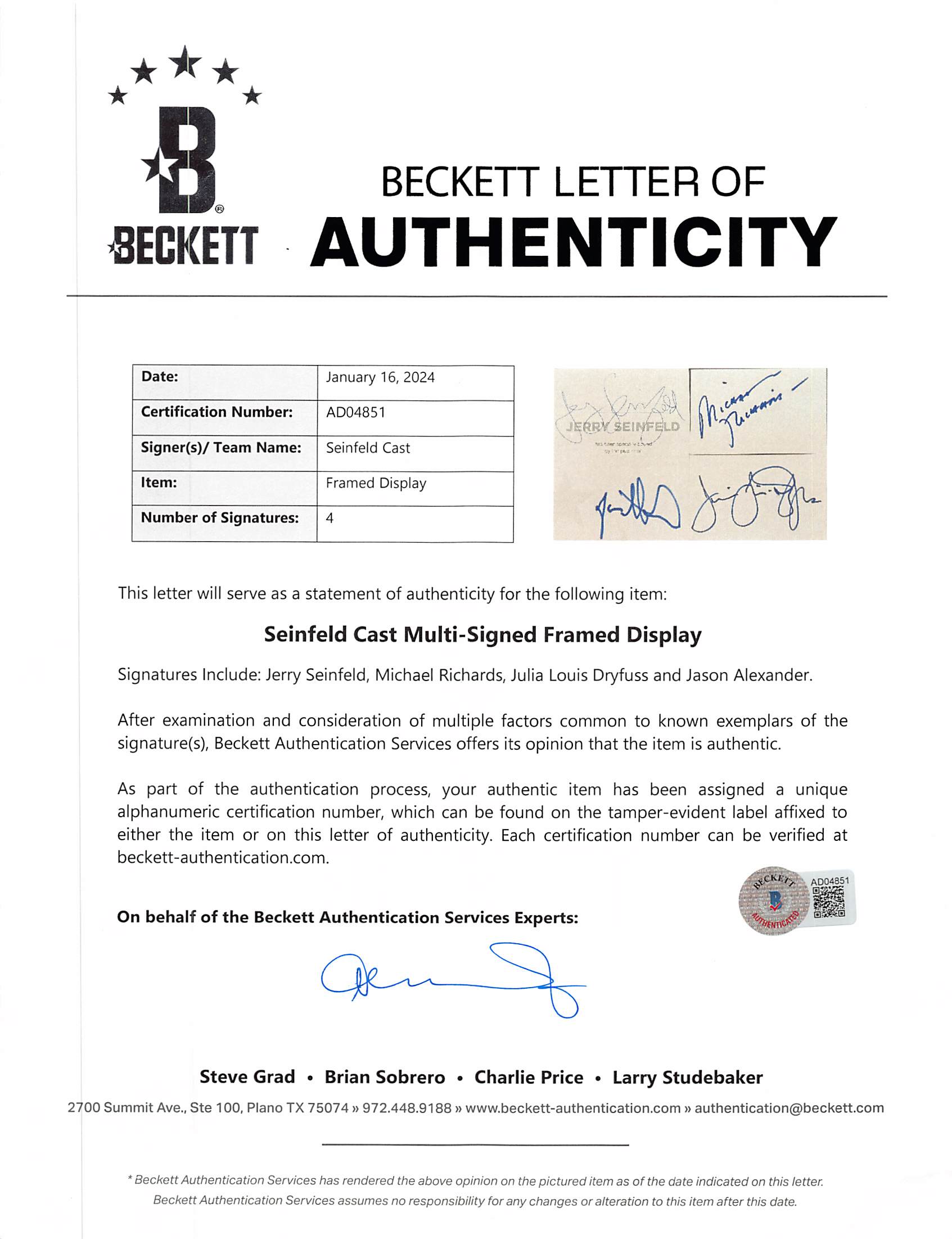This Autographed Framed Display has been Personally Signed by Jerry Seinfeld, Jason Alexander, Michael Richards & Julia Louis-Dreyfus of Seinfeld. This item is 100% Authentic to include a Certificate of Authenticity (COA) / hologram by Beckett Authentication Services. The authenticity can be verified on Beckett Authentication Services website. This item has been professionally framed to overall dimensions of approximately 30.5 x 32.5 inches. This photo has handling wear due to age and handling. This includes a crease in the top left corner and the bottom right corner.