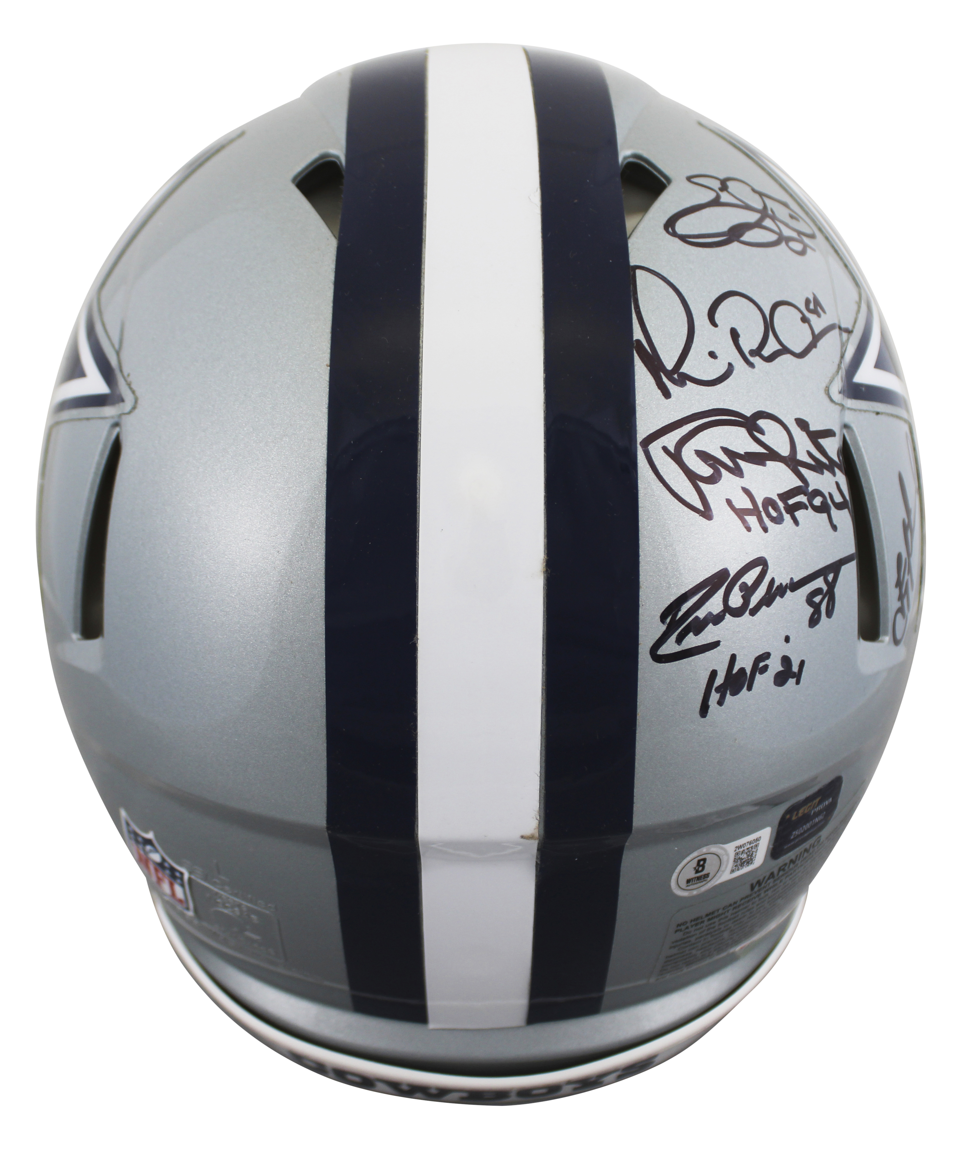 This Autographed Riddell Authentic Full Size Speed Proline Helmet has been Personally Signed by Troy Aikman, Emmitt Smith, Michael Irvin, Tony Dorsett, Drew Pearson, Randy White, Jimmy Johnson, Mel Renfro, Roger Staubach, DeMarcus Ware & Charles Haley of the Dallas Cowboys. This item is 100% Authentic to include a hologram by Beckett Authentication Services. This item will come with an affixed Beckett Authentication Services (BAS) authentication sticker, which includes a scannable QR code to verify authenticity. Please note that Beckett no longer provides serial-numbered COA cards, and the attached BAS sticker will serve as the complete authentication for this item. This is a BAS Witnessed Protection Program item which means a Beckett Authentication Service representative was present when this item was being signed. We conducted an autograph signing with Troy Aikman, Emmitt Smith, Michael Irvin, Tony Dorsett, Drew Pearson, Randy White, Jimmy Johnson, Mel Renfro, Roger Staubach, DeMarcus Ware & Charles Haley where multiples of the same item were signed. While the photographs are representative of this item, the size, placement and strength of the signature may vary. Each item is hand signed, therefore, each autograph is unique. This item can be verified through BAS Witnessed.