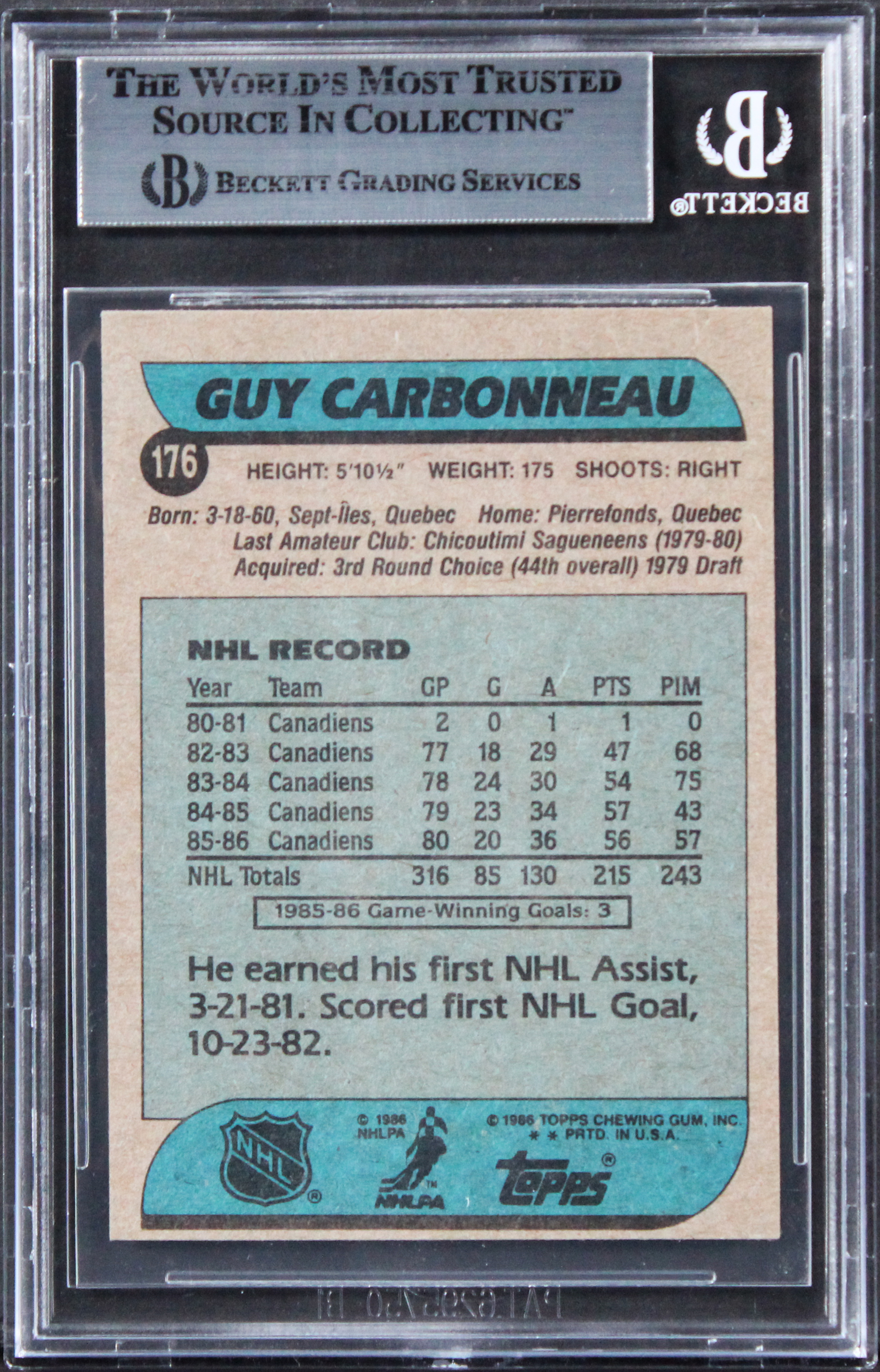 This Autographed 1986 Topps #176 Card has been Personally Signed by Guy Carbonneau of the Montreal Canadiens. This item is 100% Authentic, it comes slabbed and authenticated by Beckett Authentication Services. The authenticity can be verified on Beckett Authentication Services website.