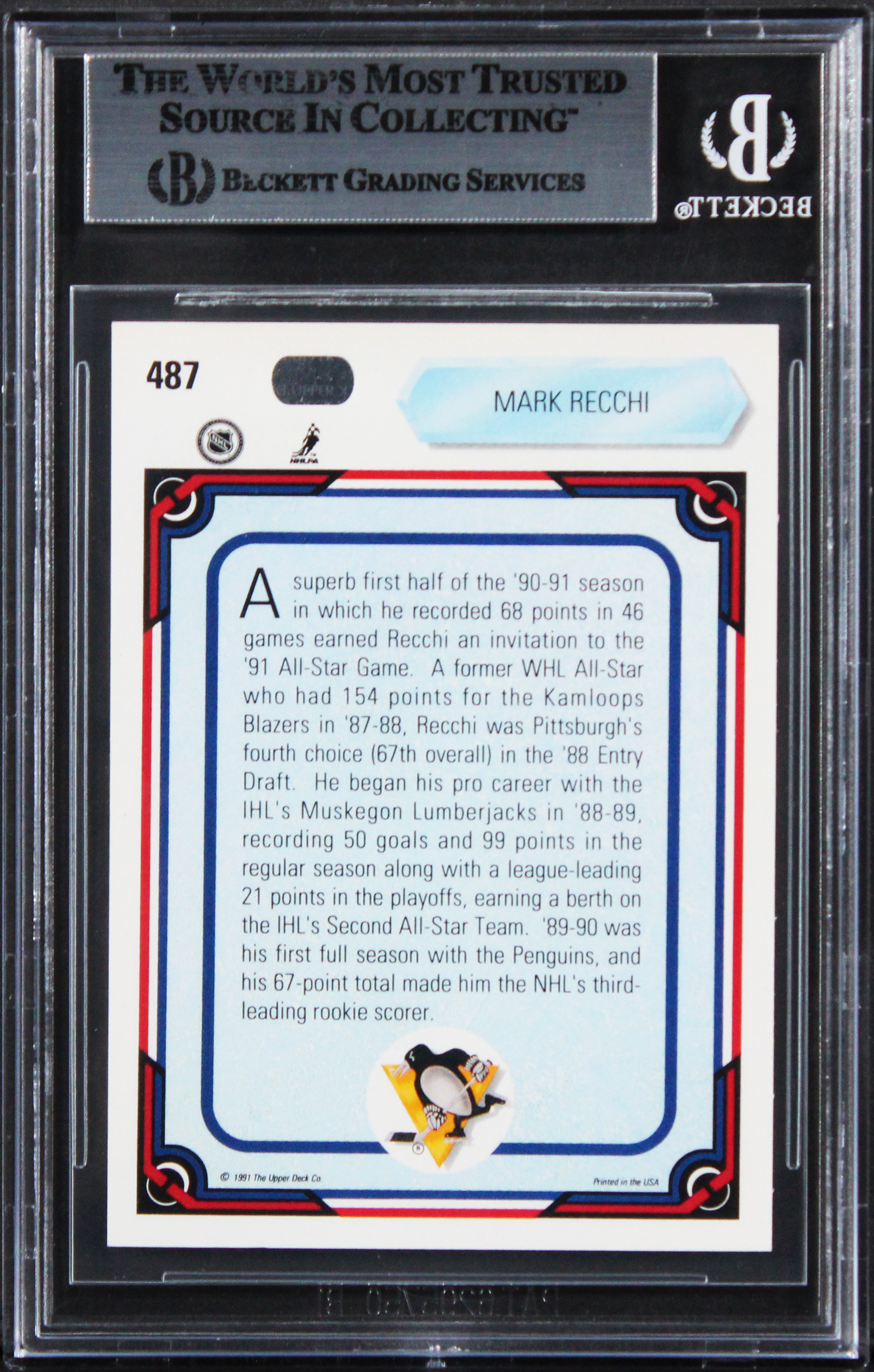 This Autographed 1990 Upper Deck #487 Card has been Personally Signed by Mark Recchi of the Pittsburgh Peguins. This item is 100% Authentic, it comes slabbed and authenticated by Beckett Authentication Services. The authenticity can be verified on Beckett Authentication Services website.