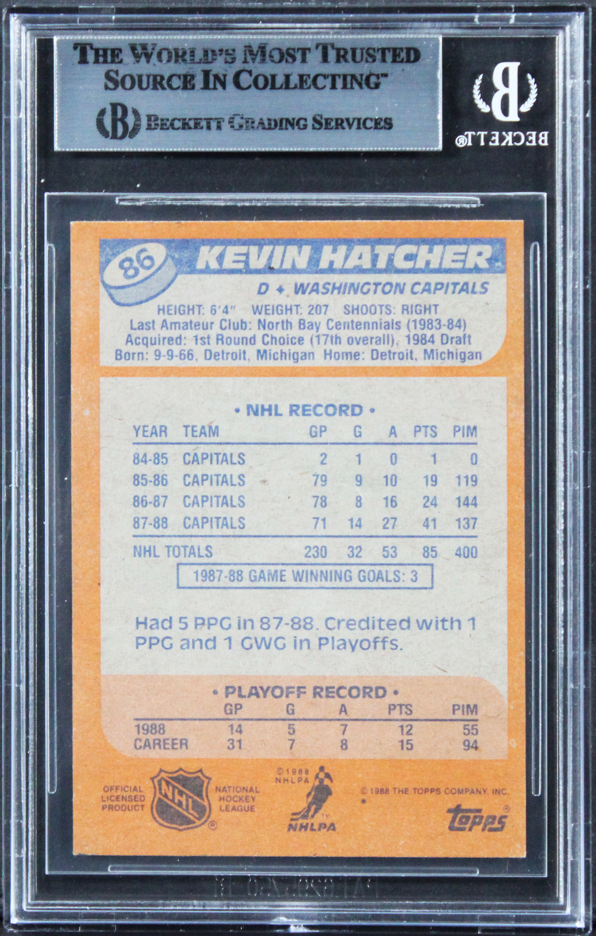 This Autographed 1988 Topps #86 Card has been Personally Signed by Kevin Hatcher of the Washington Capitals. This item is 100% Authentic, it comes slabbed and authenticated by Beckett Authentication Services. The authenticity can be verified on Beckett Authentication Services website.