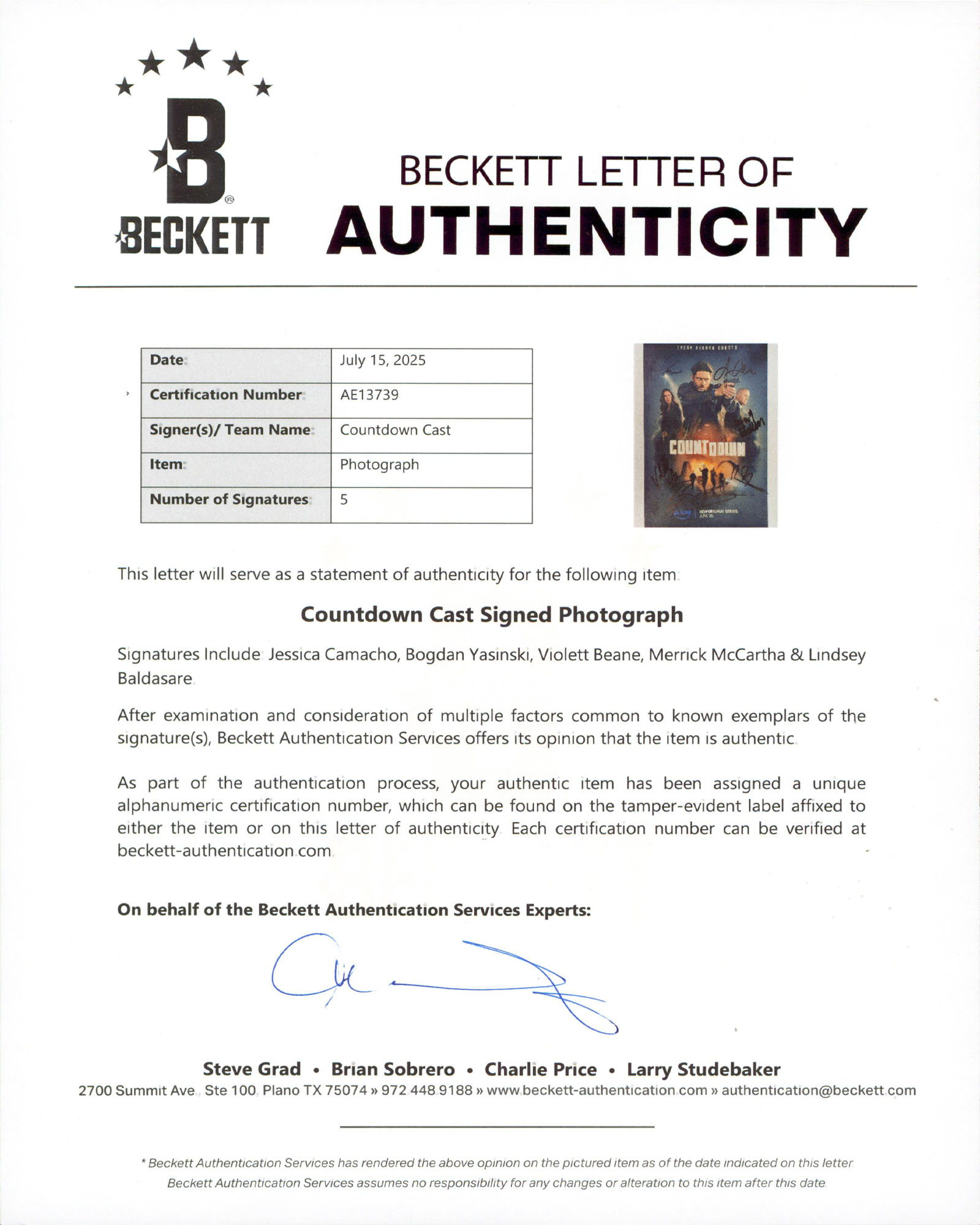 This Autographed Vertical 11x14 Photo has been Personally Signed by Jessica Camacho, Bogdan Yasinski, Violett Beane, Merrick McCartha & Lindsey Baldasare of Countdown. This item is 100% Authentic to include a hologram by Beckett Authentication Services. This item will come with an affixed Beckett Authentication Services (BAS) authentication sticker, which includes a scannable QR code to verify authenticity. Please note that Beckett no longer provides serial-numbered COA cards, and the attached BAS sticker will serve as the complete authentication for this item. The authenticity can be verified on Beckett Authentication Services website.