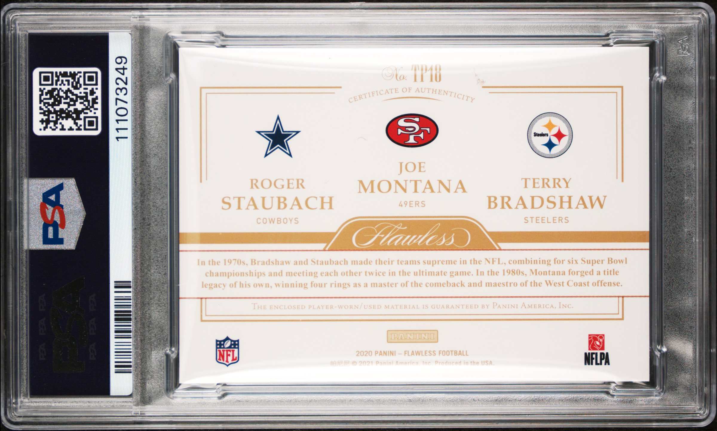 This Autographed Auto Graded Gem Mint 10! 2020 Panini Flawless Triple Patches #TP18 #25/25 Card has been Personally Signed by Roger Staubach, Joe Montana & Terry Bradshaw. This item is 100% Authentic, it comes slabbed and authenticated by PSA/DNA. The authenticity can be verified on Professional Sports Authenticator website.