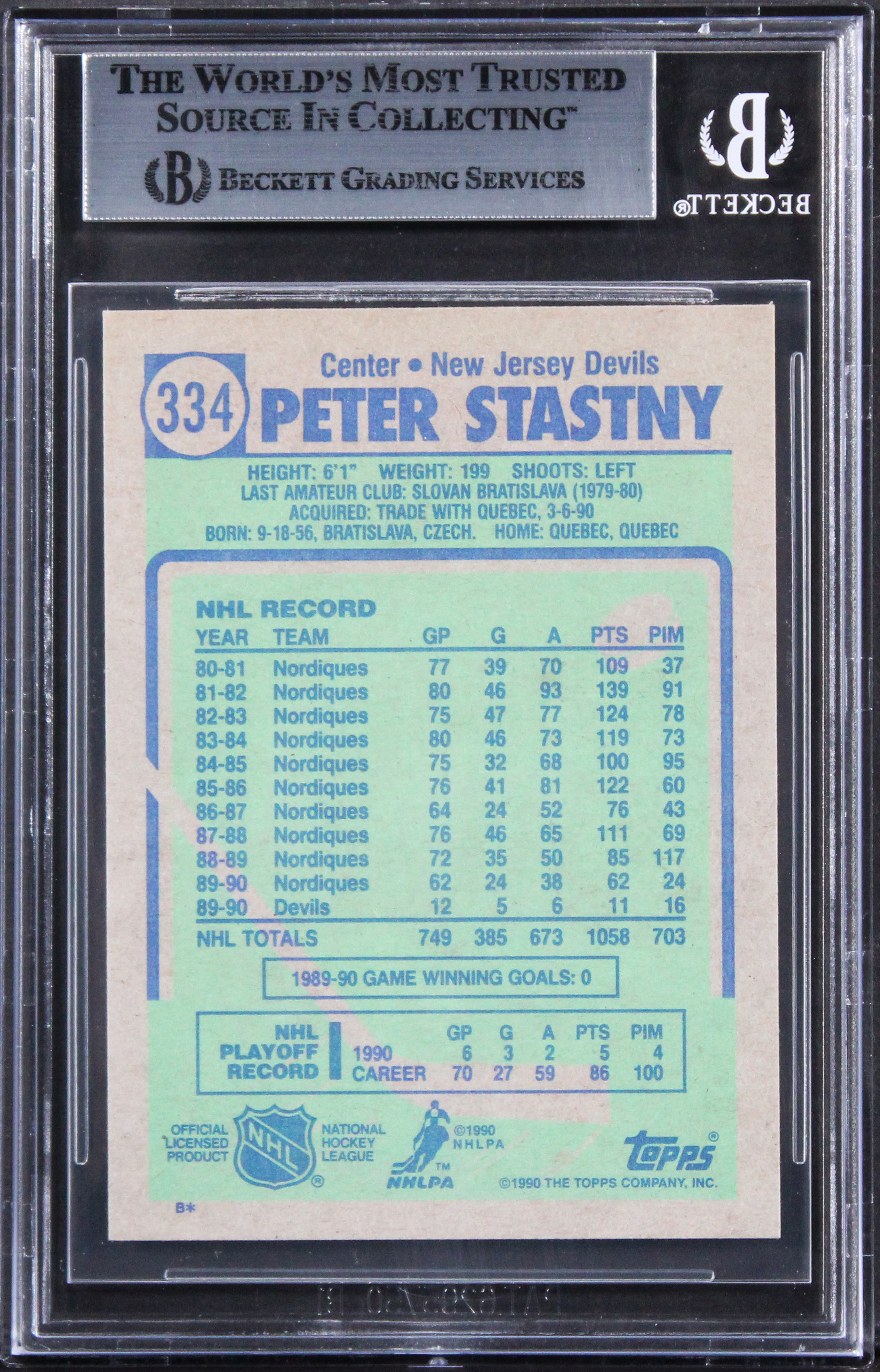 This Autographed 1990 Topps #334 Card has been Personally Signed by Peter Stastny of the New Jersey Devils. This item is 100% Authentic, it comes slabbed and authenticated by Beckett Authentication Services. The authenticity can be verified on Beckett Authentication Services website.