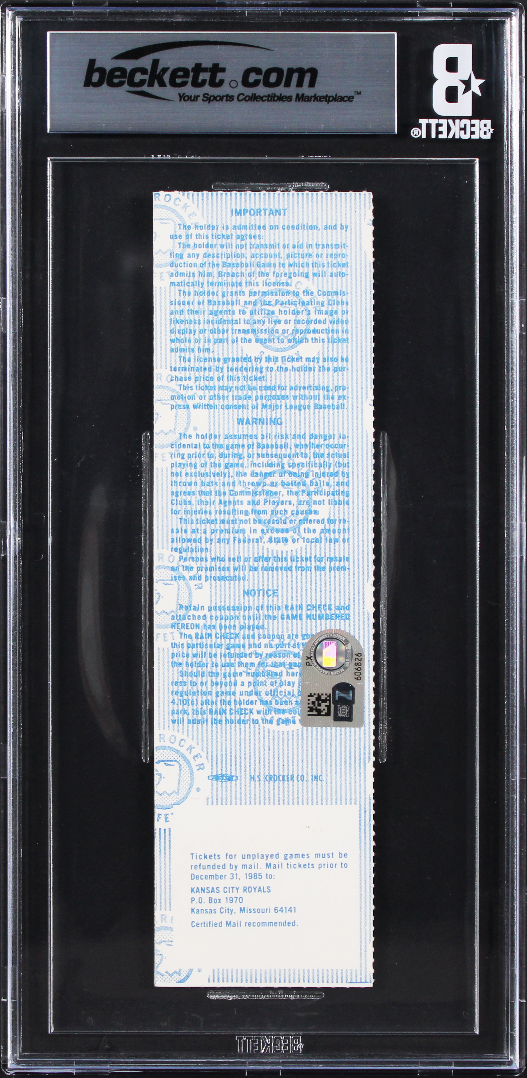 This Autographed October 27, 1985 World Series Game 7 Full Ticket Graded NM-MT 8 with an Auto Graded Gem Mint 10! has been personally signed by George Brett of the Kansas City Royals. This item is 100% authentic, it comes slabbed and authenticated by Beckett Authentication Services. The authenticity can be verified on Beckett Authentication Services website.