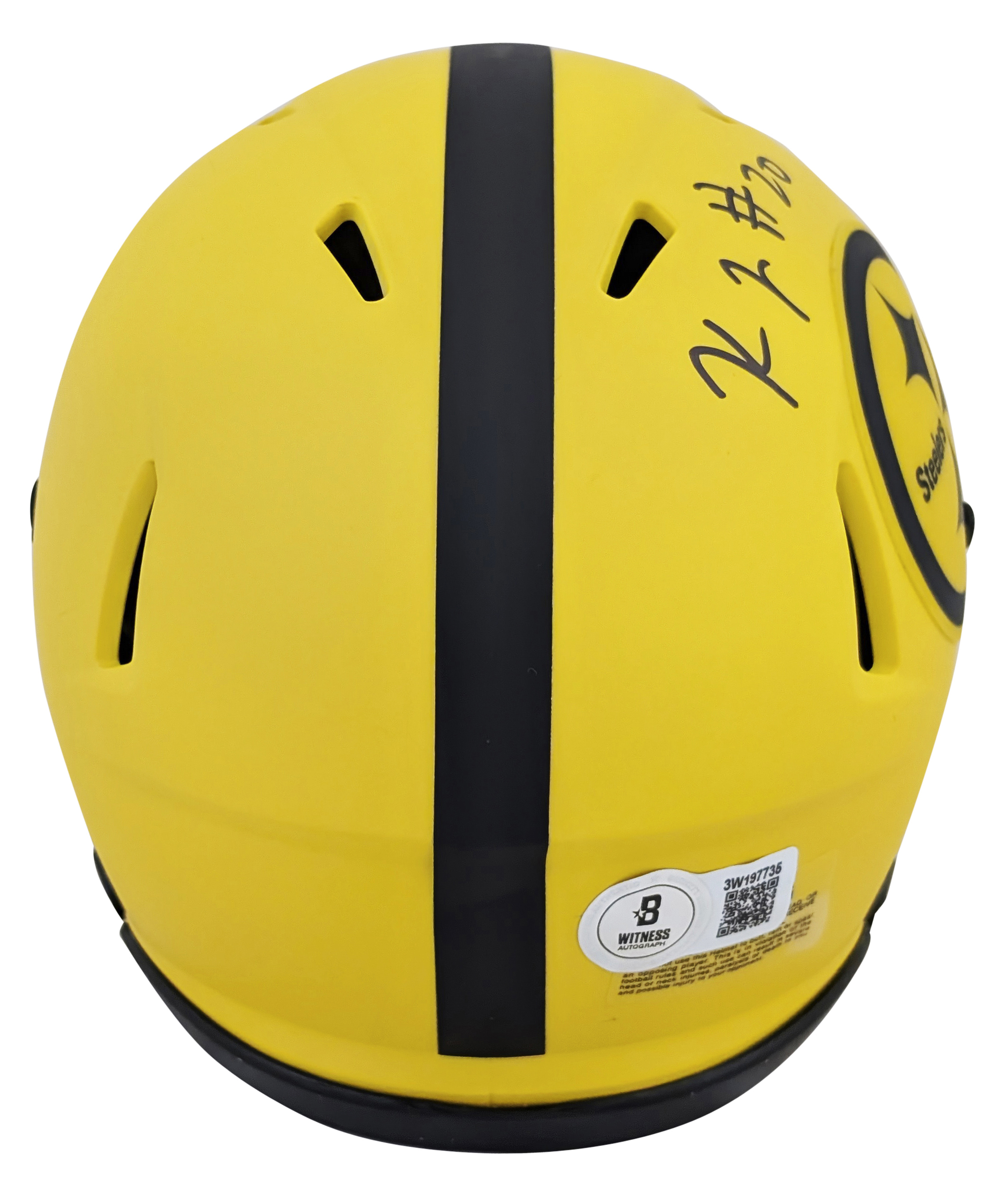 This Autographed Alternate Rave Speed Mini Helmet W/ Uv Mirrored Back Acrylic Display Case has been Personally Signed by Kaleb Johnson of the Pittsburgh Steelers. This item is 100% Authentic to include a hologram by Beckett Authentication Services. This item will come with an affixed Beckett Authentication Services (BAS) authentication sticker, which includes a scannable QR code to verify authenticity. Please note that Beckett no longer provides serial-numbered COA cards, and the attached BAS sticker will serve as the complete authentication for this item. This is a BAS Witnessed Protection Program item which means a Beckett Authentication Service representative was present when this item was being signed. We conducted an autograph signing with Kaleb Johnson where multiples of the same item were signed. While the photographs are representative of this item, the size, placement and strength of the signature may vary. Each item is hand signed, therefore, each autograph is unique. This item can be verified through BAS Witnessed.
