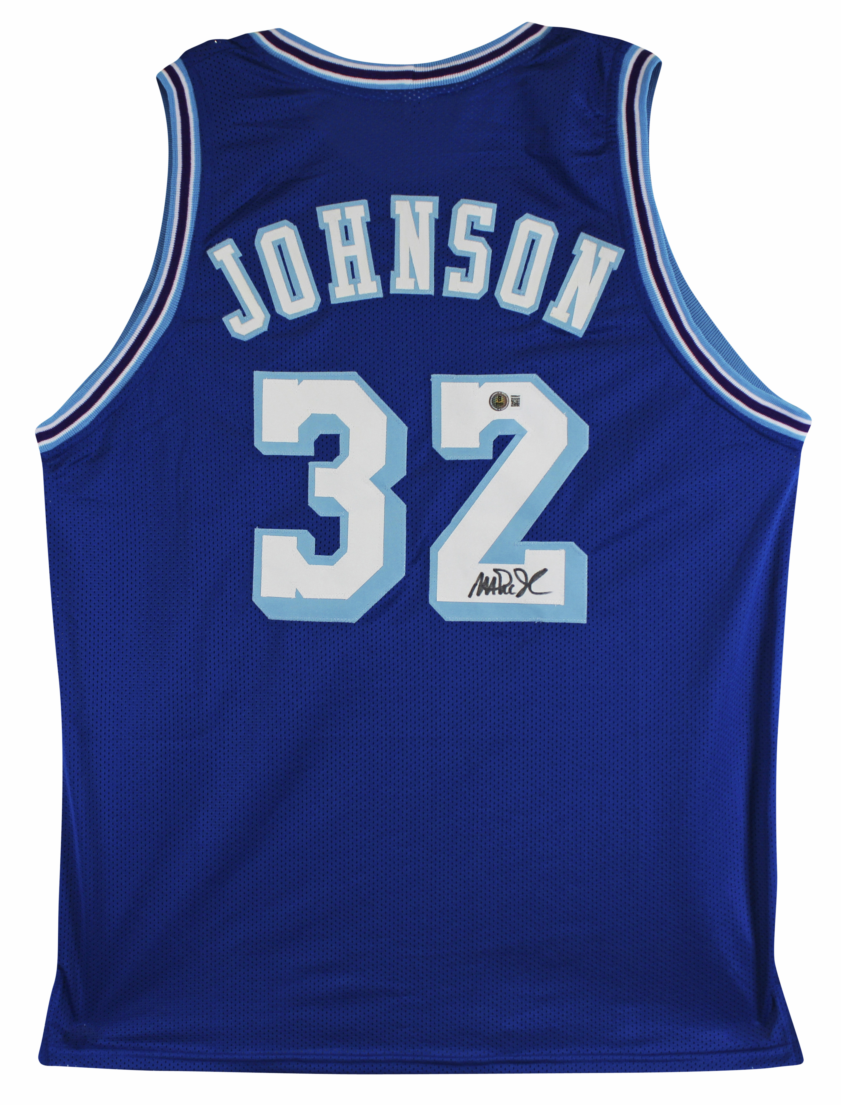 This Autographed Blue Throwback Pro Style Jersey has been Personally Signed by Magic Johnson of the Los Angeles Lakers. This item is 100% Authentic to include a hologram by Beckett Authentication Services. This item will come with an affixed Beckett Authentication Services (BAS) authentication sticker, which includes a scannable QR code to verify authenticity. Please note that Beckett no longer provides serial-numbered COA cards, and the attached BAS sticker will serve as the complete authentication for this item. This is a BAS Witnessed Protection Program item which means a Beckett Authentication Service representative was present when this item was being signed. We conducted an autograph signing with Magic Johnson where multiples of the same item were signed. While the photographs are representative of this item, the size, placement and strength of the signature may vary. Each item is hand signed, therefore, each autograph is unique. This item can be verified through BAS Witnessed. This is a X-Large sized, non-branded, custom-stitched Jersey.