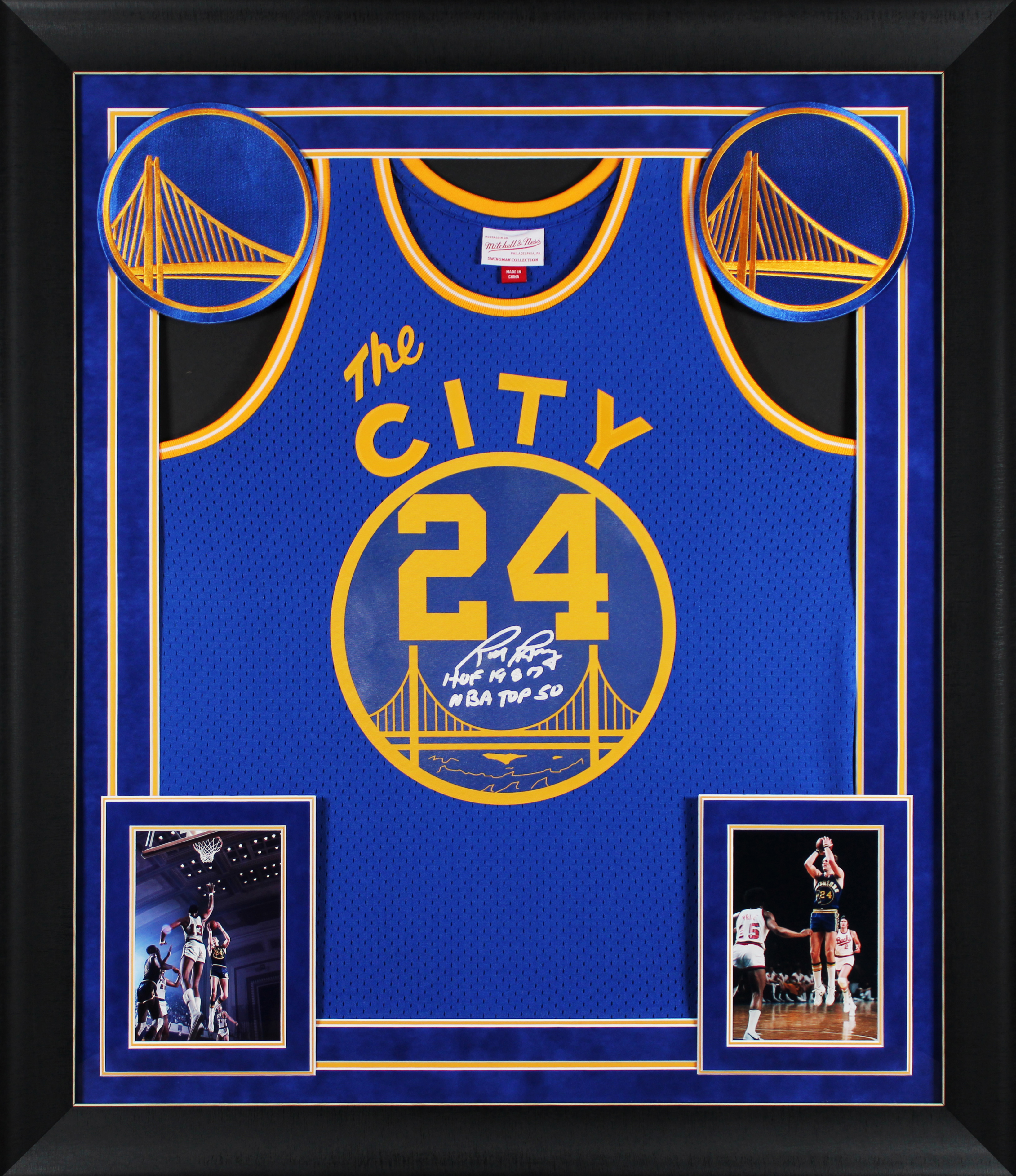 This Autographed Blue Mitchell & Ness Throwback Swingman Framed Jersey with the inscription of "HOF 1987, NBA Top 50" has been Personally Signed by Rick Barry of the Golden State Warriors. This item is 100% Authentic to include a hologram by Beckett Authentication Services. This item will come with an affixed Beckett Authentication Services (BAS) authentication sticker, which includes a scannable QR code to verify authenticity. Please note that Beckett no longer provides serial-numbered COA cards, and the attached BAS sticker will serve as the complete authentication for this item. This is a BAS Witnessed Protection Program item which means a Beckett Authentication Service representative was present when this item was being signed. We have multiples of this same item. While the photographs are representative of this item, the size, placement and strength of the signature may vary. Each item is hand signed, therefore, each autograph is unique. This item has been professionally framed to overall dimensions of approximately 32 x 37 inches. This is a X-Large sized Framed Jersey. This jersey will be framed to order, it will take approximately 3-4 business days from purchase date for it to ship.