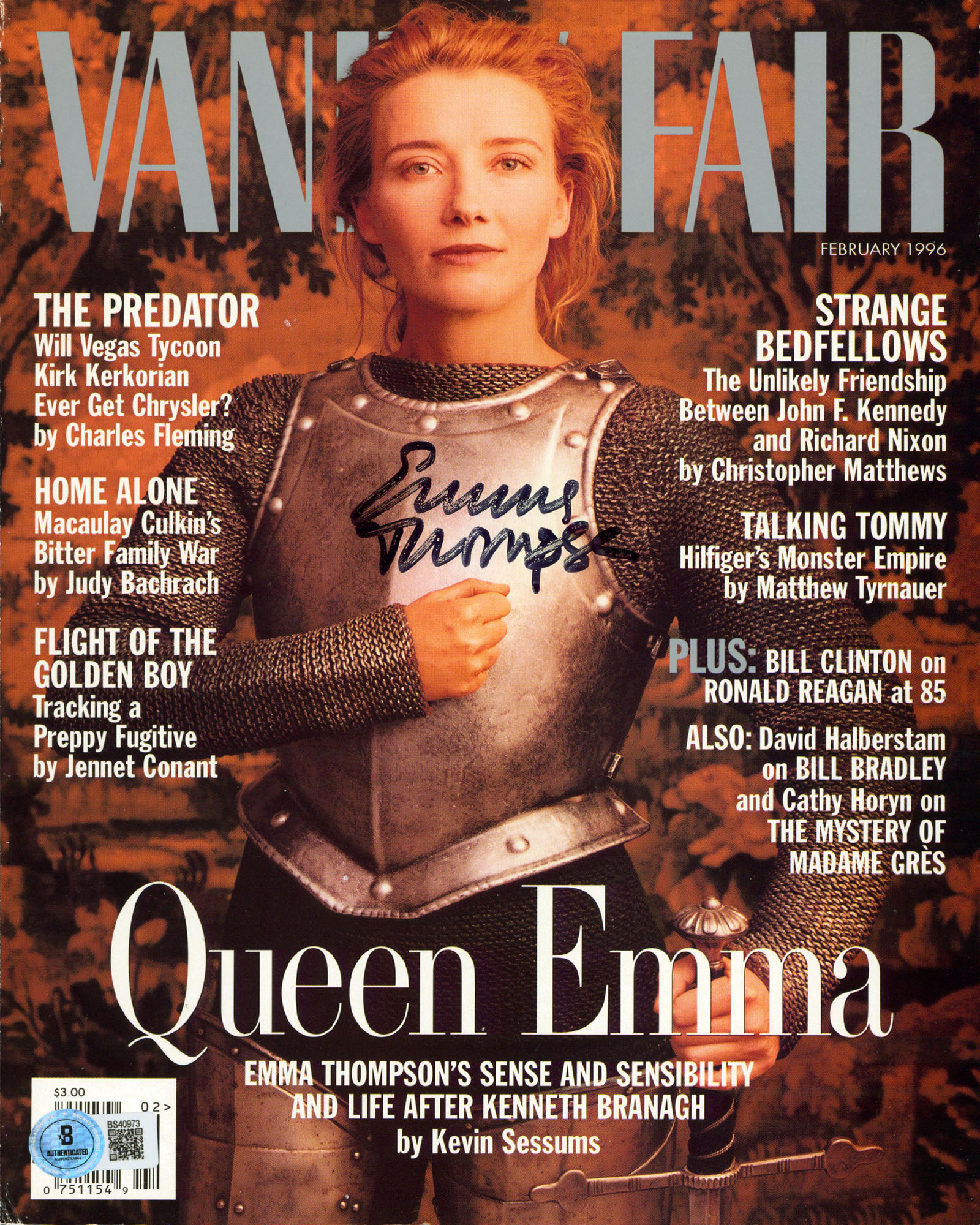 This Autographed Vanity Fair February 1996 Magazine Cover has been Personally Signed by Emma Thompson. This item is 100% Authentic to include a hologram by Beckett Authentication Services. This item will come with an affixed Beckett Authentication Services (BAS) authentication sticker, which includes a scannable QR code to verify authenticity. Please note that Beckett no longer provides serial-numbered COA cards, and the attached BAS sticker will serve as the complete authentication for this item. The authenticity can be verified on Beckett Authentication Services website.