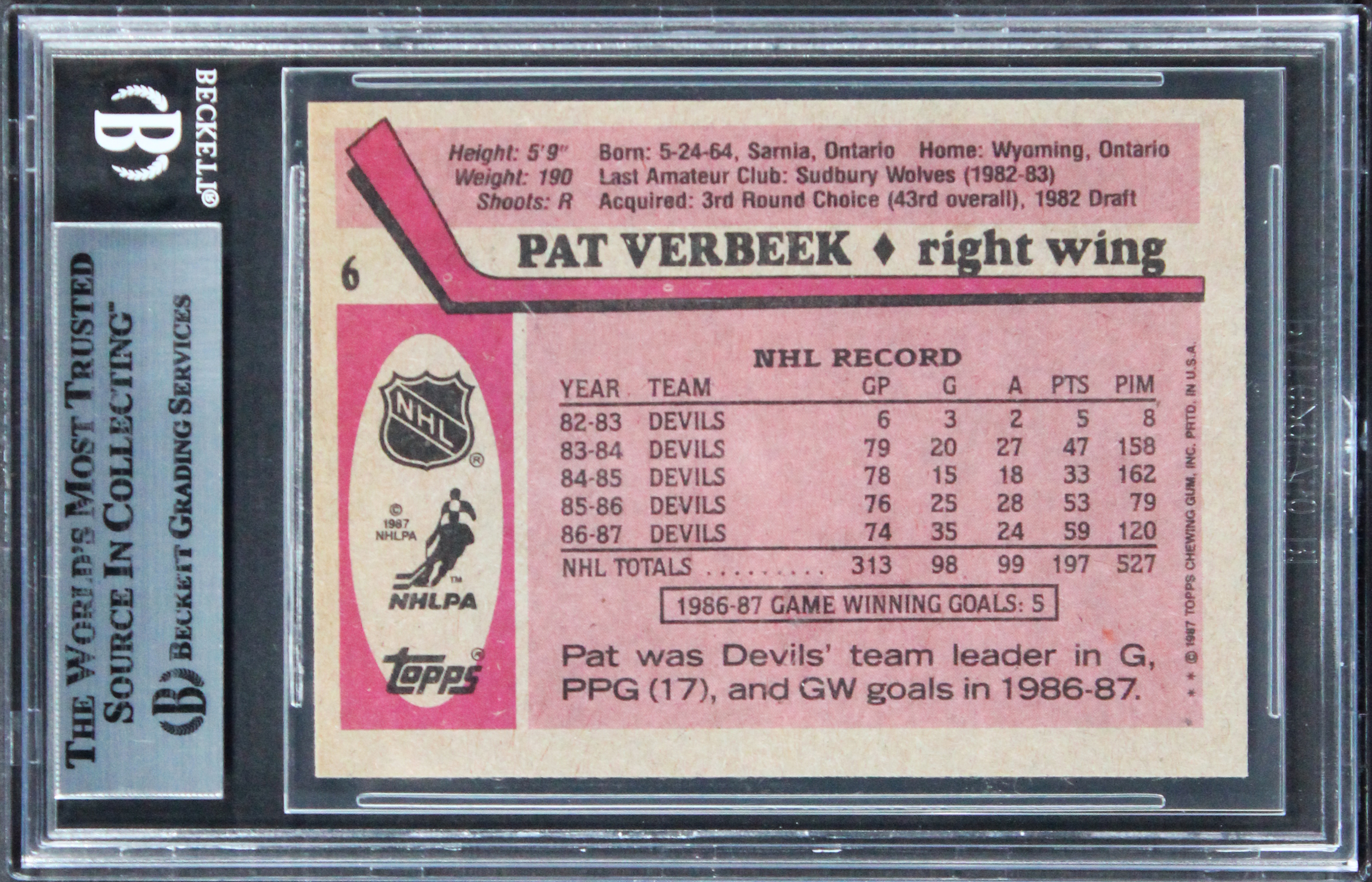 This Autographed 1987 Topps #6 Card has been Personally Signed by Pat Verbeek of the New Jersey Devils. This item is 100% Authentic, it comes slabbed and authenticated by Beckett Authentication Services. The authenticity can be verified on Beckett Authentication Services website.