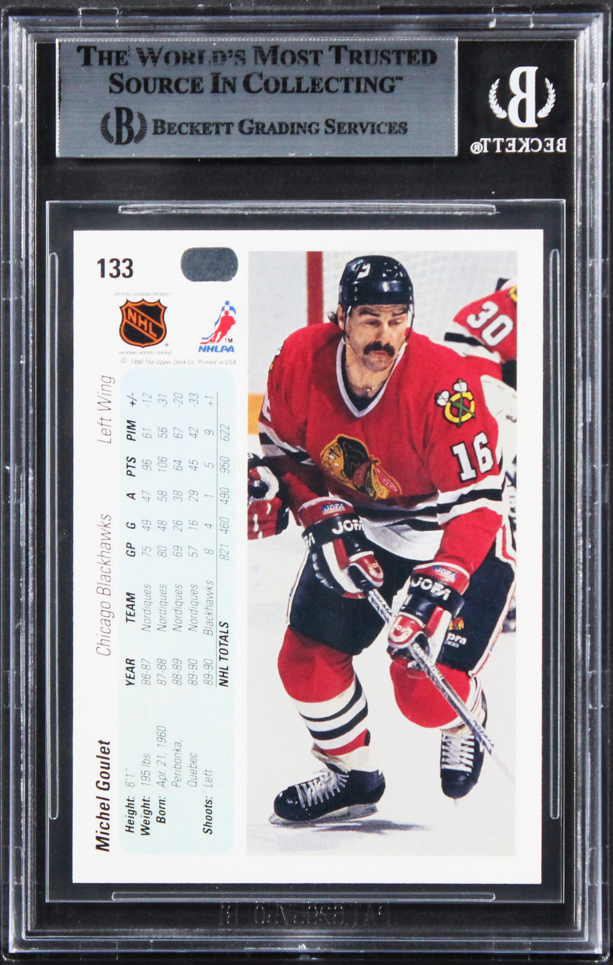 This Autographed 1990 Upper Deck #133 Card has been Personally Signed by Michel Goulet of the Chicago Blackhawks. This item is 100% Authentic, it comes slabbed and authenticated by Beckett Authentication Services. The authenticity can be verified on Beckett Authentication Services website.