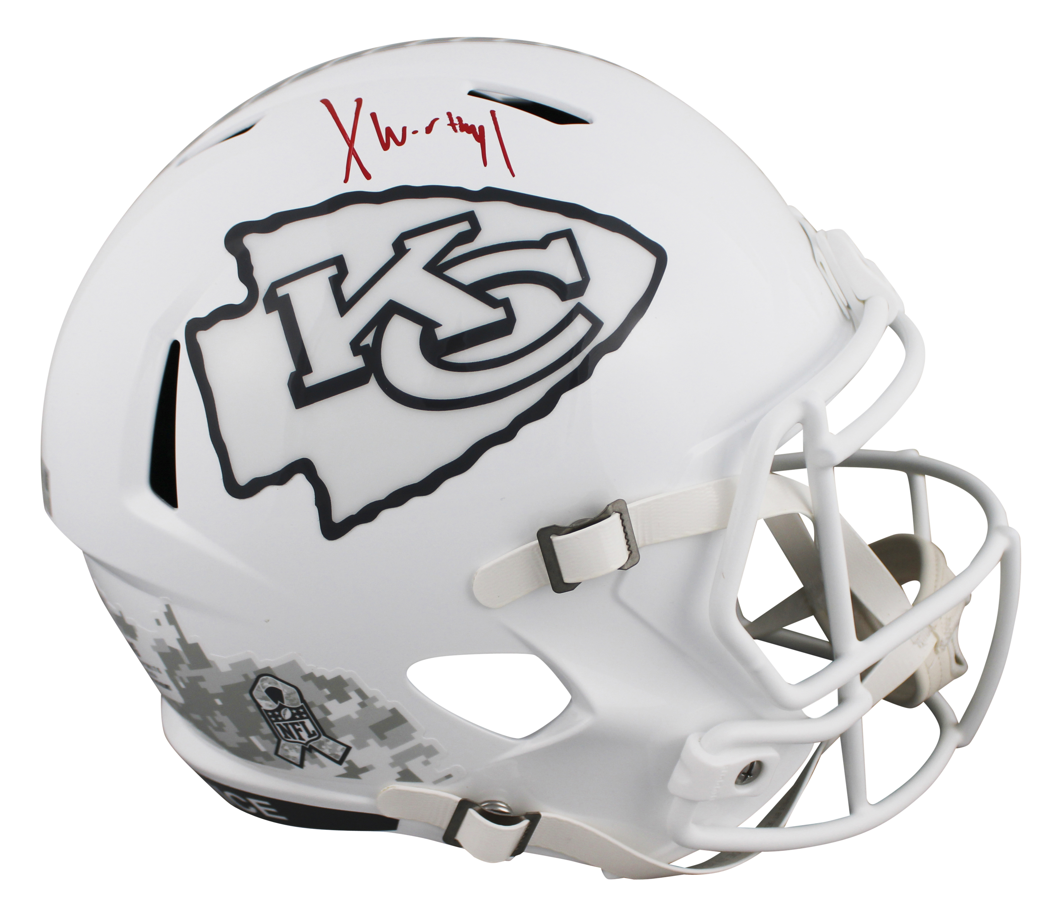 This Autographed Alternate Salute To Service III Riddell Full Size Speed Rep Helmet has been Personally Signed by Xavier Worthy of the Kansas City Chiefs. This item is 100% Authentic to includes a numbered hologram by Fanatics. We conducted an autograph signing with Xavier Worthy where multiples of the same item were signed. While the photographs are representative of this item, the size, placement and strength of the signature may vary. Each item is hand signed, therefore, each autograph is unique. This item can be verified through Fanatics.
