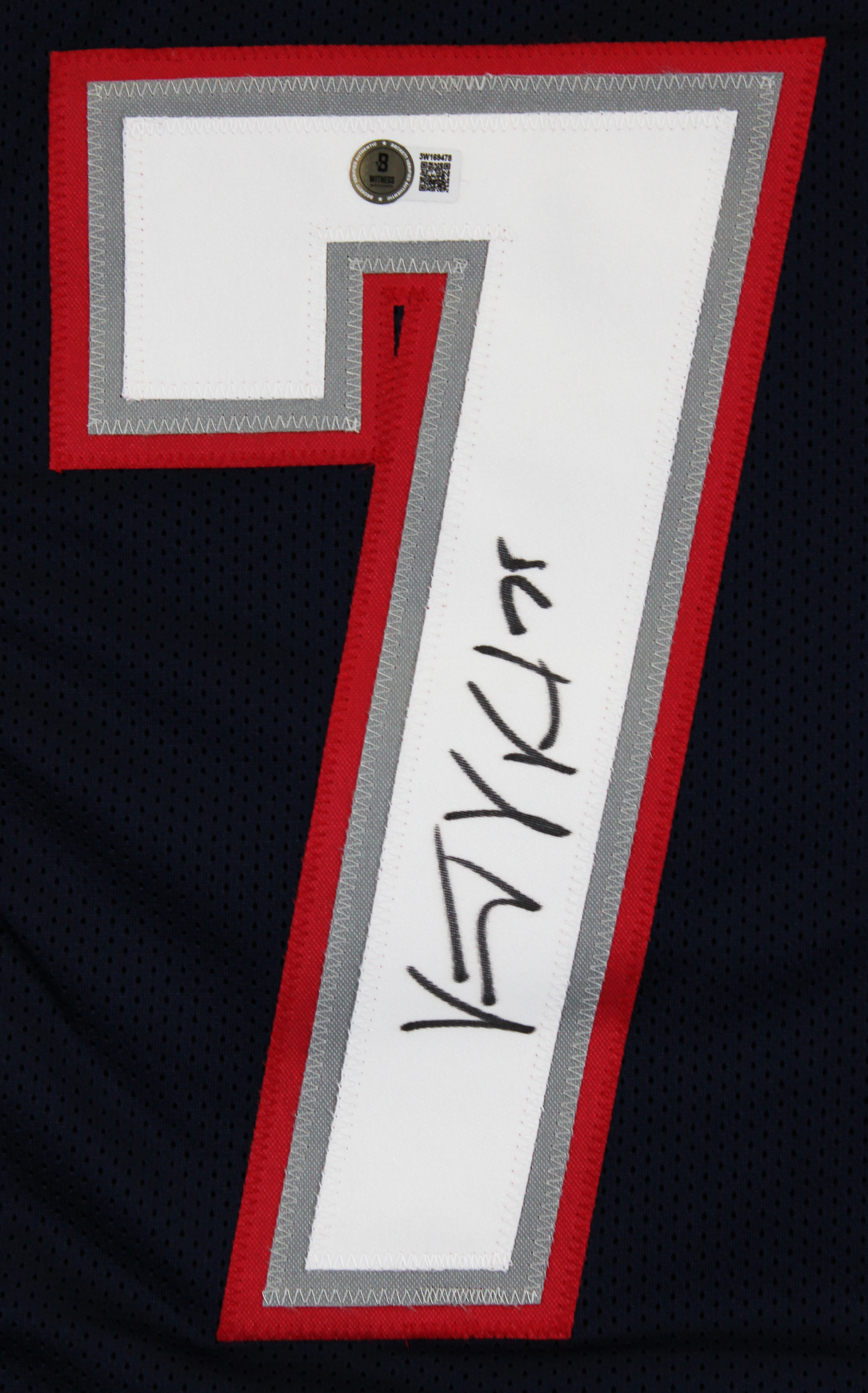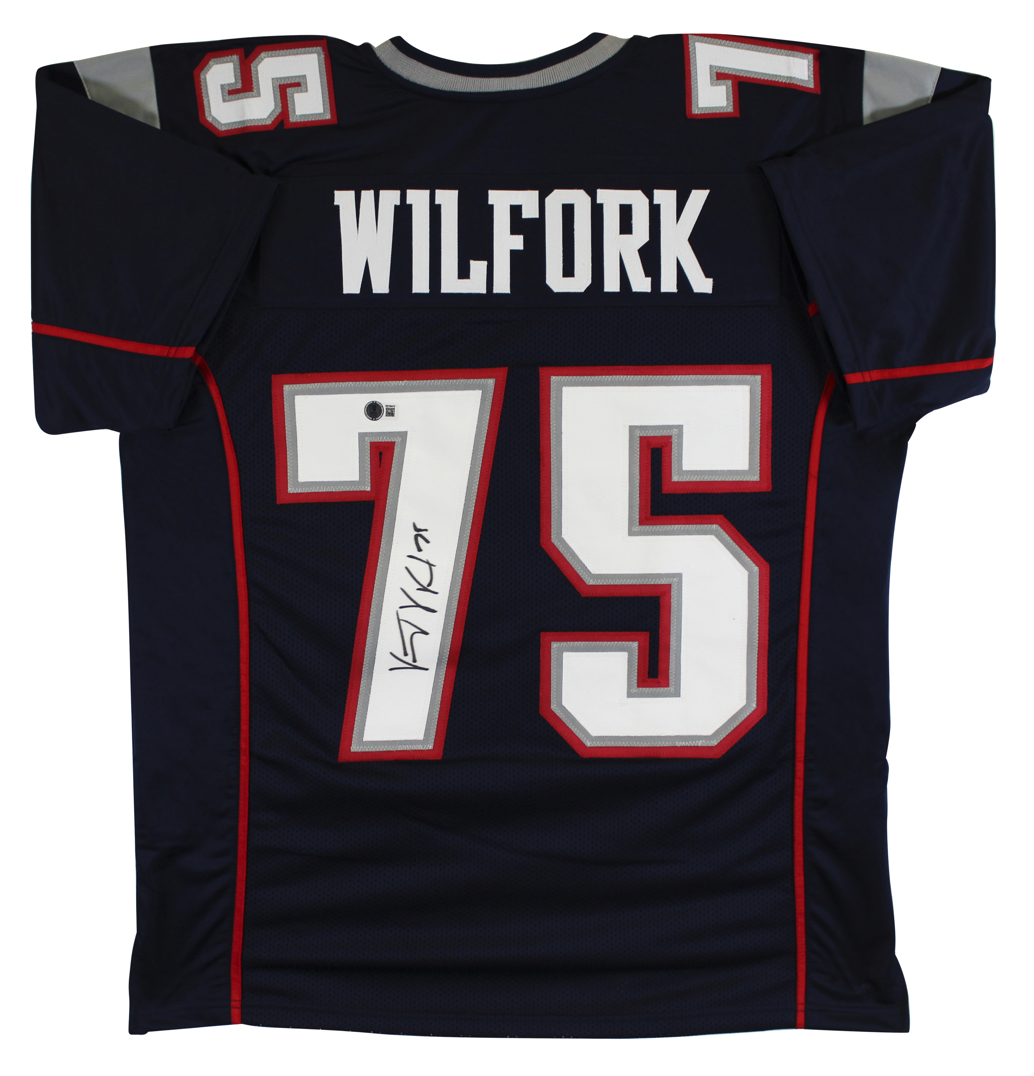 This Autographed Navy Pro Style Jersey has been Personally Signed by Vince Wilfork of the New England Patriots. This item is 100% Authentic to include a hologram by Beckett Authentication Services. This item will come with an affixed Beckett Authentication Services (BAS) authentication sticker, which includes a scannable QR code to verify authenticity. Please note that Beckett no longer provides serial-numbered COA cards, and the attached BAS sticker will serve as the complete authentication for this item. This is a BAS Witnessed Protection Program item which means a Beckett Authentication Service representative was present when this item was being signed. We conducted an autograph signing with Vince Wilfork where multiples of the same item were signed. While the photographs are representative of this item, the size, placement and strength of the signature may vary. Each item is hand signed, therefore, each autograph is unique. This item can be verified through BAS Witnessed. This is a X-Large sized, non-branded, custom-stitched Jersey.