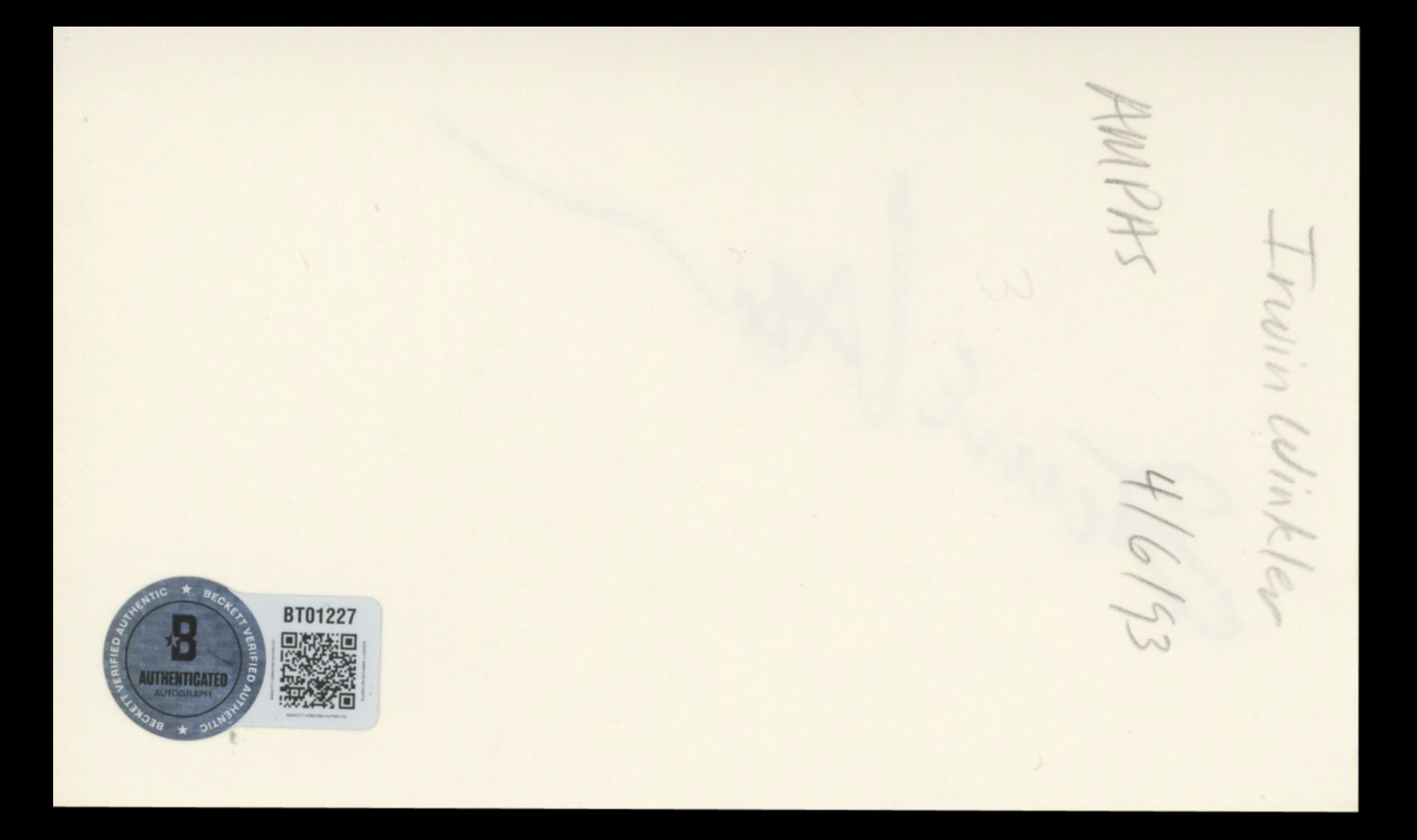 This Autographed 3x5 Index Card has been Personally Signed by Irwin Winkler of Double Trouble. This item is 100% Authentic to include a hologram by Beckett Authentication Services. This item will come with an affixed Beckett Authentication Services (BAS) authentication sticker, which includes a scannable QR code to verify authenticity. Please note that Beckett no longer provides serial-numbered COA cards, and the attached BAS sticker will serve as the complete authentication for this item. The authenticity can be verified on Beckett Authentication Services website.