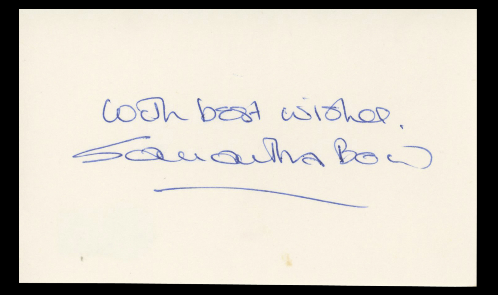 This Autographed 3x5 Index Card with the inscription of "With best wishes" has been Personally Signed by Samantha Bond of James Bond. This item is 100% Authentic to include a hologram by Beckett Authentication Services. This item will come with an affixed Beckett Authentication Services (BAS) authentication sticker, which includes a scannable QR code to verify authenticity. Please note that Beckett no longer provides serial-numbered COA cards, and the attached BAS sticker will serve as the complete authentication for this item. The authenticity can be verified on Beckett Authentication Services website.