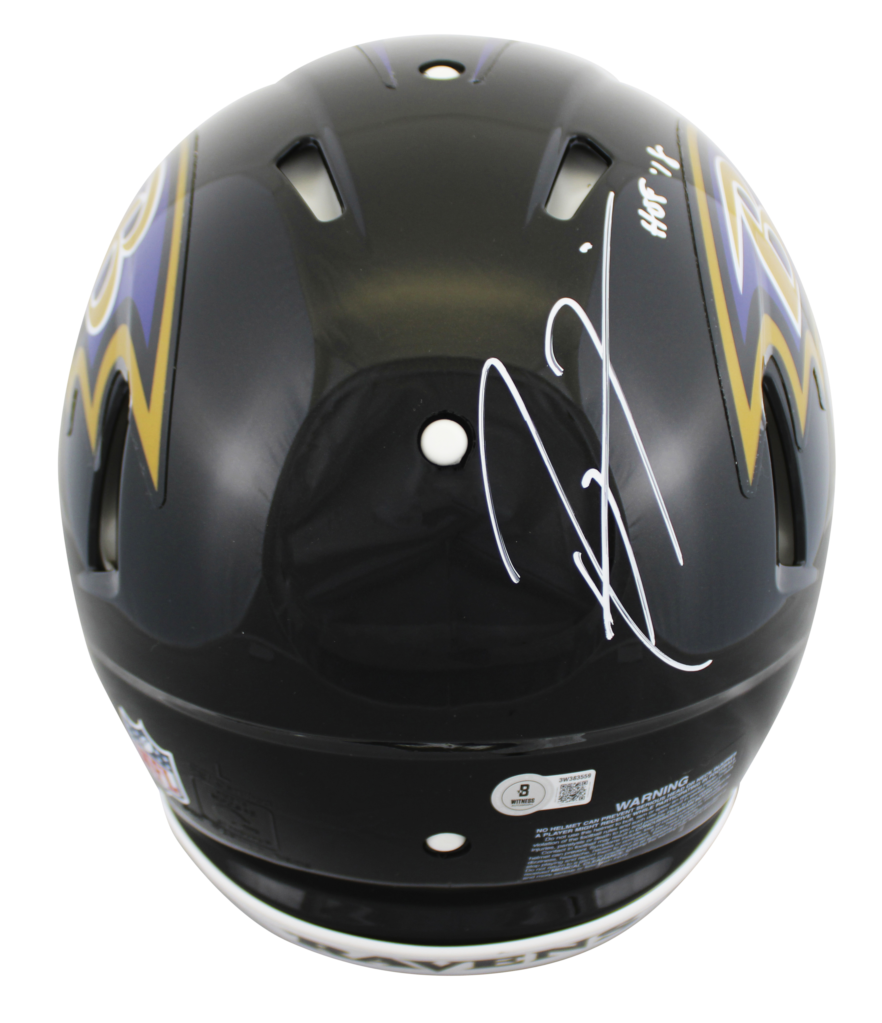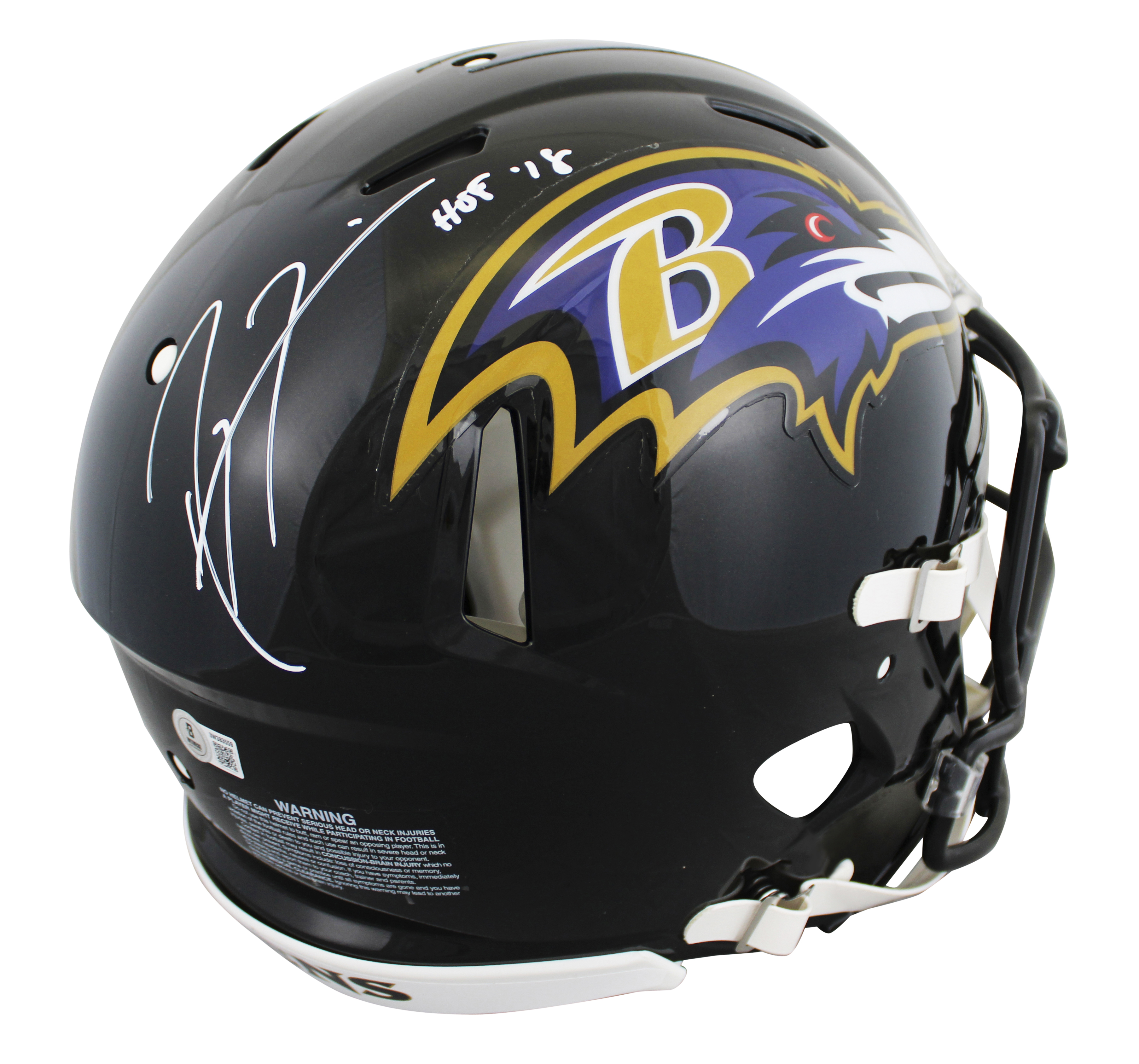 This Autographed Authentic Full Size Speed Proline Helmet with the inscription of "HOF 18" has been Personally Signed by Ray Lewis of the Baltimore Ravens. This item is 100% Authentic to include a hologram by Beckett Authentication Services. This item will come with an affixed Beckett Authentication Services (BAS) authentication sticker, which includes a scannable QR code to verify authenticity. Please note that Beckett no longer provides serial-numbered COA cards, and the attached BAS sticker will serve as the complete authentication for this item. This is a BAS Witnessed Protection Program item which means a Beckett Authentication Service representative was present when this item was being signed. We conducted an autograph signing with Ray Lewis where multiples of the same item were signed. While the photographs are representative of this item, the size, placement and strength of the signature may vary. Each item is hand signed, therefore, each autograph is unique. This item can be verified through BAS Witnessed.