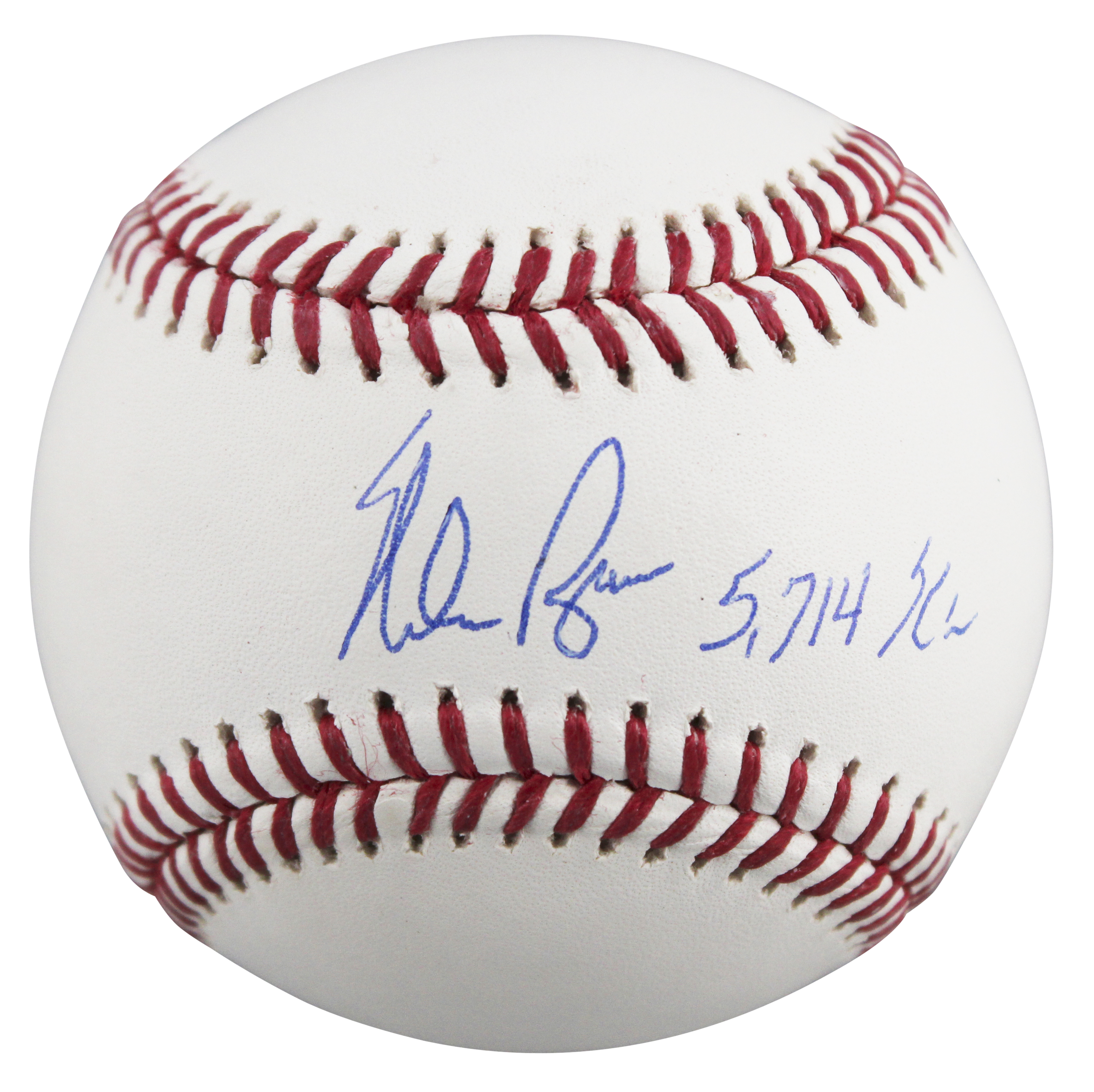 This Autographed Robert Manfred Oml Baseball with the inscription of "5714 K's" has been Personally Signed by Nolan Ryan of the Texas Rangers. This item is 100% Authentic to include a hologram by Beckett Authentication Services. This item will come with an affixed Beckett Authentication Services (BAS) authentication sticker, which includes a scannable QR code to verify authenticity. Please note that Beckett no longer provides serial-numbered COA cards, and the attached BAS sticker will serve as the complete authentication for this item. We have multiples of this same item. While the photographs are representative of this item, the size, placement and strength of the signature may vary. Each item is hand signed, therefore, each autograph is unique.