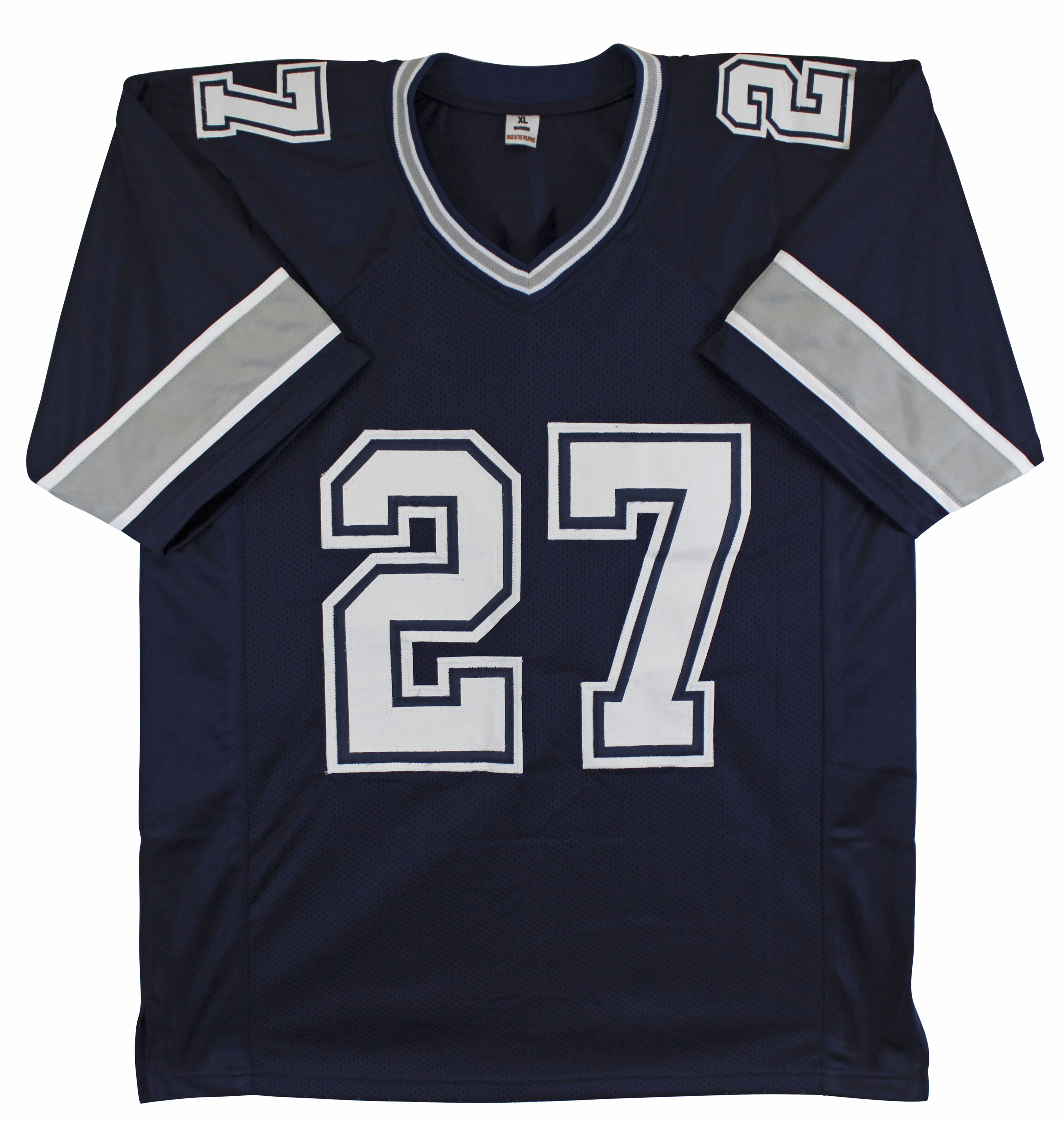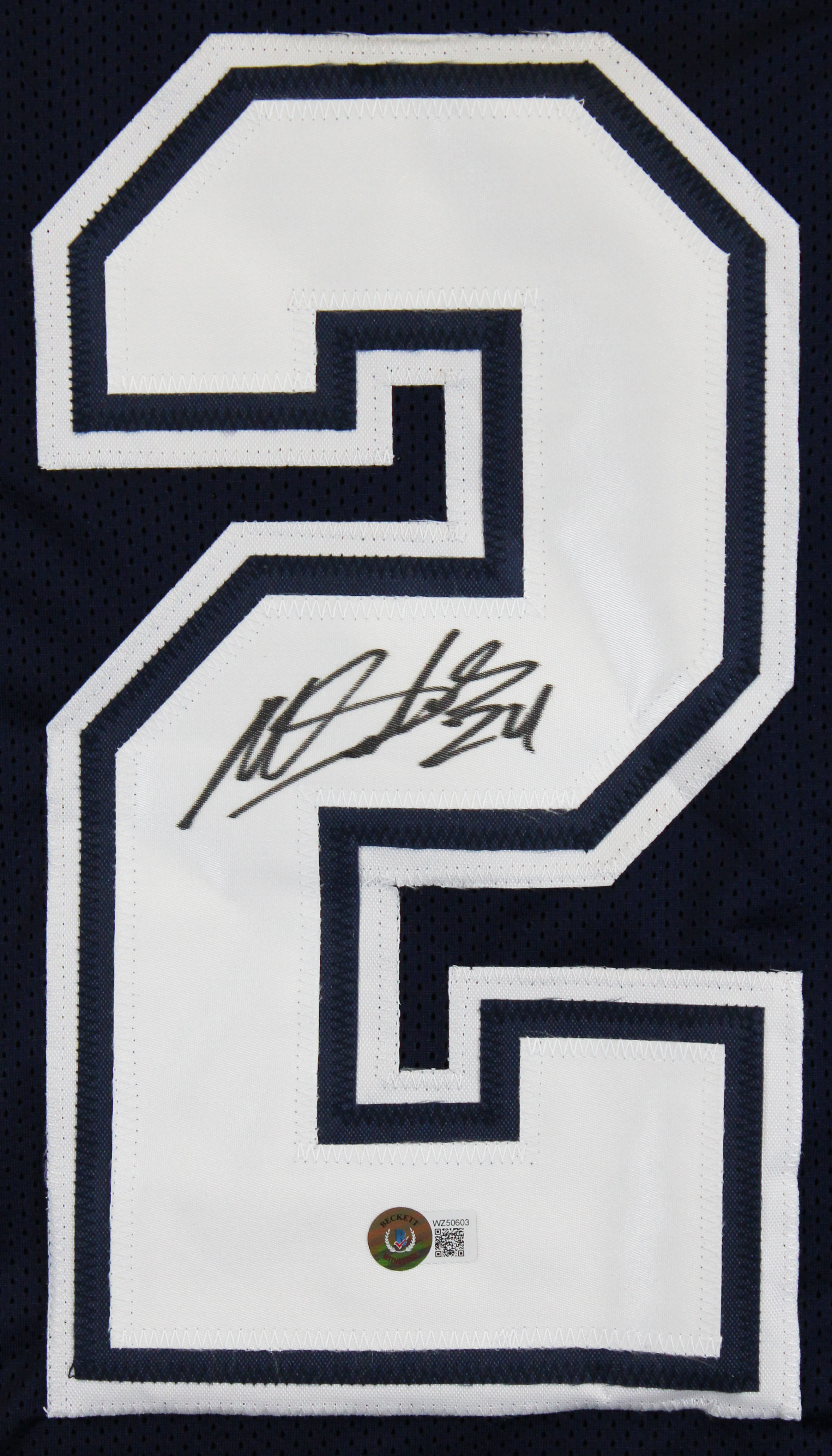This Autographed Navy Pro Style Jersey has been Personally Signed by Miles Sanders of the Dallas Cowboys. This item is 100% Authentic to include a hologram by Beckett Authentication Services. This item will come with an affixed Beckett Authentication Services (BAS) authentication sticker, which includes a scannable QR code to verify authenticity. Please note that Beckett no longer provides serial-numbered COA cards, and the attached BAS sticker will serve as the complete authentication for this item. This is a BAS Witnessed Protection Program item which means a Beckett Authentication Service representative was present when this item was being signed. We conducted an autograph signing with Miles Sanders where multiples of the same item were signed. While the photographs are representative of this item, the size, placement and strength of the signature may vary. Each item is hand signed, therefore, each autograph is unique. This item can be verified through BAS Witnessed. This is a X-Large sized, non-branded, custom-stitched Jersey.