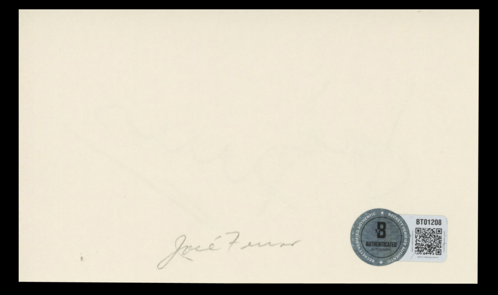 This Autographed 3x5 Index Card has been Personally Signed by Jose Ferrer of Cyrano de Bergerac. This item is 100% Authentic to include a hologram by Beckett Authentication Services. This item will come with an affixed Beckett Authentication Services (BAS) authentication sticker, which includes a scannable QR code to verify authenticity. Please note that Beckett no longer provides serial-numbered COA cards, and the attached BAS sticker will serve as the complete authentication for this item. The authenticity can be verified on Beckett Authentication Services website.
