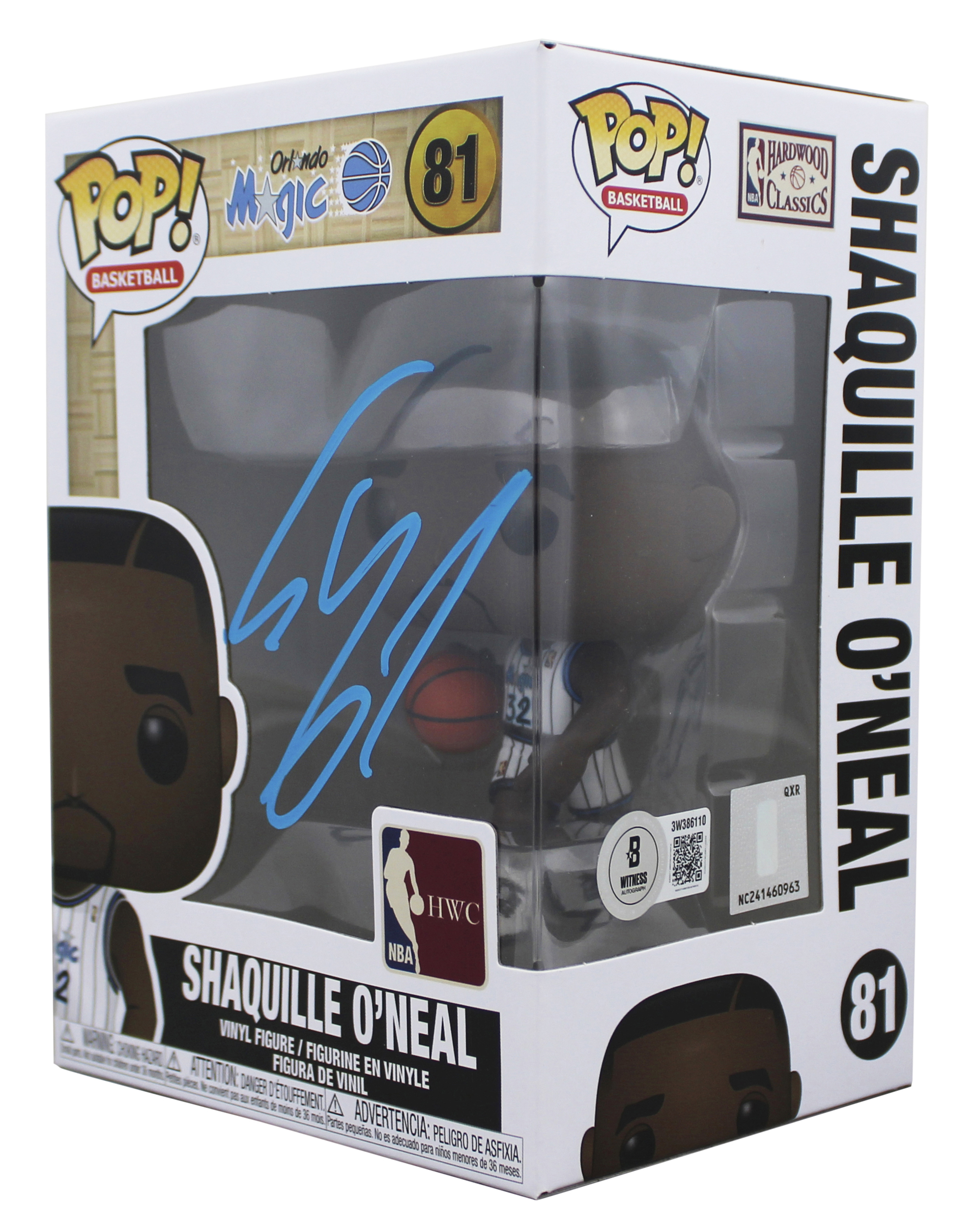 This Autographed w/ Blue Signature NBA Hardwood Classic #81 Funko Pop Vinyl Figure has been Personally Signed by Shaquille O'Neal of the Orlando Magic. This item is 100% Authentic to include a hologram by Beckett Authentication Services. This item will come with an affixed Beckett Authentication Services (BAS) authentication sticker, which includes a scannable QR code to verify authenticity. Please note that Beckett no longer provides serial-numbered COA cards, and the attached BAS sticker will serve as the complete authentication for this item. This is a BAS Witnessed Protection Program item which means a Beckett Authentication Service representative was present when this item was being signed. We conducted an autograph signing with Shaquille O'Neal where multiples of the same item were signed. While the photographs are representative of this item, the size, placement and strength of the signature may vary. Each item is hand signed, therefore, each autograph is unique. This item can be verified through BAS Witnessed. This item will ship in a Pop! Protector, please refer to the photos for condition of the item prior to purchase, these are in good condition but would not be considered mint.