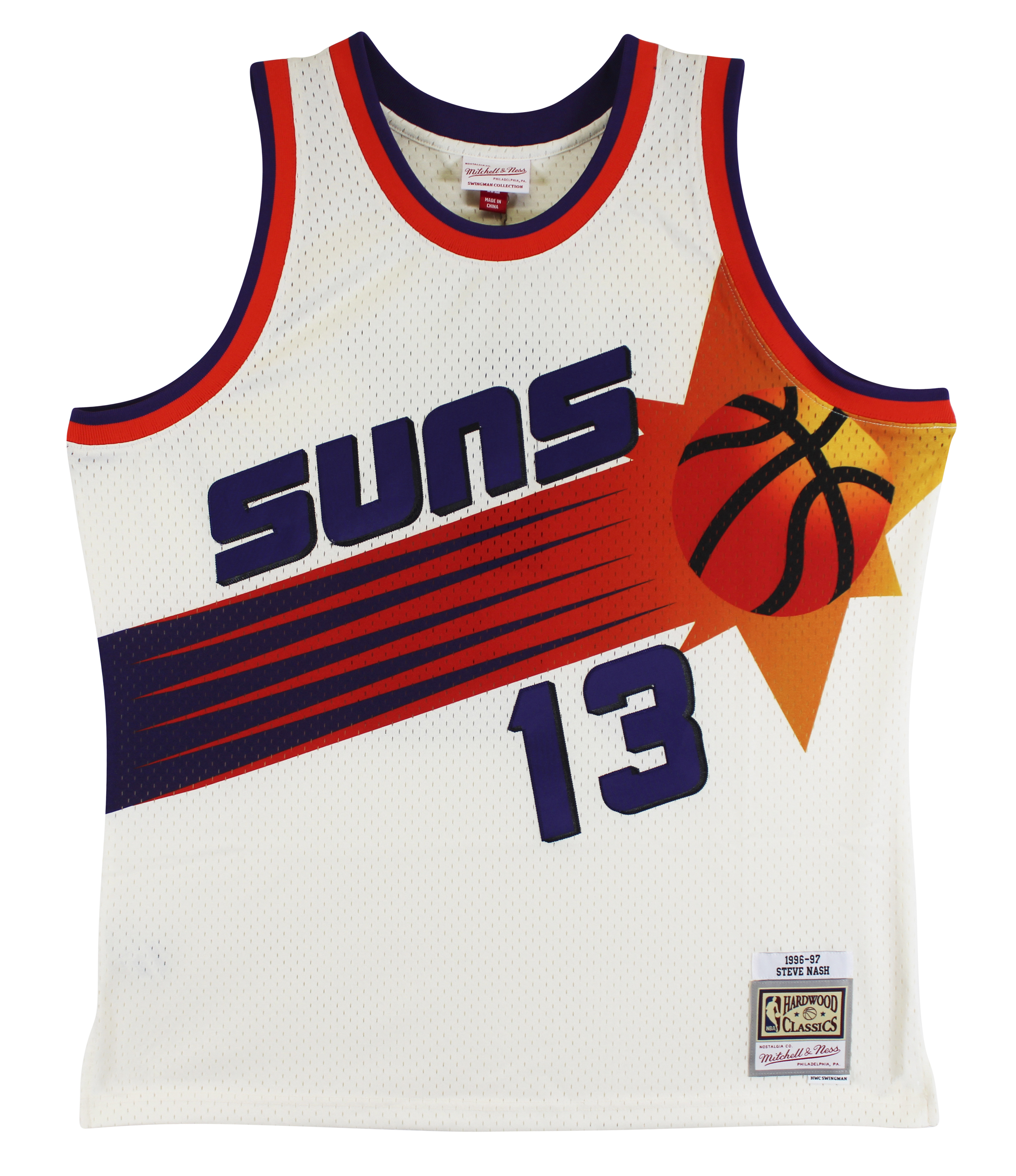 This Autographed Cream Mitchell & Ness 1996-97 Hardwood Classics Swingman Jersey has been Personally Signed by Steve Nash of the Phoenix Suns. This item is 100% Authentic to include a hologram by Beckett Authentication Services. This item will come with an affixed Beckett Authentication Services (BAS) authentication sticker, which includes a scannable QR code to verify authenticity. Please note that Beckett no longer provides serial-numbered COA cards, and the attached BAS sticker will serve as the complete authentication for this item. This is a BAS Witnessed Protection Program item which means a Beckett Authentication Service representative was present when this item was being signed. We conducted an autograph signing with Steve Nash where multiples of the same item were signed. While the photographs are representative of this item, the size, placement and strength of the signature may vary. Each item is hand signed, therefore, each autograph is unique. This item can be verified through BAS Witnessed. This is a X-Large sized Jersey.