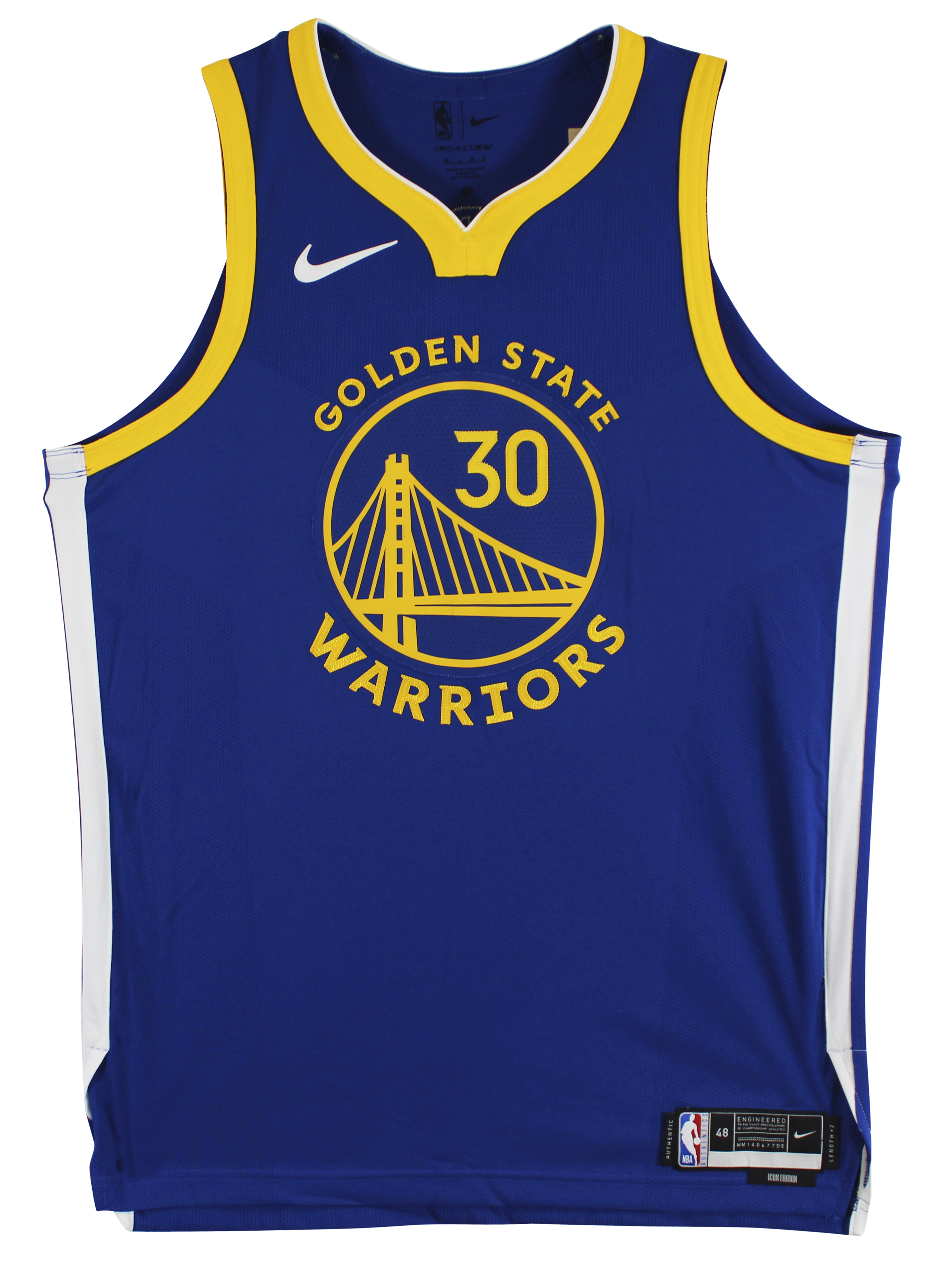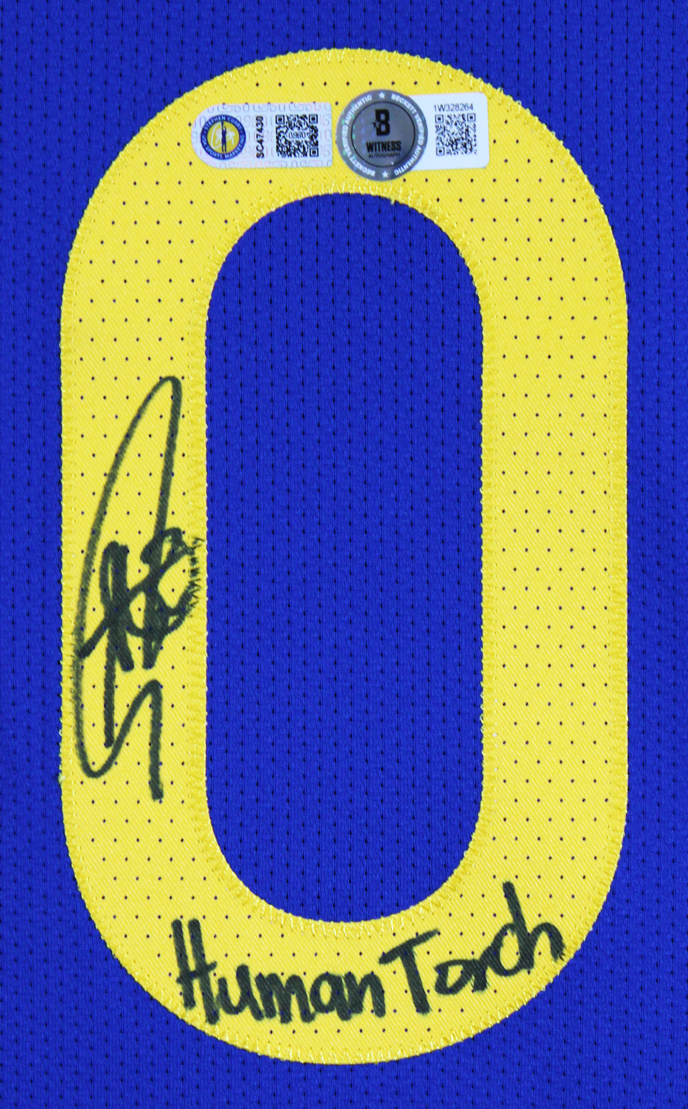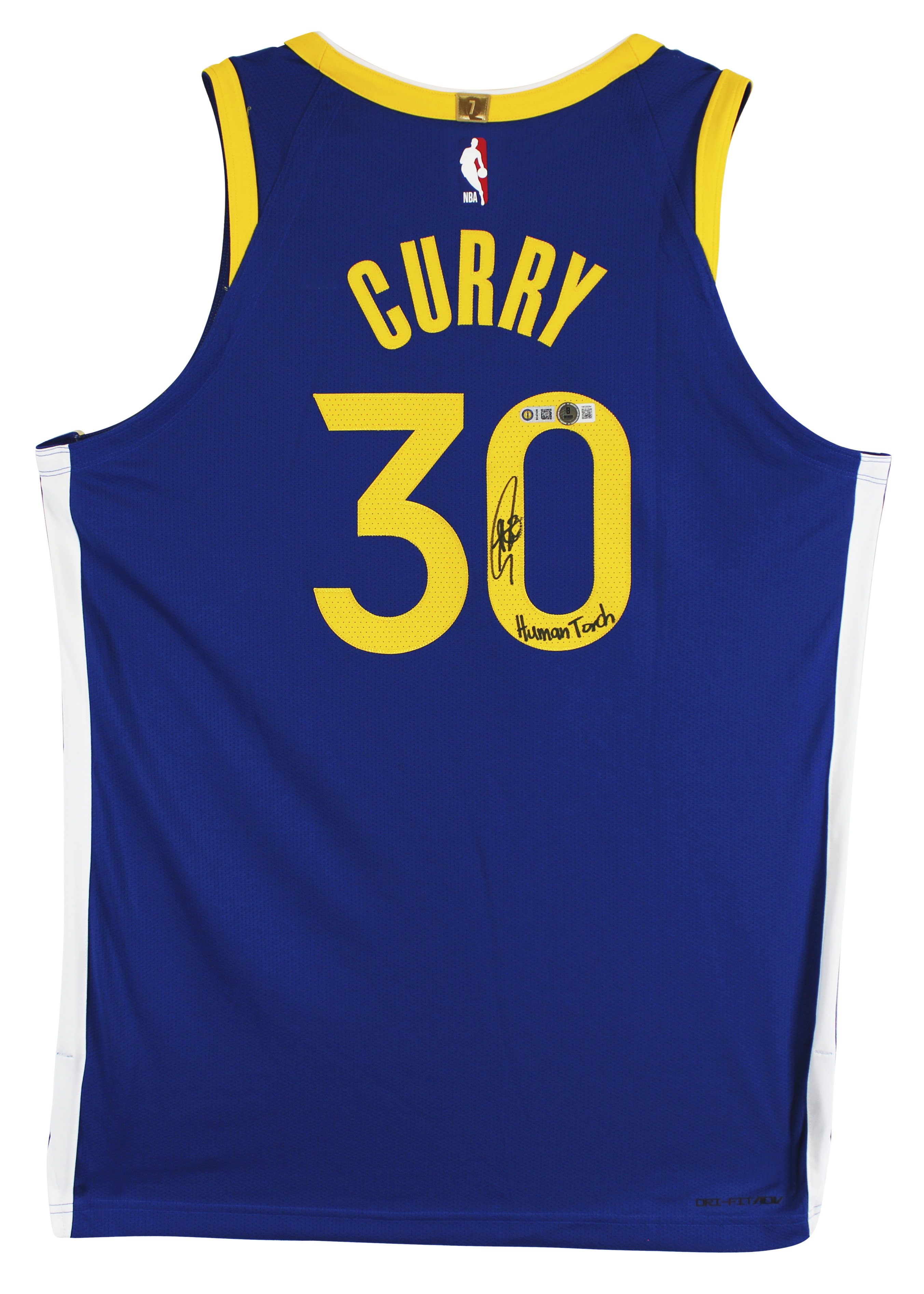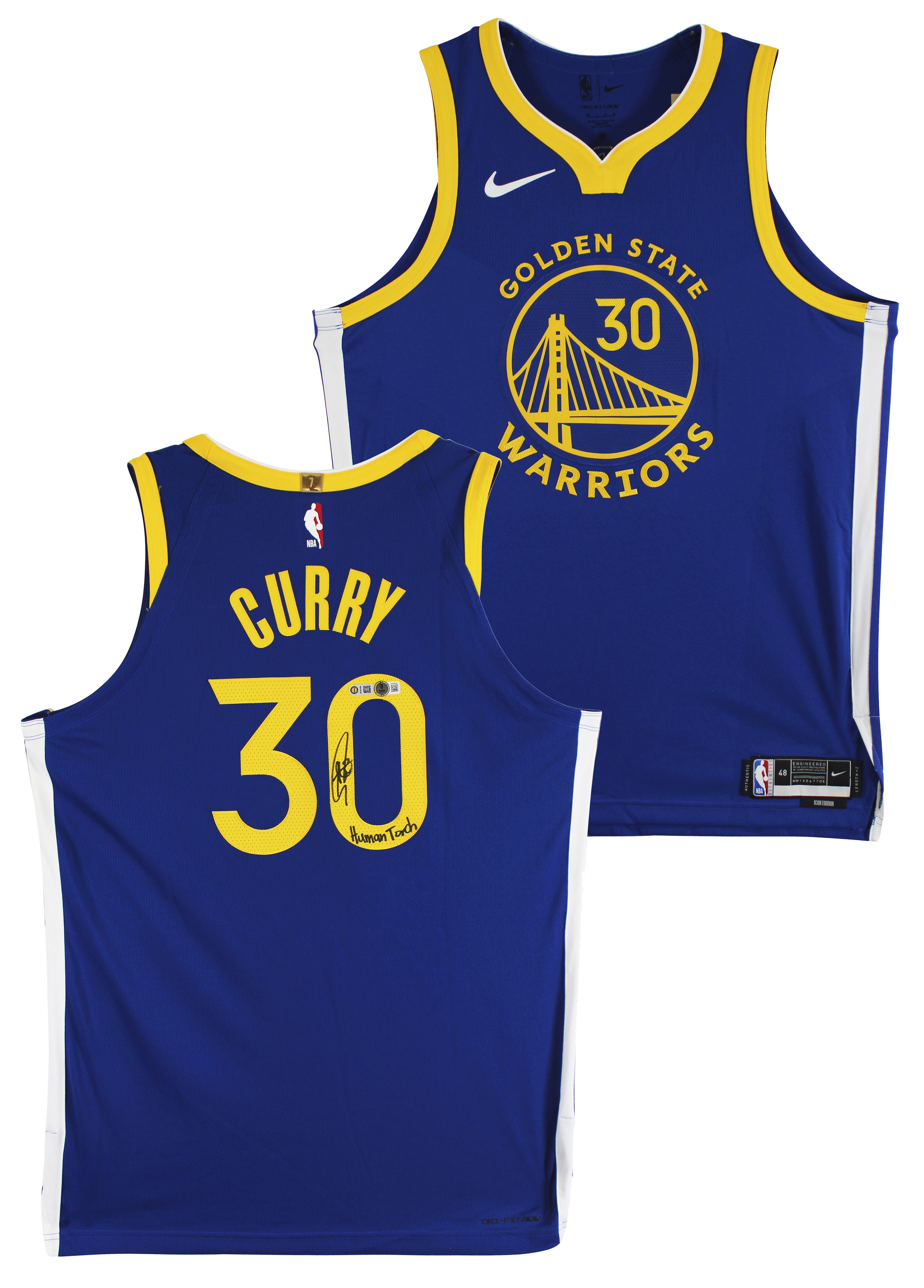 This Autographed Blue Nike Icon Edition Authentic Jersey with the inscription of "Human Torch" has been Personally Signed by Stephen Curry of the Golden State Warriors. This item is 100% Authentic to include a hologram by Beckett Authentication Services. This item will come with an affixed Beckett Authentication Services (BAS) authentication sticker, which includes a scannable QR code to verify authenticity. Please note that Beckett no longer provides serial-numbered COA cards, and the attached BAS sticker will serve as the complete authentication for this item. This is a BAS Witnessed Protection Program item which means a Beckett Authentication Service representative was present when this item was being signed. We have multiples of this same item. While the photographs are representative of this item, the size, placement and strength of the signature may vary. Each item is hand signed, therefore, each autograph is unique. Multiple sizes available. Reach out for availability.