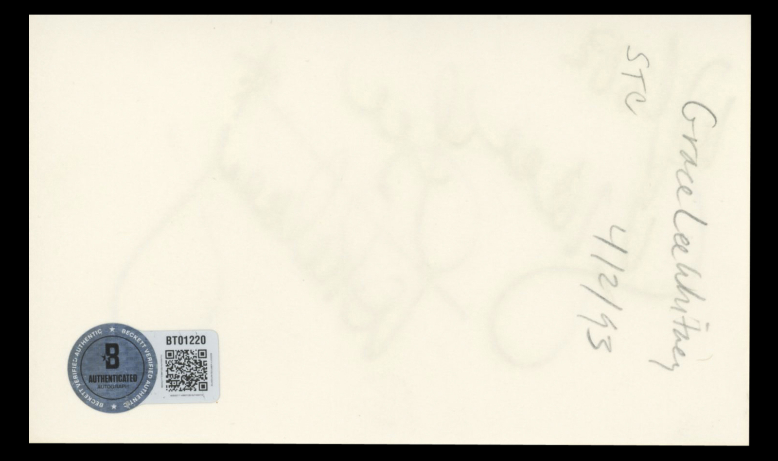 This Autographed 3x5 Index Card has been Personally Signed by Grace Lee Whitney of Star Trek. This item is 100% Authentic to include a hologram by Beckett Authentication Services. This item will come with an affixed Beckett Authentication Services (BAS) authentication sticker, which includes a scannable QR code to verify authenticity. Please note that Beckett no longer provides serial-numbered COA cards, and the attached BAS sticker will serve as the complete authentication for this item. The authenticity can be verified on Beckett Authentication Services website.