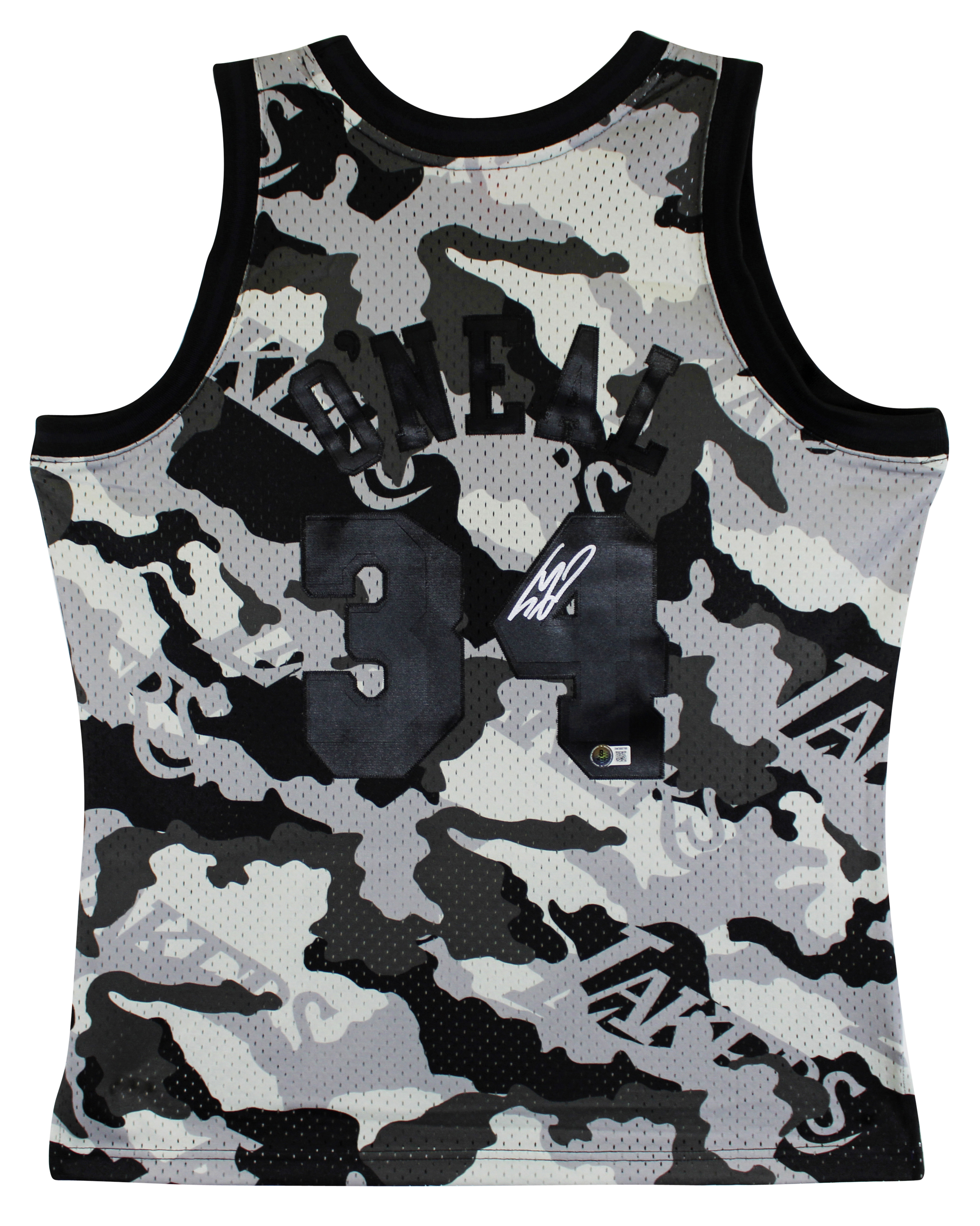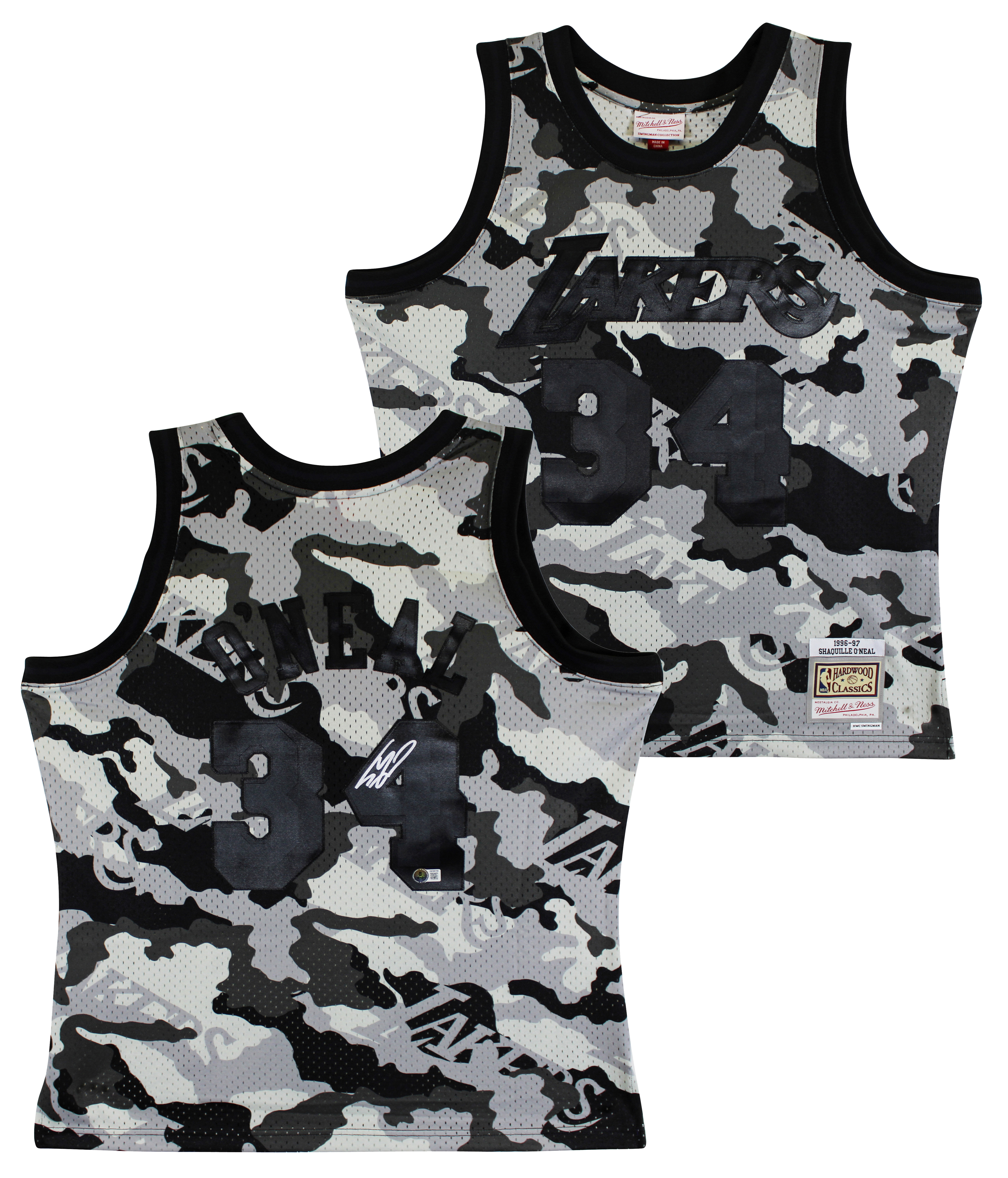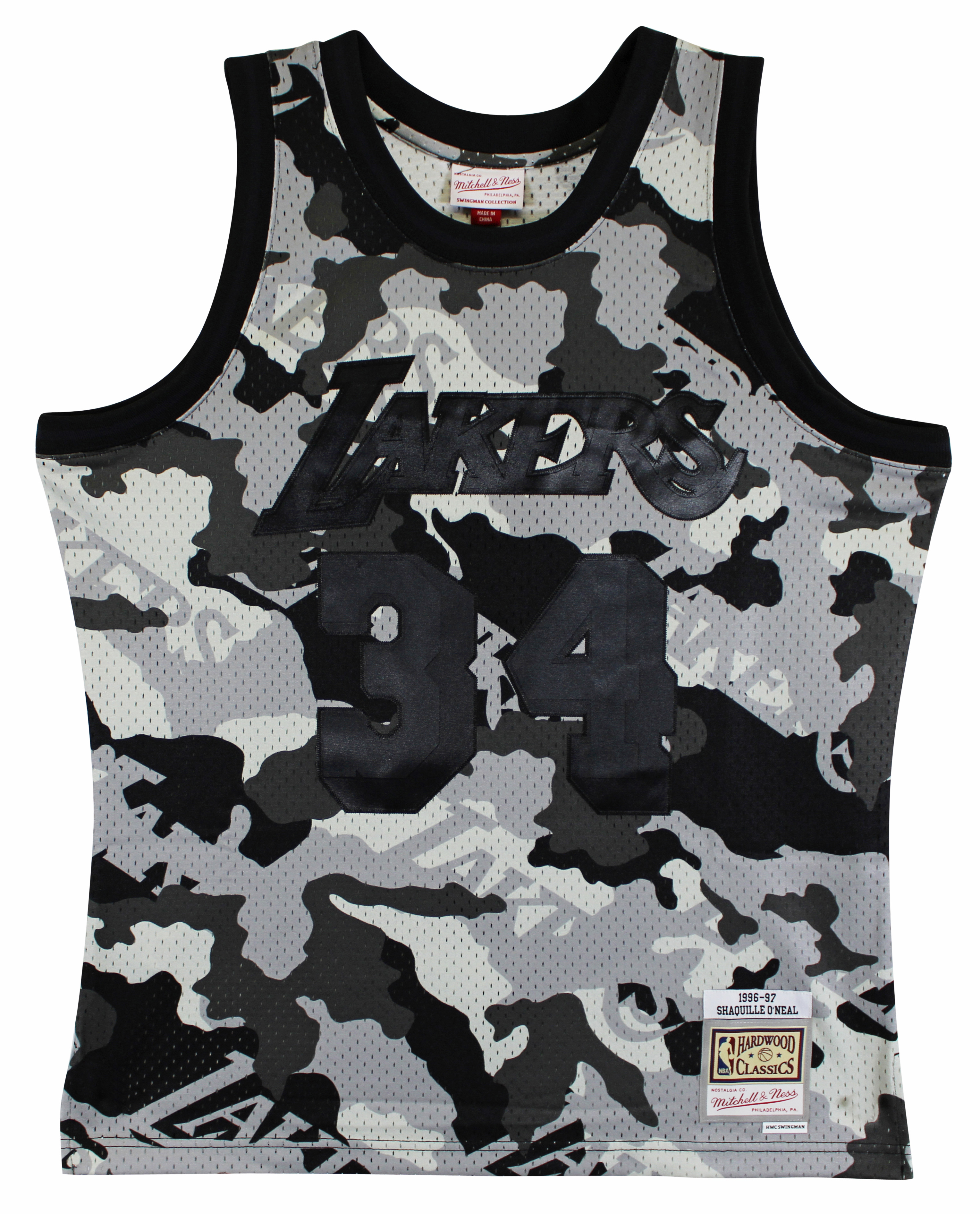 This Autographed Black Camouflage Mitchell & Ness 1996-97 Hardwood Classics Swingman Jersey has been Personally Signed by Shaquille O'Neal of the Los Angeles Lakers. This item is 100% Authentic to include a hologram by Beckett Authentication Services. This item will come with an affixed Beckett Authentication Services (BAS) authentication sticker, which includes a scannable QR code to verify authenticity. Please note that Beckett no longer provides serial-numbered COA cards, and the attached BAS sticker will serve as the complete authentication for this item. This is a BAS Witnessed Protection Program item which means a Beckett Authentication Service representative was present when this item was being signed. We conducted an autograph signing with Shaquille O'Neal where multiples of the same item were signed. While the photographs are representative of this item, the size, placement and strength of the signature may vary. Each item is hand signed, therefore, each autograph is unique. This item can be verified through BAS Witnessed. This is a X-Large sized Jersey.
