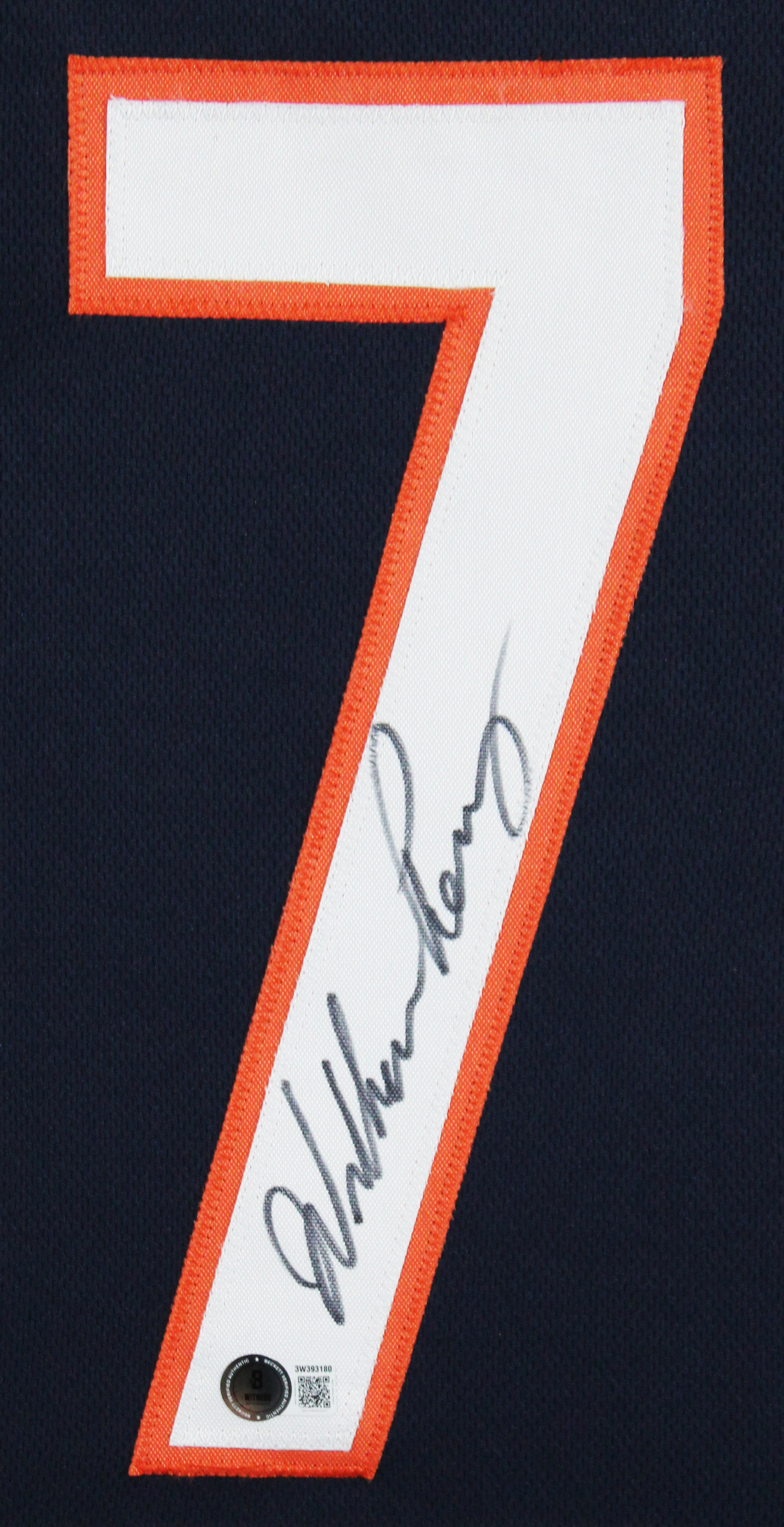 This Autographed Navy Pro Style Framed Jersey has been Personally Signed by William Perry of the Chicago Bears. This item is 100% Authentic to include a hologram by Beckett Authentication Services. This item will come with an affixed Beckett Authentication Services (BAS) authentication sticker, which includes a scannable QR code to verify authenticity. Please note that Beckett no longer provides serial-numbered COA cards, and the attached BAS sticker will serve as the complete authentication for this item. This is a BAS Witnessed Protection Program item which means a Beckett Authentication Service representative was present when this item was being signed. We conducted an autograph signing with William Perry where multiples of the same item were signed. While the photographs are representative of this item, the size, placement and strength of the signature may vary. Each item is hand signed, therefore, each autograph is unique. This item can be verified through BAS Witnessed. This item has been professionally framed to overall dimensions of approximately 32 x 37 inches. This is a X-Large sized, non-branded, custom-stitched Framed Jersey. This jersey will be framed to order, it will take approximately 3-4 business days from purchase date for it to ship.