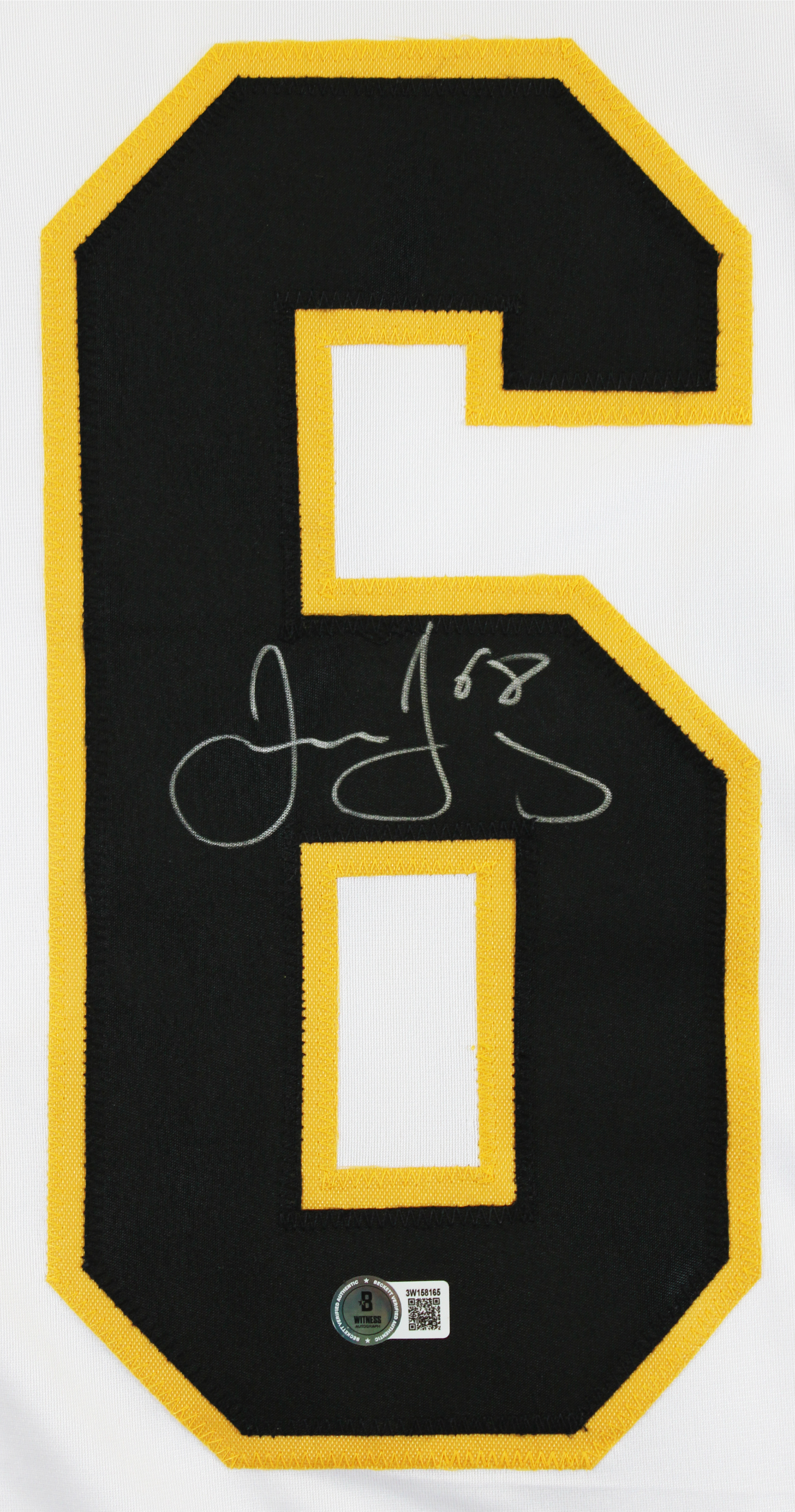 This Autographed White Pro Style Jersey has been Personally Signed by Jaromir Jagr of the Pittsburgh Peguins. This item is 100% Authentic to include a hologram by Beckett Authentication Services. This item will come with an affixed Beckett Authentication Services (BAS) authentication sticker, which includes a scannable QR code to verify authenticity. Please note that Beckett no longer provides serial-numbered COA cards, and the attached BAS sticker will serve as the complete authentication for this item. This is a BAS Witnessed Protection Program item which means a Beckett Authentication Service representative was present when this item was being signed. We conducted an autograph signing with Jaromir Jagr where multiples of the same item were signed. While the photographs are representative of this item, the size, placement and strength of the signature may vary. Each item is hand signed, therefore, each autograph is unique. This item can be verified through BAS Witnessed. This is a X-Large sized, non-branded, custom-stitched Jersey.